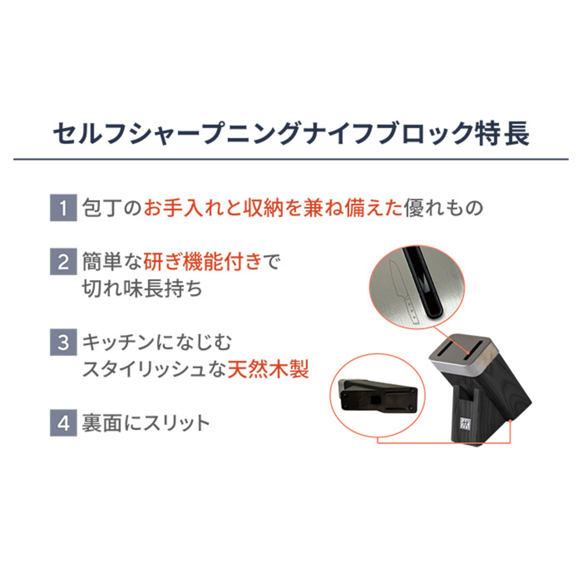 ツヴィリング のナイフブロックは、昨年に引き続き2回目の購入。 とても気に入ってます。切れ味もバツグンですし、手に馴染んで持っていてフィットしてくれます。 使った後にシャープナーに入れ、次に使うときにはまたよく切れるのに感動です。 料理が楽しくなります。