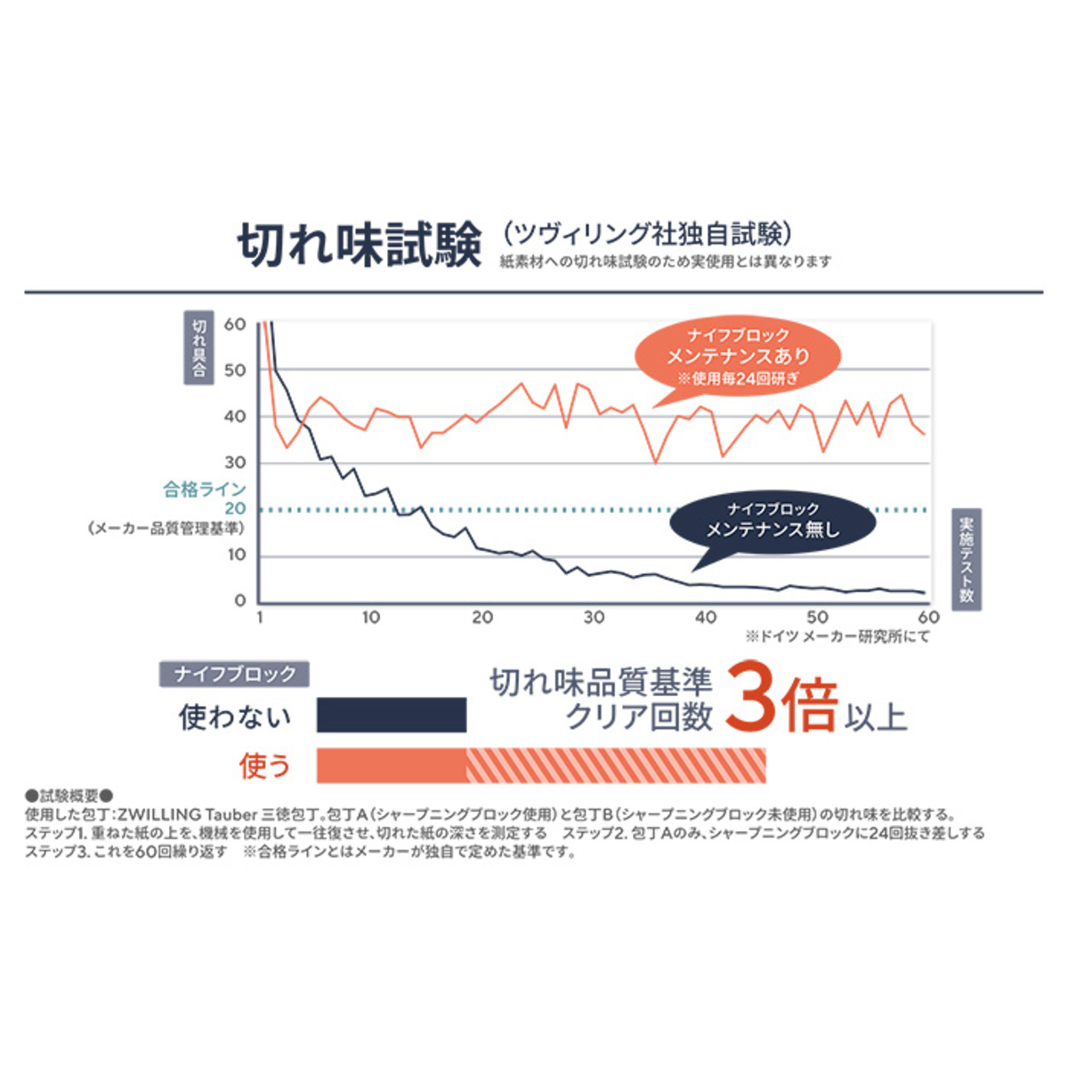 *2)このナイフブロックは、研ぎ直しを目的にしたものではありません。刃先のメンテナンスとしてご使用ください。研ぎ直しが必要になった際には、砥石もしくはシャープナーで研ぎ直してください