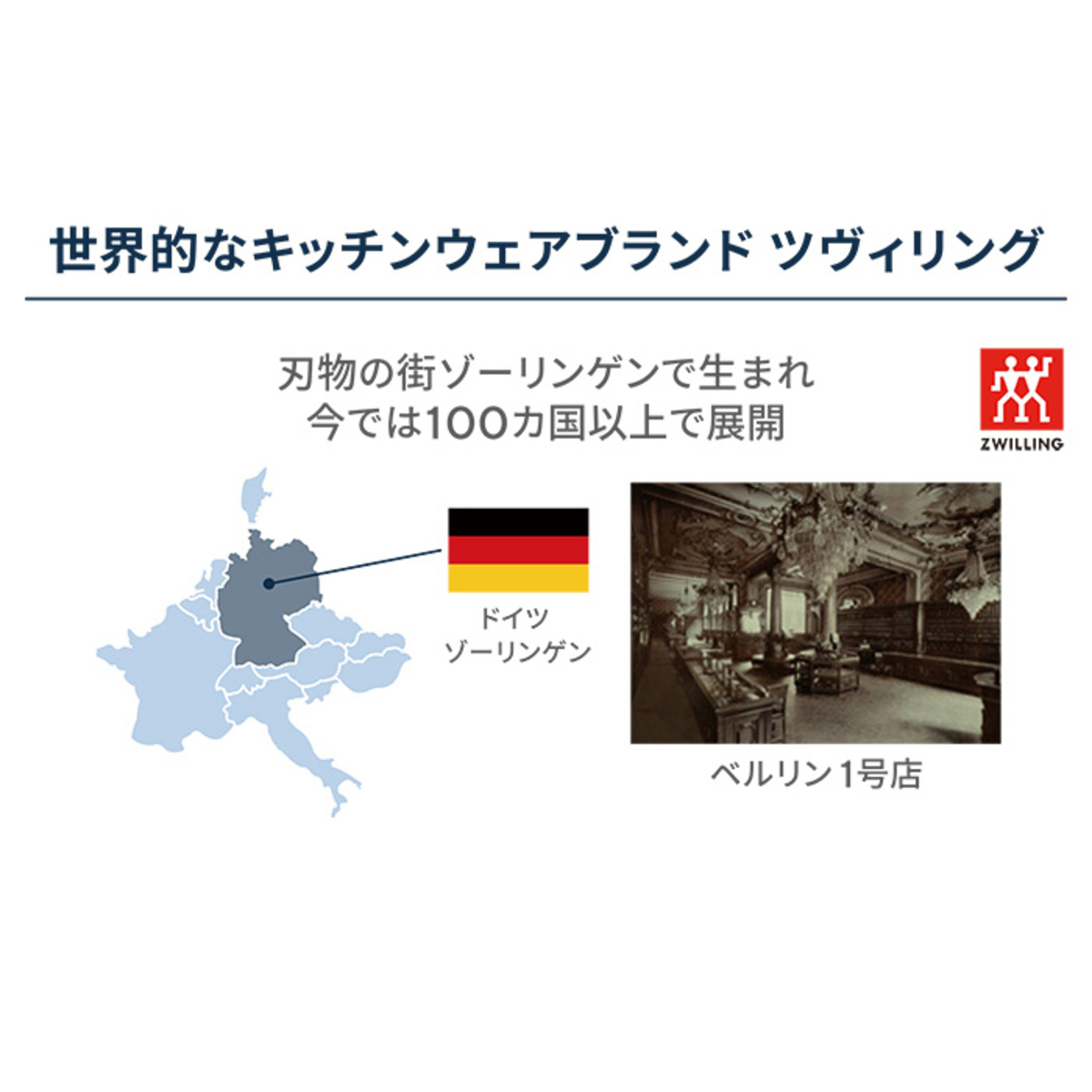 ブレードには、ツヴィリングの厳選した特殊ステンレス鋼を使用。フリオデュア(特殊冷硬焼き入れ)という独自の焼入れ処理により、フリオデュアを施していない包丁と比較すると包丁の硬度、耐腐食、切れ味の持続力が向上します