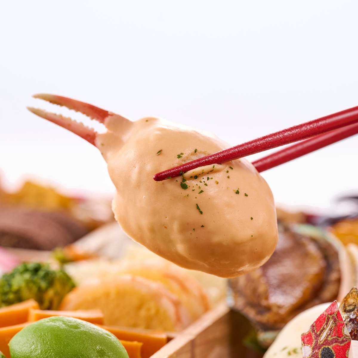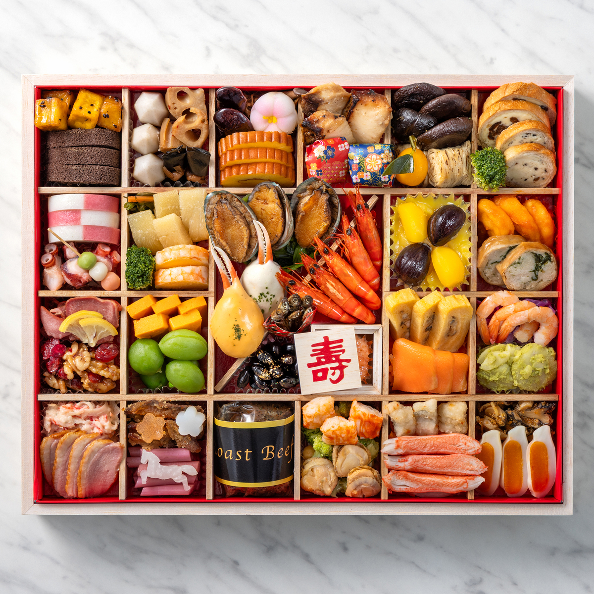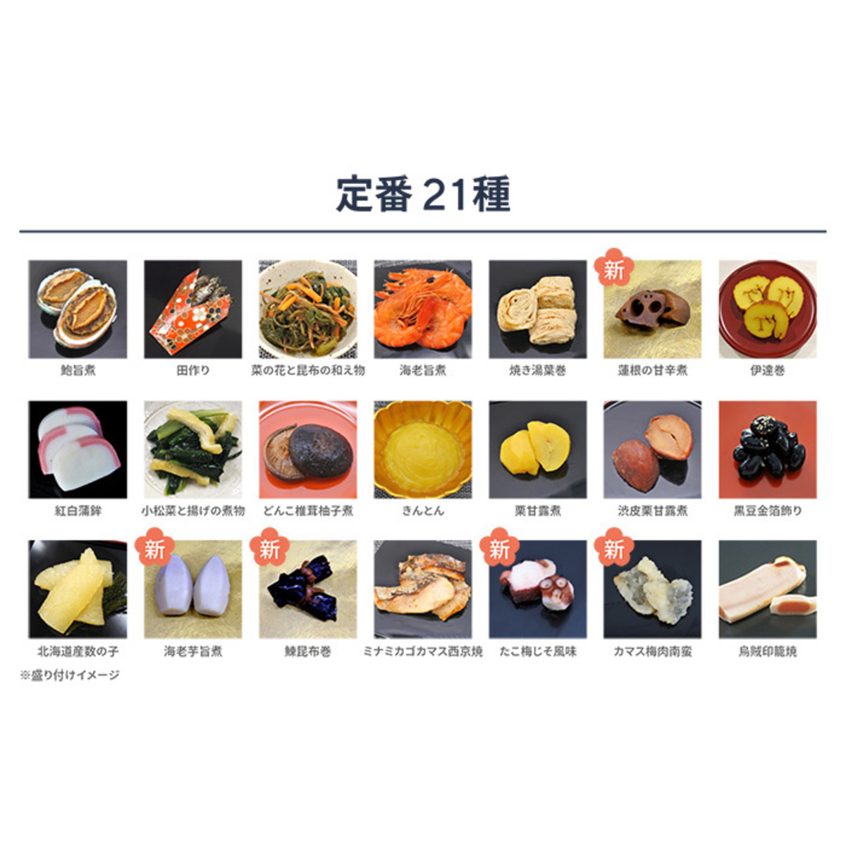 [アレルギー物質特定原材料8品目] 卵、小麦、乳、えび、かに、くるみ ※大学芋柚子風味と伊達巻にははちみつを含む商品です。1歳未満の乳児には与えないでください。 [商品内容] 64品目(一段重・盛り付け済み) [賞味期限] 2026.1.31 [お重サイズ] 41.3×33×7.4cm [保存方法] 開封前:冷凍(ー18℃以下で保存してください) 開封後:解凍後は冷蔵庫に保存下さい ※一度解凍したおせち料理は再び凍らせますと品質が変わりますので、再冷凍はお避け下さい [解凍方法] 1.ケースより取り出してください 2.冷蔵庫(5℃〜10℃)または冷暗所で、上に物を乗せないようにして置いてください ※解凍時間の目安:約24時間で解凍できます。解凍時間は場所や温度により差がありますので、お召し上がり予定の2〜3時間前に解凍状態を確認してください [原産国] 日本 [原材料] 22.菜の花と昆布の和え物:菜の花(中国産)、昆布、人参、砂糖他 23.北海道産数の子:数の子(国産)、還元水あめ、白しょうゆ、発酵調味料(清酒風)他 24.海老玉子チーズ風味:スクランブルエッグ(鶏卵、植物油脂、その他)(国内製造)、海老(海老、食塩)、乳等を主要原料とする食品、魚肉すり身(たら、砂糖)他 25.タンスモーク塩レモン:豚舌(アメリカ産又はカナダ産)、調味液(還元水あめ、食塩、その他)他 26.レモンシロップ漬:レモン(南アフリカ産)、砂糖 27.クランベリーくるみ:ドライクランベリー(アメリカ製造)、くるみ、還元水飴、デーツシロップ、砂糖、水飴、食塩、寒天他 28.雲丹チーズソース寄せ:魚介類加工品(卵黄、うに、その他)(国内製造)他 29.若桃甘露煮:若桃(国産)、砂糖他 30.小松菜と揚げの煮物:小松菜(国産)、油揚げ、和風調味料他 31.鮑旨煮:あわび(中国産)、みりん、鰹エキス、昆布エキス他 32.蟹爪冷製マヨネーズソース:魚肉(ベニズワイガニ(国産))、スケソウダラ(北海道)、ナガヅカ)他 33.蟹爪冷製オーロラソース:魚肉(ベニズワイガニ(国産)、スケソウダラ(北海道)、ナガヅカ)、食用植物油脂、半固体状ドレッシング他 34.海老旨煮:えび(ブラックタイガー)(タイ産)、砂糖、還元水あめ、しょうゆ、みりん、食塩他 35.田作り:かたくちいわし(国産)、砂糖、水飴、醤油、たん白加水分解物、寒天他 36.黒豆金箔飾り:黒大豆(中国産)、砂糖、還元水飴、醤油他 37.サーモン塩こうじ和え:サーモントラウト(チリ産)、塩糀、デキストリン/酒精他 [原材料] 38.きんとん:生あん(ライマメ)(国内製造)他 39.栗甘露煮:栗(中国産)、砂糖/クチナシ色素他 40.渋皮栗甘露煮:栗(中国産)、砂糖 41.海老チリソース:えびフリッター[えび(インドネシア産)、食塩、酵母エキス他 42.若鶏鳴門巻:鶏肉(国産)、鶏皮、わかめ、小麦粉、醤油他 43.鰻巻:鶏卵(国産)、鰻蒲焼、上白糖、粉末油脂、醤油他 44.キャロットラペ:人参(国産)、砂糖他 45.スモークサーモン:サーモンフィレ(サーモントラウト(チリ産)他 46.紫キャベツのラペ:紫キャベツ(国産)、ぶどう酢他 47.海老スモーク:海老(バナメイ)(中国産) 48.くわい柚子胡椒和え:くわい(中国産)、白味噌他 49.カニカマサラダ:かに風味かまぼこ(国内製造)、半固体状ドレッシング、ぶどう糖他 50.合鴨スモークスライス:合鴨肉(中国産)他 51.丸穴子南蛮漬け:焼マルアナゴ(国内製造)、でん粉、植物油脂、砂糖、しょうゆ他 52.あしらい紅梅:還元水飴(タイ製造)、砂糖、寒天他 53.あしらい白梅:還元水飴(タイ製造)、砂糖、寒天他 54.はすの芽梅酢風味:れんこん(ベトナム産)、漬け原材料(しょうゆ、砂糖、醸造酢、食塩、梅酢)/調味料(アミノ酸等)、野菜色素他 55.十二支大根:大根(国産)、果糖ブドウ糖液糖、醸造酢、食塩他 56.ローストビーフ:牛肉(オーストラリア産又はアメリカ産)、食塩、香辛料、醤油、ローストオニオン、デキストリン、フライドガーリック、ローストガーリック粉末他 57.ブロッコリー彩りレモンサラダ:ブロッコリー(エクアドル産)他 58.海老風味蒲鉾:魚肉(アメリカ製造)他 59.スモーク帆立:帆立(国産)他 60.紅白なます:大根(国産)、人参(国産)他 61.カマス梅肉南蛮:カマス(国産)、砂糖、米酢、味付ねり梅(梅肉、砂糖、馬鈴薯でん粉、その他)、かつお節エキス、馬鈴薯でん粉、食用植物油脂、醤油、本みりん、こんぶエキス、唐辛子、清酒、食塩他 62.かに風味土佐酢漬:魚肉ねり製品(国内製造)、土佐酢(醸造酢、みりん風調味料、しょうゆ風調味料、砂糖、風味調味料)/調味料(有機酸等)、トレハロース他 63.つぶ貝とびっこ和え:つぶ貝しぐれ煮(つぶ貝(国産)、発酵調味料、料理酒、その他)、トビ魚卵加工品他 64.烏賊印籠焼:いか(中国産)、魚卵成型加工品(卵黄、鱈の卵、鮫の卵、その他)他