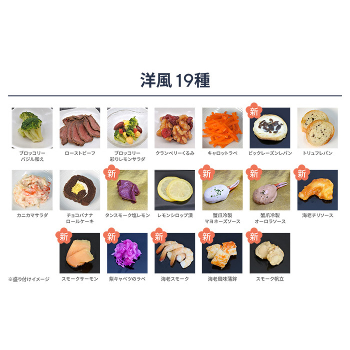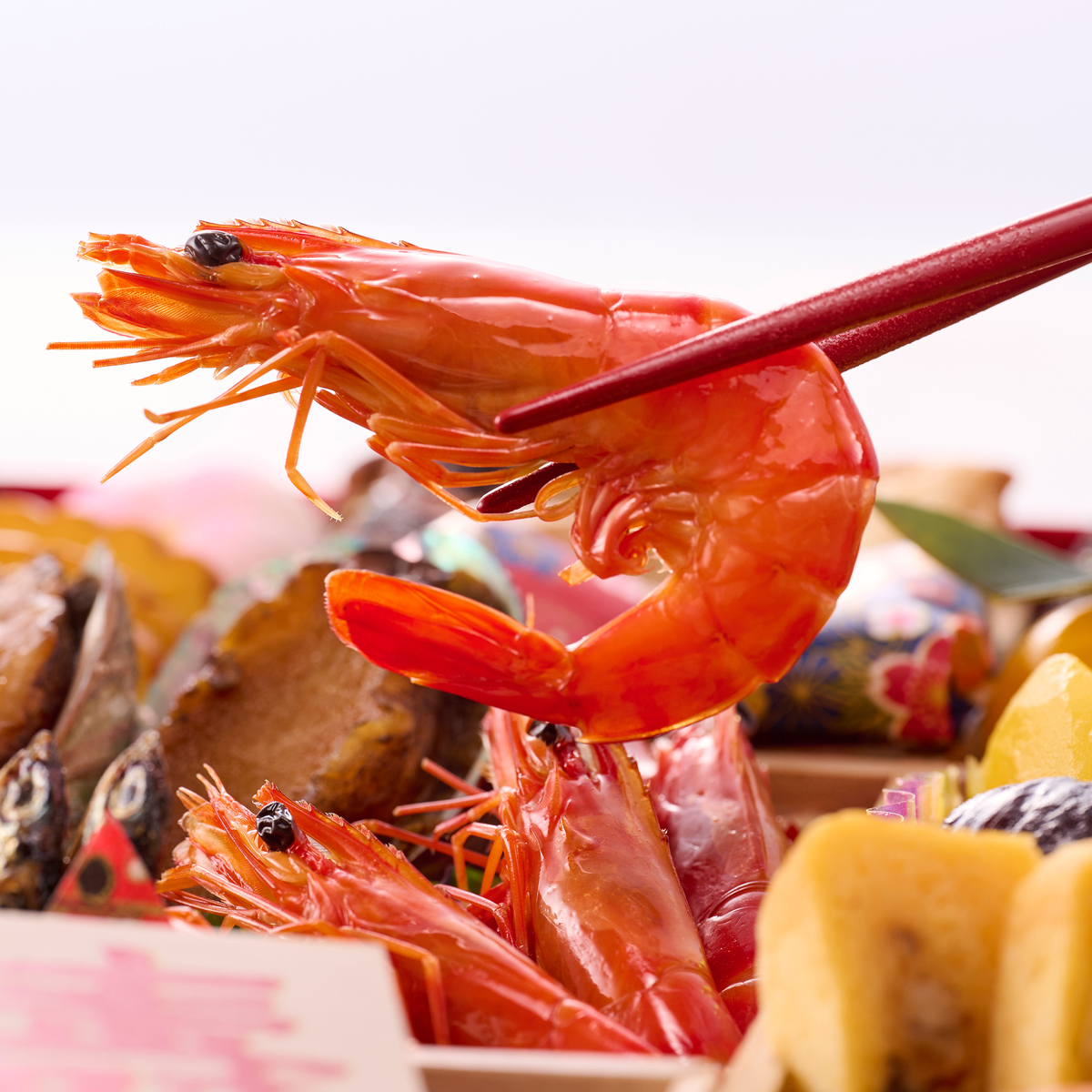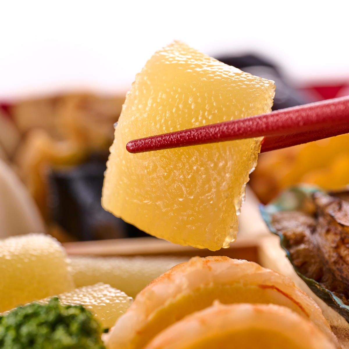 [アレルギー物質特定原材料8品目] 卵、小麦、乳、えび、かに、くるみ ※大学芋柚子風味と伊達巻にははちみつを含む商品です。1歳未満の乳児には与えないでください。 [商品内容] 64品目(一段重・盛り付け済み) [賞味期限] 2026.1.31 [お重サイズ] 41.3×33×7.4cm [保存方法] 開封前:冷凍(ー18℃以下で保存してください) 開封後:解凍後は冷蔵庫に保存下さい ※一度解凍したおせち料理は再び凍らせますと品質が変わりますので、再冷凍はお避け下さい [解凍方法] 1.ケースより取り出してください 2.冷蔵庫(5℃〜10℃)または冷暗所で、上に物を乗せないようにして置いてください ※解凍時間の目安:約24時間で解凍できます。解凍時間は場所や温度により差がありますので、お召し上がり予定の2〜3時間前に解凍状態を確認してください [原産国] 日本 [原材料] 22.菜の花と昆布の和え物:菜の花(中国産)、昆布、人参、砂糖他 23.北海道産数の子:数の子(国産)、還元水あめ、白しょうゆ、発酵調味料(清酒風)他 24.海老玉子チーズ風味:スクランブルエッグ(鶏卵、植物油脂、その他)(国内製造)、海老(海老、食塩)、乳等を主要原料とする食品、魚肉すり身(たら、砂糖)他 25.タンスモーク塩レモン:豚舌(アメリカ産又はカナダ産)、調味液(還元水あめ、食塩、その他)他 26.レモンシロップ漬:レモン(南アフリカ産)、砂糖 27.クランベリーくるみ:ドライクランベリー(アメリカ製造)、くるみ、還元水飴、デーツシロップ、砂糖、水飴、食塩、寒天他 28.雲丹チーズソース寄せ:魚介類加工品(卵黄、うに、その他)(国内製造)他 29.若桃甘露煮:若桃(国産)、砂糖他 30.小松菜と揚げの煮物:小松菜(国産)、油揚げ、和風調味料他 31.鮑旨煮:あわび(中国産)、みりん、鰹エキス、昆布エキス他 32.蟹爪冷製マヨネーズソース:魚肉(ベニズワイガニ(国産))、スケソウダラ(北海道)、ナガヅカ)他 33.蟹爪冷製オーロラソース:魚肉(ベニズワイガニ(国産)、スケソウダラ(北海道)、ナガヅカ)、食用植物油脂、半固体状ドレッシング他 34.海老旨煮:えび(ブラックタイガー)(タイ産)、砂糖、還元水あめ、しょうゆ、みりん、食塩他 35.田作り:かたくちいわし(国産)、砂糖、水飴、醤油、たん白加水分解物、寒天他 36.黒豆金箔飾り:黒大豆(中国産)、砂糖、還元水飴、醤油他 37.サーモン塩こうじ和え:サーモントラウト(チリ産)、塩糀、デキストリン/酒精他 [原材料] 38.きんとん:生あん(ライマメ)(国内製造)他 39.栗甘露煮:栗(中国産)、砂糖/クチナシ色素他 40.渋皮栗甘露煮:栗(中国産)、砂糖 41.海老チリソース:えびフリッター[えび(インドネシア産)、食塩、酵母エキス他 42.若鶏鳴門巻:鶏肉(国産)、鶏皮、わかめ、小麦粉、醤油他 43.鰻巻:鶏卵(国産)、鰻蒲焼、上白糖、粉末油脂、醤油他 44.キャロットラペ:人参(国産)、砂糖他 45.スモークサーモン:サーモンフィレ(サーモントラウト(チリ産)他 46.紫キャベツのラペ:紫キャベツ(国産)、ぶどう酢他 47.海老スモーク:海老(バナメイ)(中国産) 48.くわい柚子胡椒和え:くわい(中国産)、白味噌他 49.カニカマサラダ:かに風味かまぼこ(国内製造)、半固体状ドレッシング、ぶどう糖他 50.合鴨スモークスライス:合鴨肉(中国産)他 51.丸穴子南蛮漬け:焼マルアナゴ(国内製造)、でん粉、植物油脂、砂糖、しょうゆ他 52.あしらい紅梅:還元水飴(タイ製造)、砂糖、寒天他 53.あしらい白梅:還元水飴(タイ製造)、砂糖、寒天他 54.はすの芽梅酢風味:れんこん(ベトナム産)、漬け原材料(しょうゆ、砂糖、醸造酢、食塩、梅酢)/調味料(アミノ酸等)、野菜色素他 55.十二支大根:大根(国産)、果糖ブドウ糖液糖、醸造酢、食塩他 56.ローストビーフ:牛肉(オーストラリア産又はアメリカ産)、食塩、香辛料、醤油、ローストオニオン、デキストリン、フライドガーリック、ローストガーリック粉末他 57.ブロッコリー彩りレモンサラダ:ブロッコリー(エクアドル産)他 58.海老風味蒲鉾:魚肉(アメリカ製造)他 59.スモーク帆立:帆立(国産)他 60.紅白なます:大根(国産)、人参(国産)他 61.カマス梅肉南蛮:カマス(国産)、砂糖、米酢、味付ねり梅(梅肉、砂糖、馬鈴薯でん粉、その他)、かつお節エキス、馬鈴薯でん粉、食用植物油脂、醤油、本みりん、こんぶエキス、唐辛子、清酒、食塩他 62.かに風味土佐酢漬:魚肉ねり製品(国内製造)、土佐酢(醸造酢、みりん風調味料、しょうゆ風調味料、砂糖、風味調味料)/調味料(有機酸等)、トレハロース他 63.つぶ貝とびっこ和え:つぶ貝しぐれ煮(つぶ貝(国産)、発酵調味料、料理酒、その他)、トビ魚卵加工品他 64.烏賊印籠焼:いか(中国産)、魚卵成型加工品(卵黄、鱈の卵、鮫の卵、その他)他