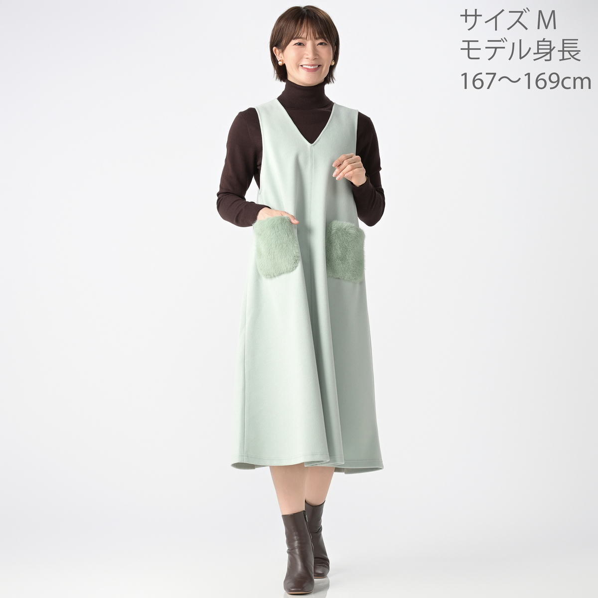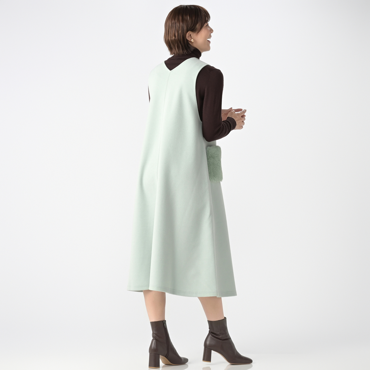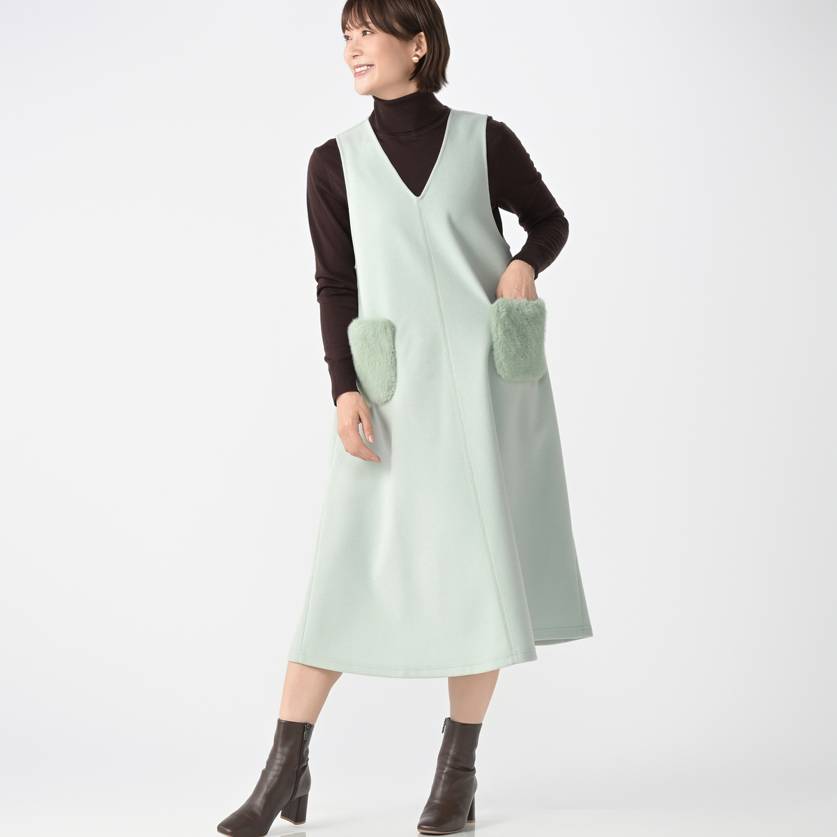 コーデに活躍してくれるシンプルなジャンパースカート。両サイドにあしらったフェイクファーポケットがポイントです