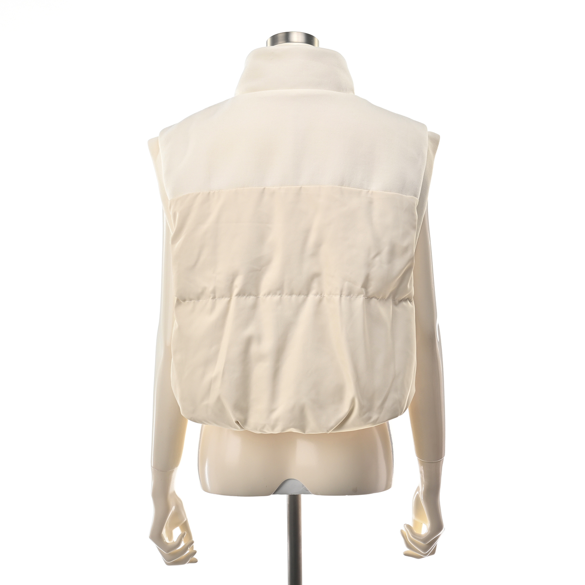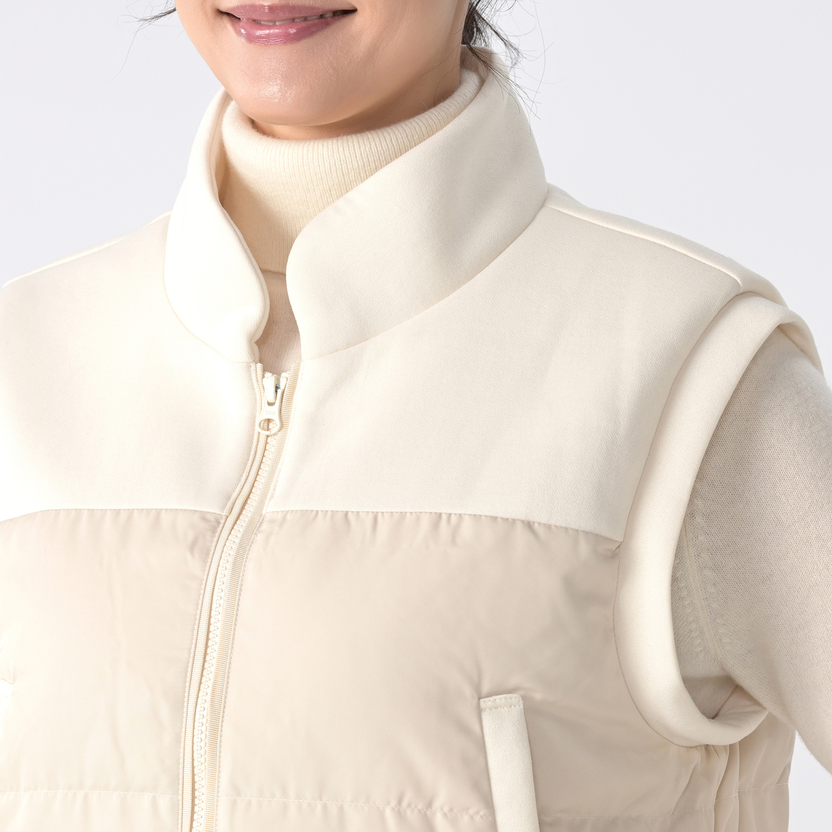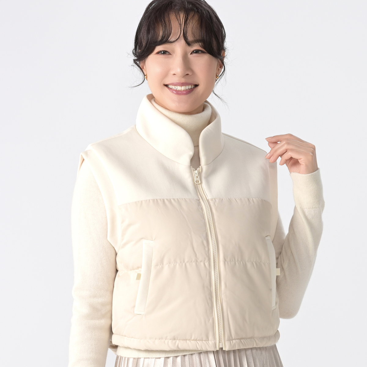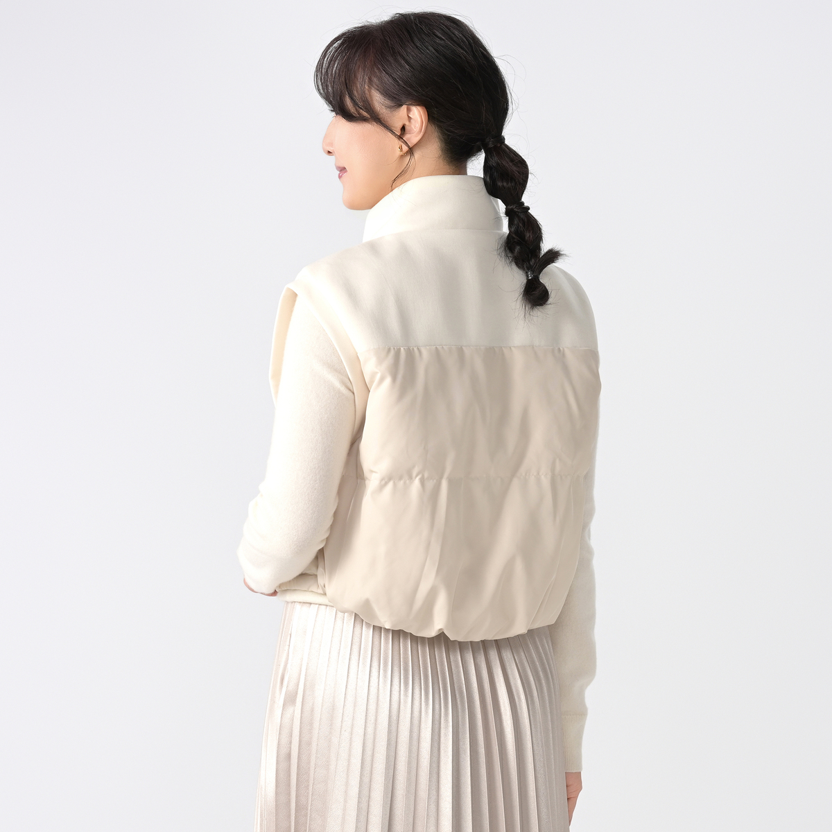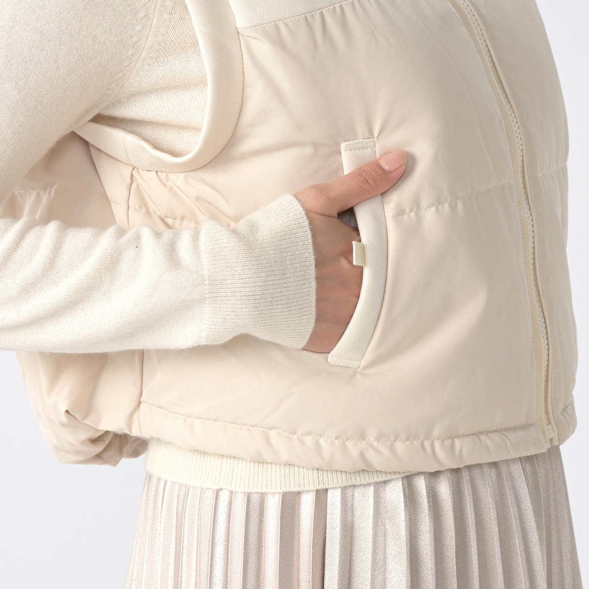 ダンボールニットとポリエステルタフタを組合せた、ショートタイプのダウンベスト。身頃のタフタ側にはダウンを入れて仕立てました