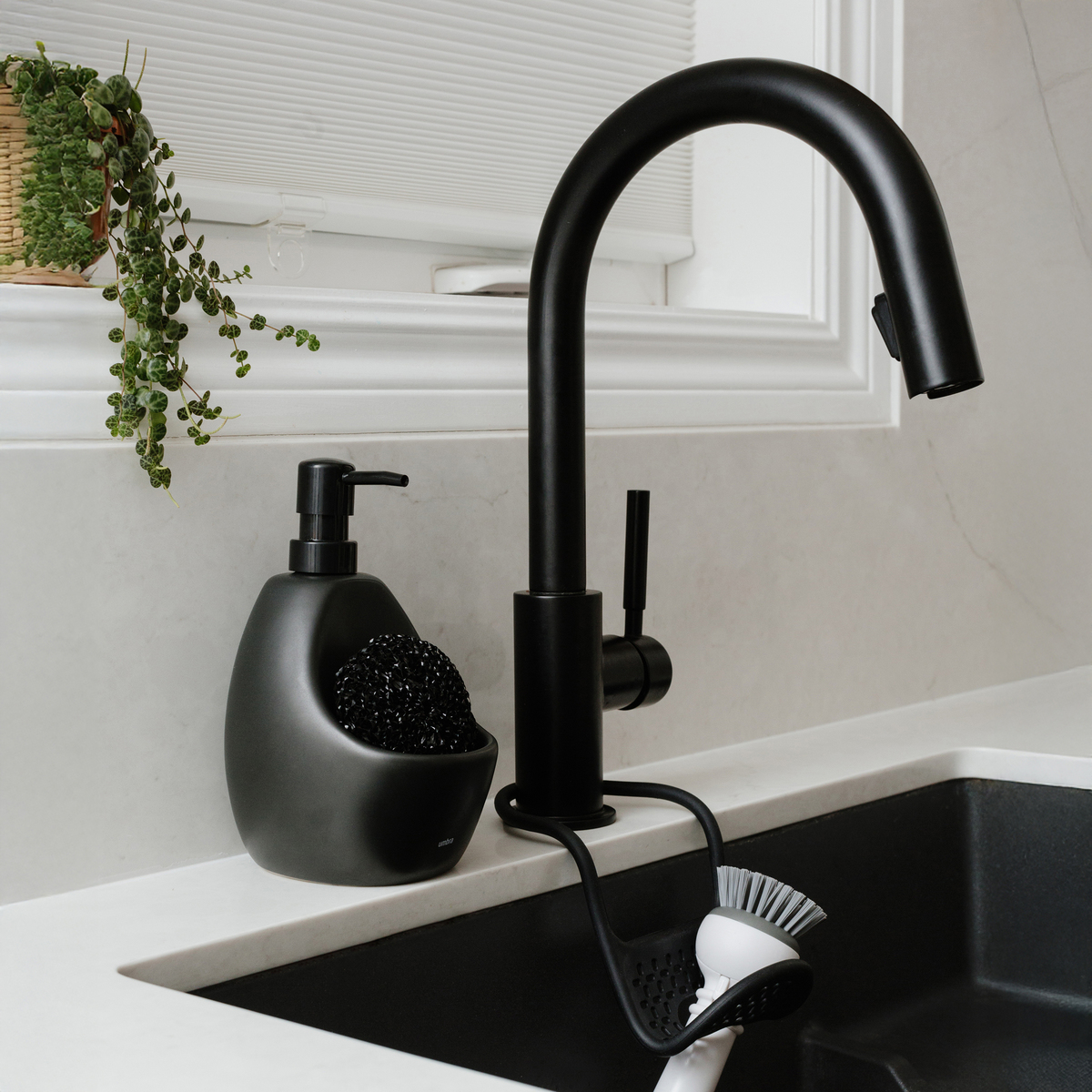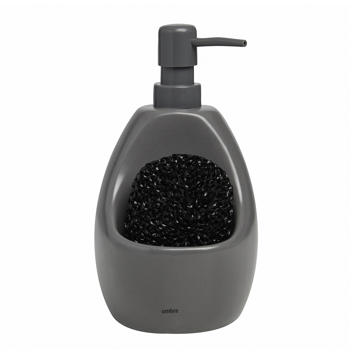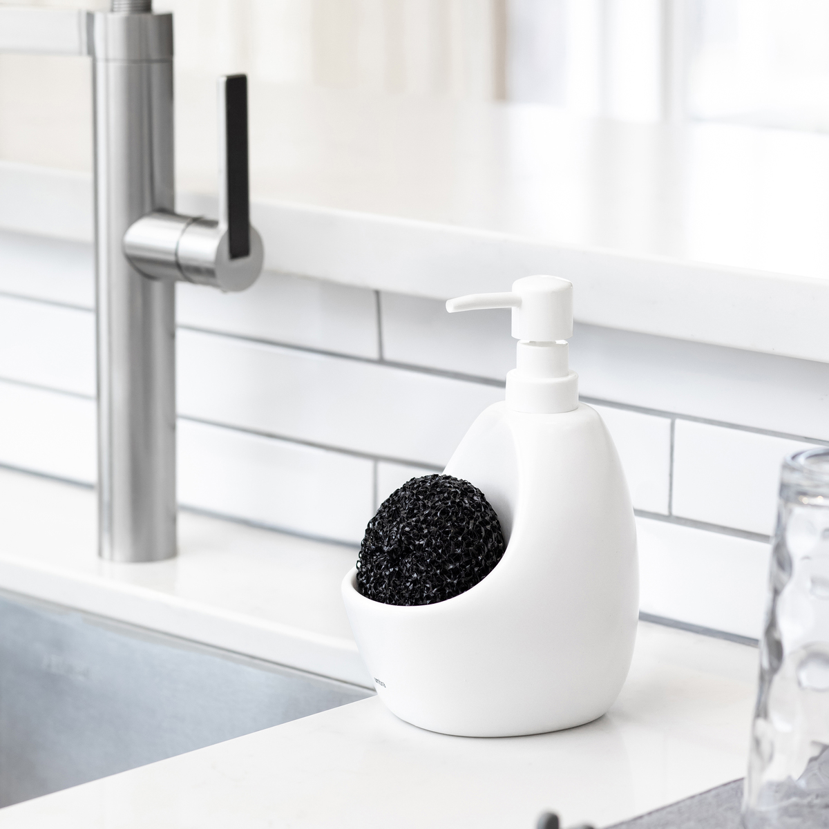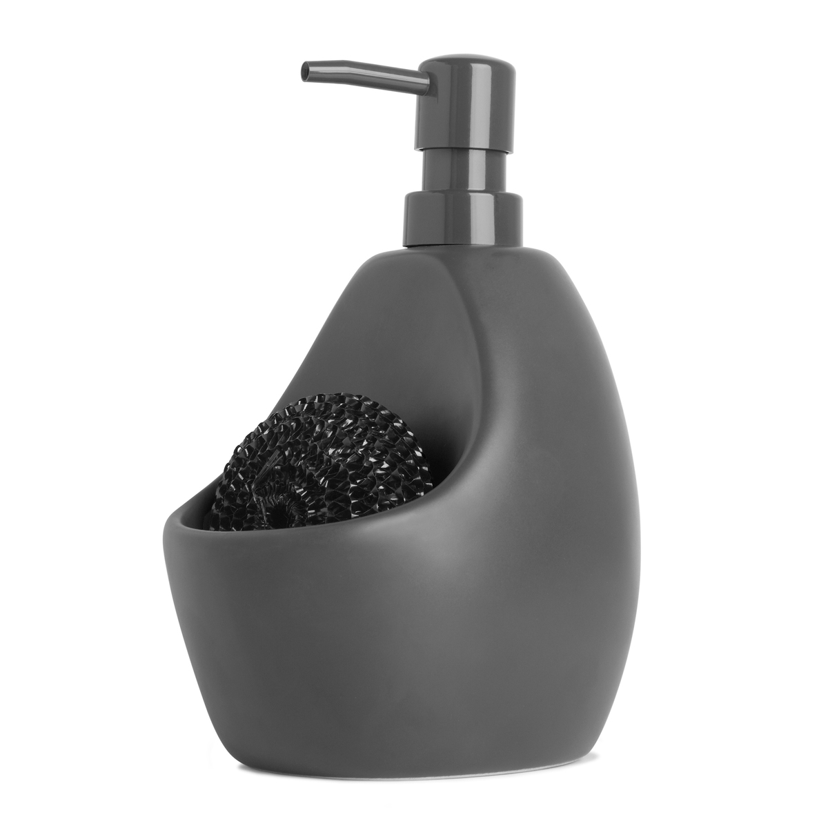 スポンジホルダーが付いた陶器製ソープポンプ。シックなカラーのスポンジもセットに。シンク周りがすっきり整います