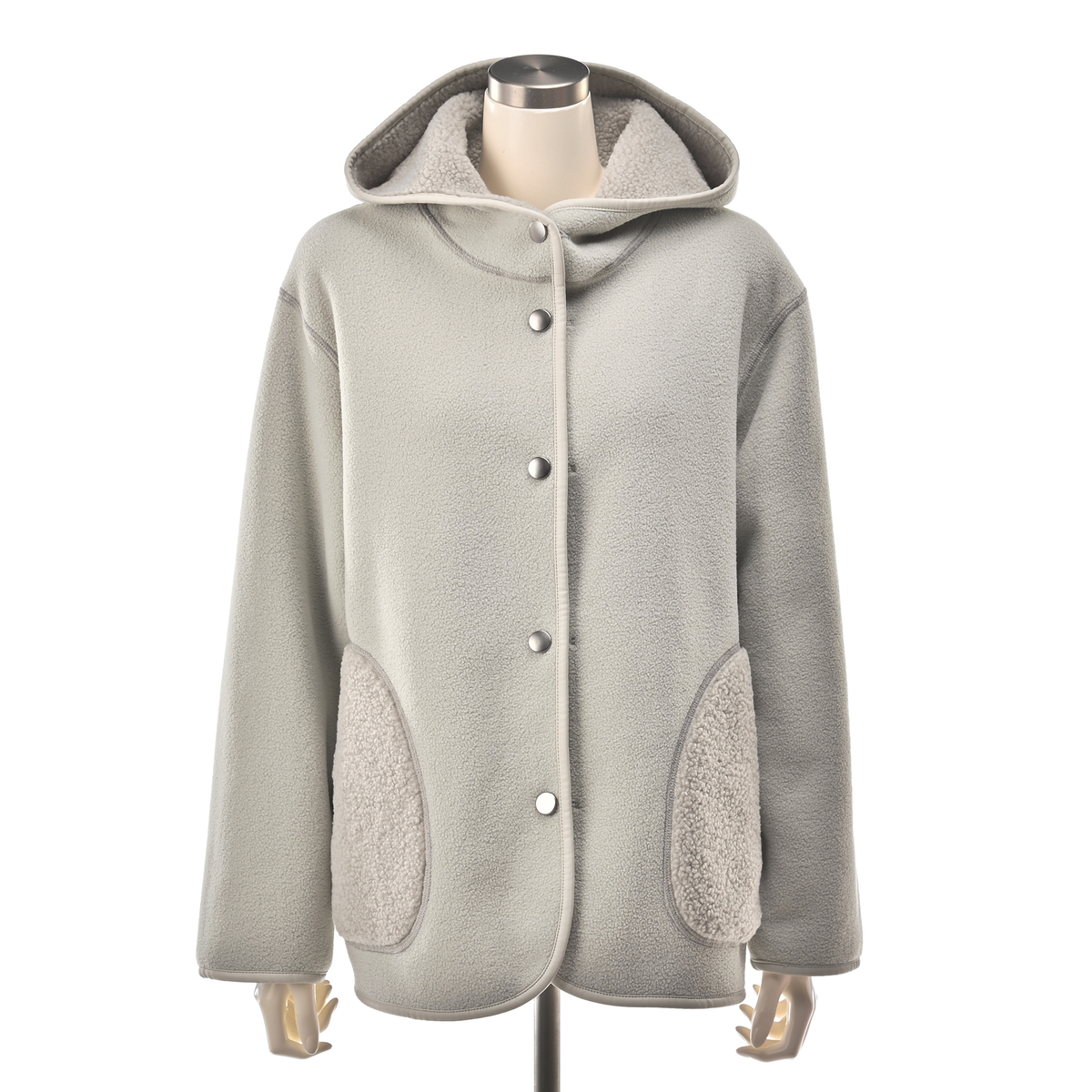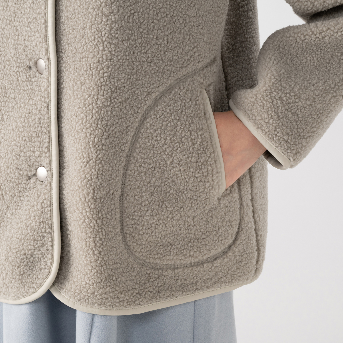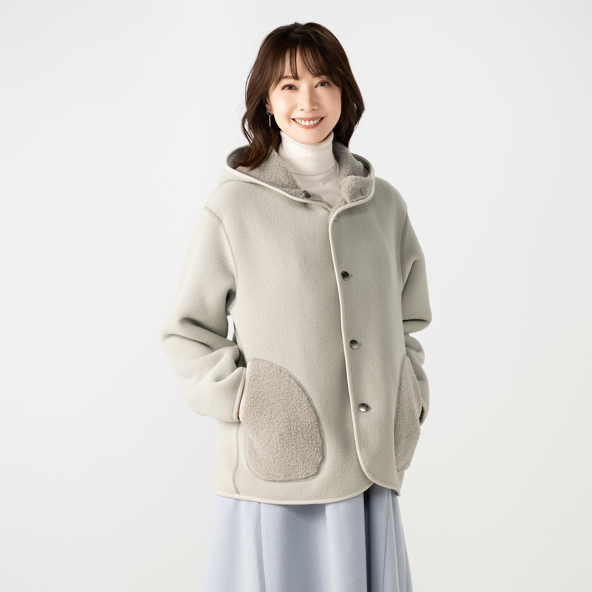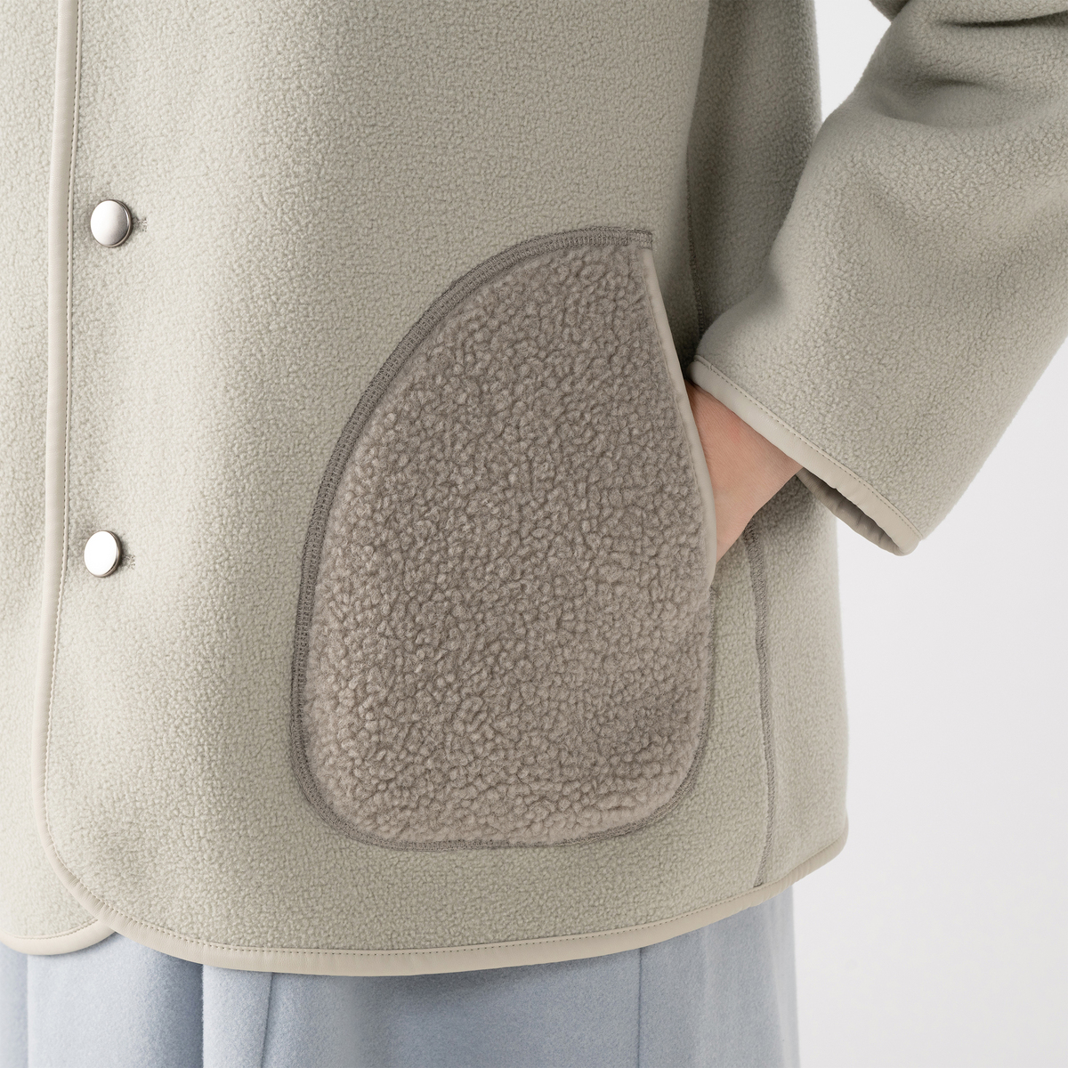 フリース側のポケットにはボア素材を使い、ふっくらとした立体感がかわいらしさを演出します。普段使いや外出時にさっと羽織れて、日々のコーデに活躍します
