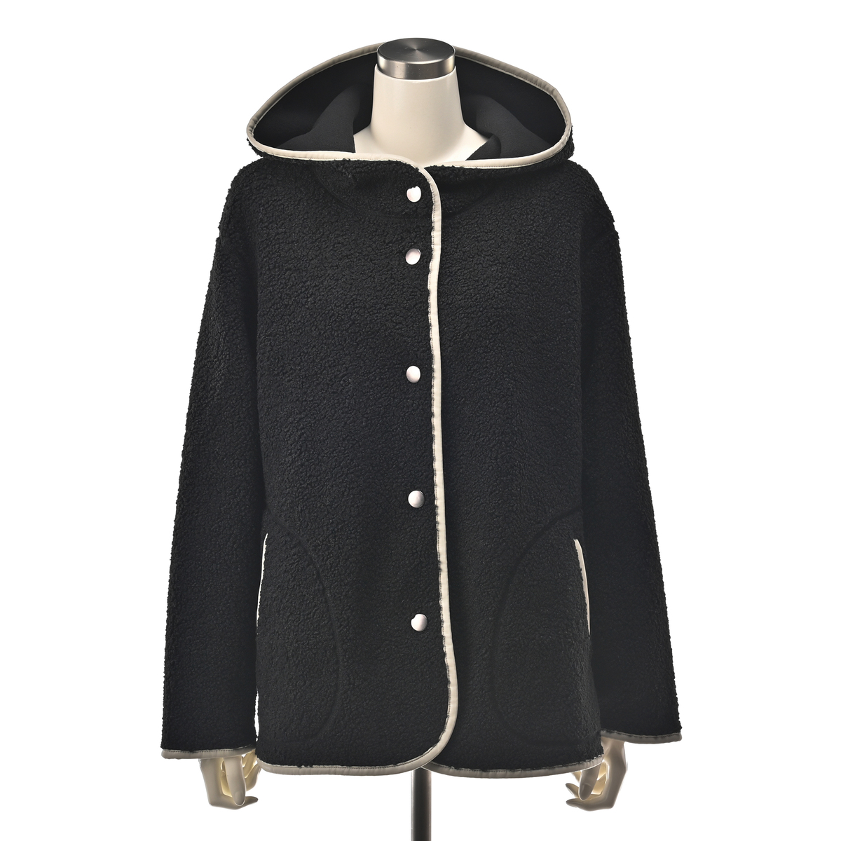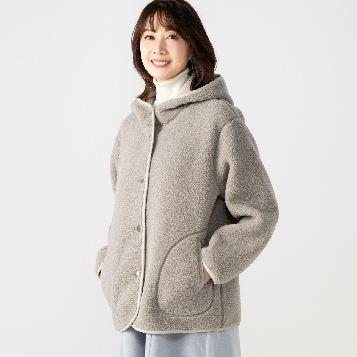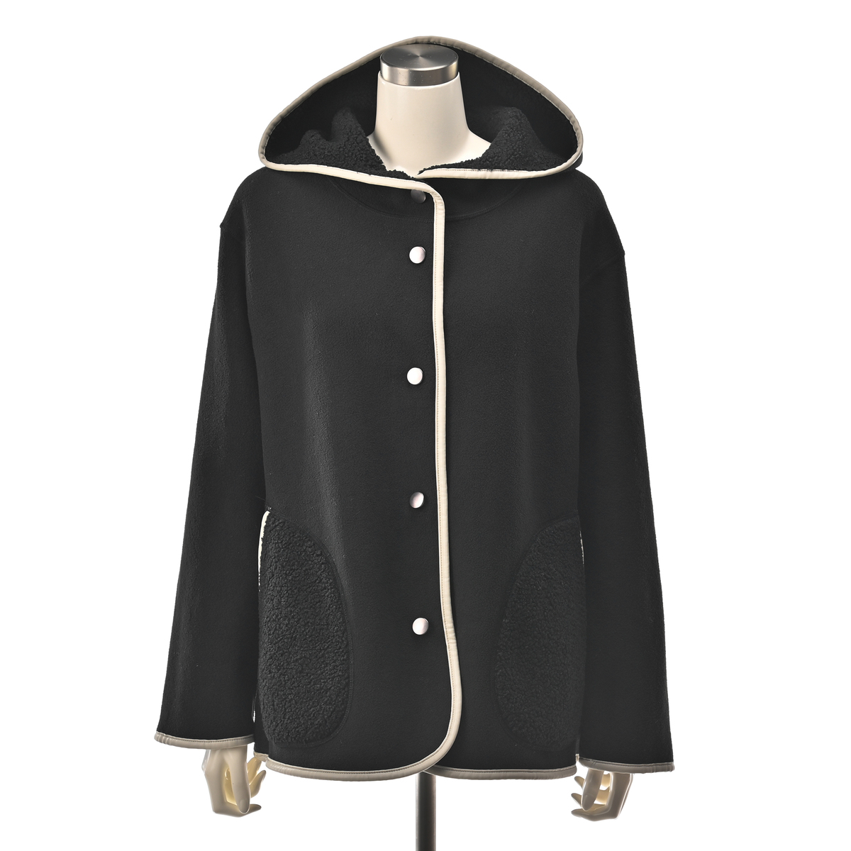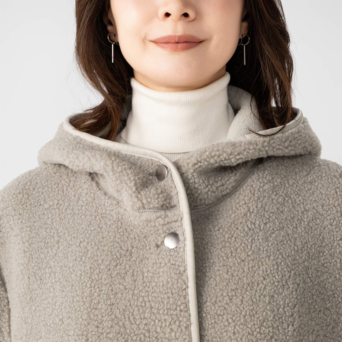 ボアとフリース、どちらも同色で楽しめるリバーシブルショートコート。ヒップが隠れる丈で、フード周りから裾、袖口端に合皮レザーの端パイピングを施し、配色のアクセントを加えました