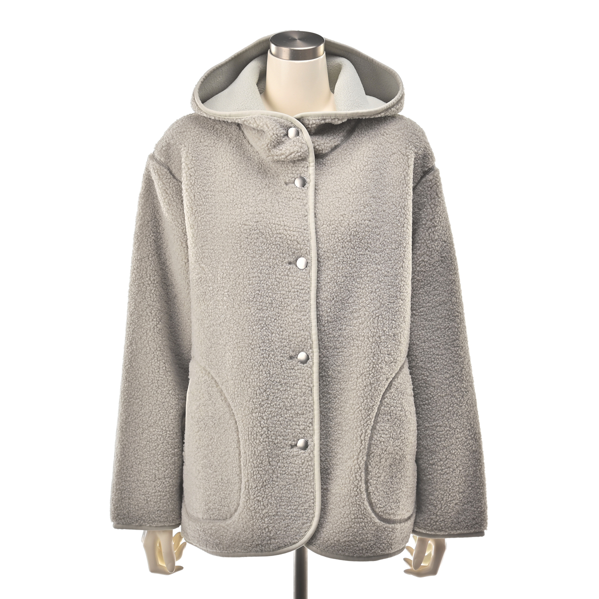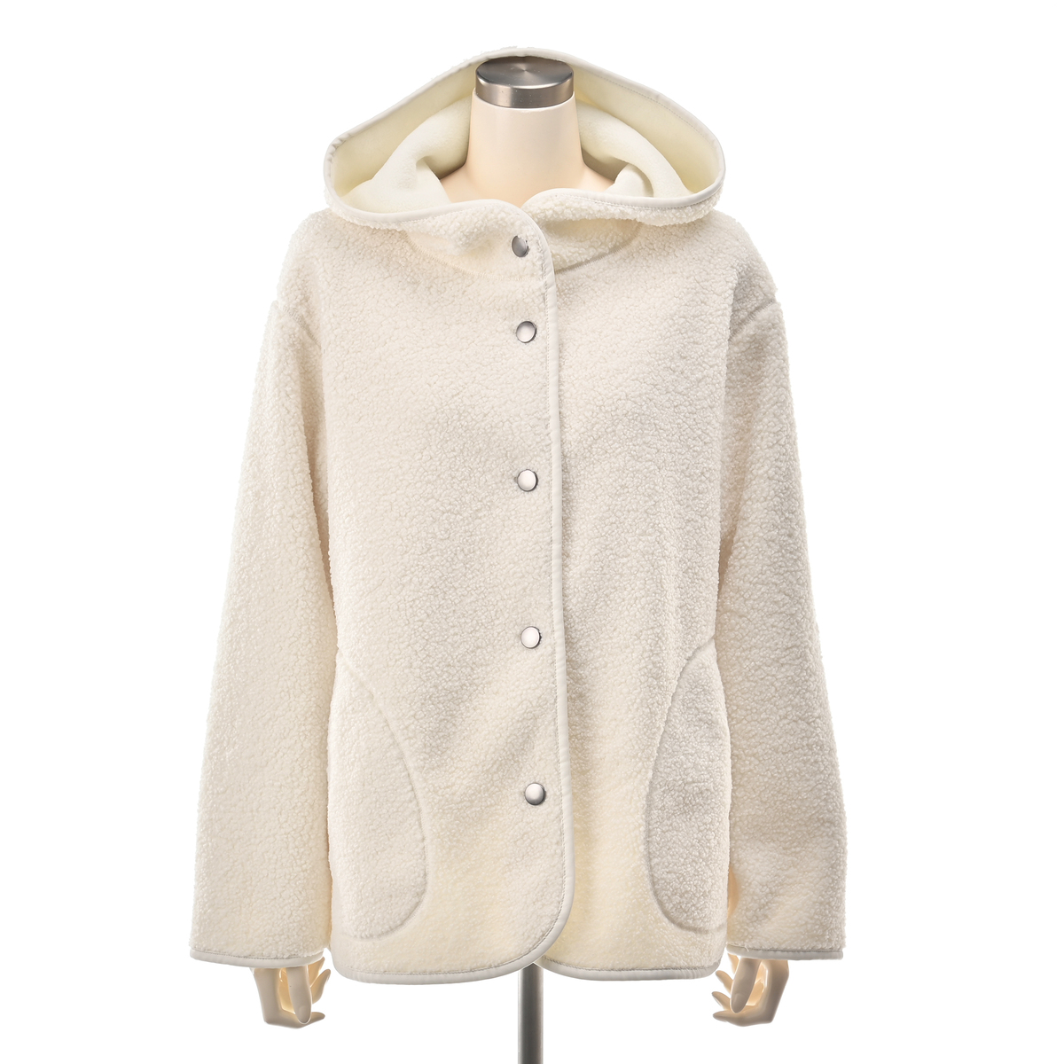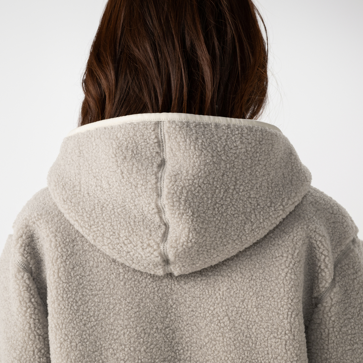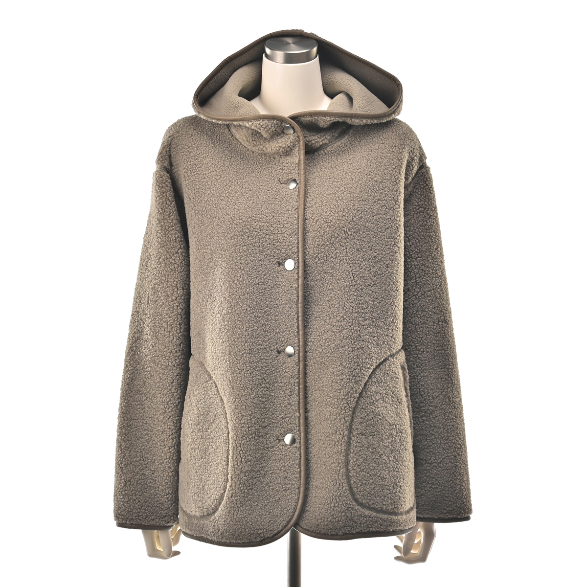 ボアとフリース、どちらも同色で楽しめるリバーシブルショートコート。ヒップが隠れる丈で、フード周りから裾、袖口端に合皮レザーの端パイピングを施し、配色のアクセントを加えました