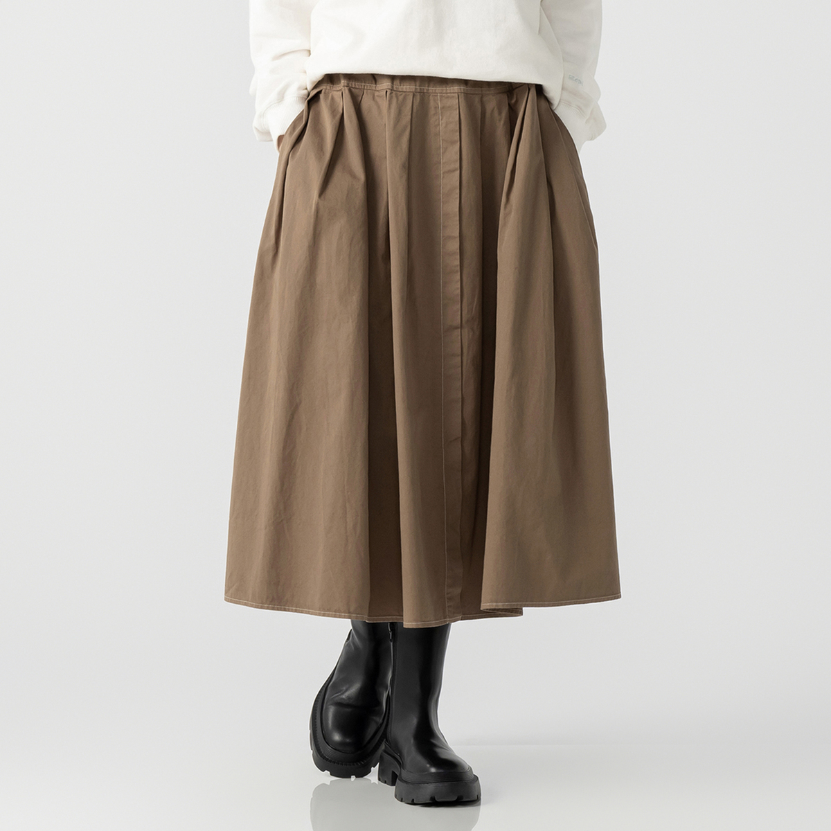 全色ビンテージ感のある製品洗い加工で仕上げたスカートです。ウエストは総ゴムのプルオン仕様で、ヨーク下の車ひだが美しいシルエットを演出。前中心は見せかけの前立てで、縦方向の配色ステッチがすっきりと見せています