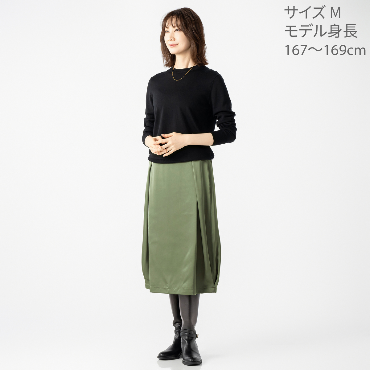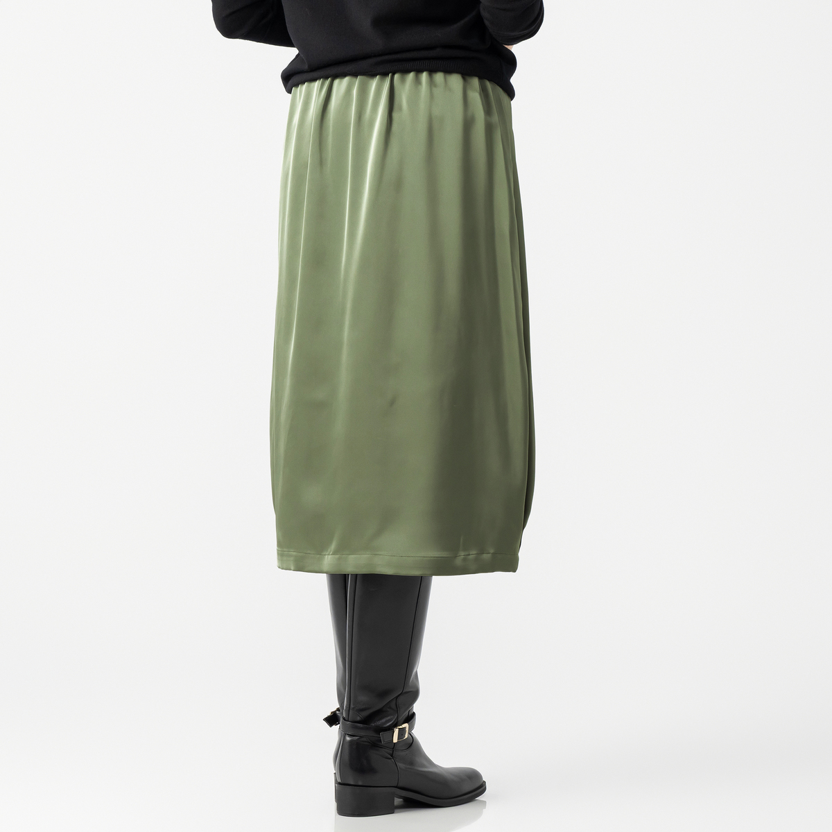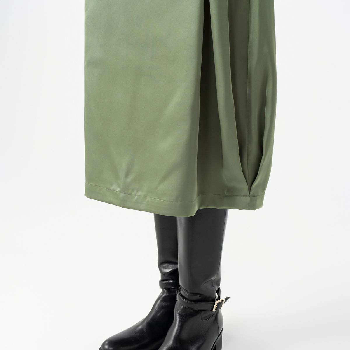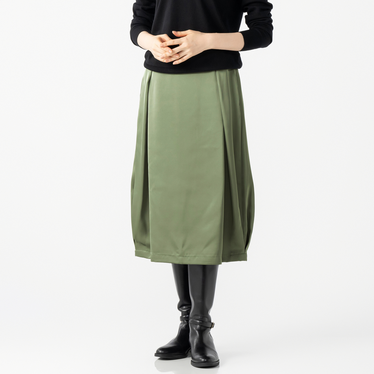 コクーンシルエットに光沢のある生地を組合せ、洗練された印象を演出するスカートです。裾の両サイドとフロントにタックを入れ、立体感のある美しいシルエットを叶えます