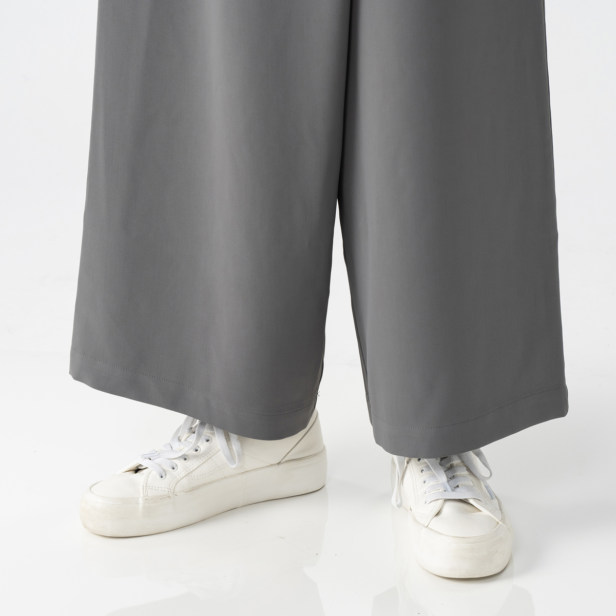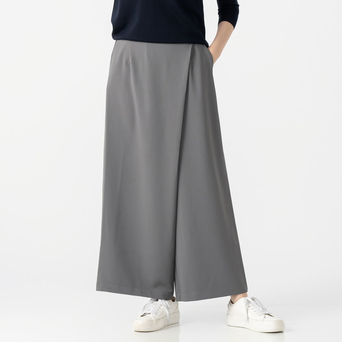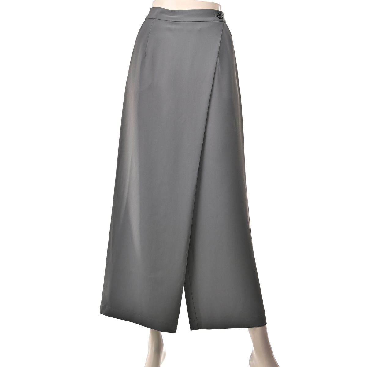 ラップデザインが印象的なワイドストレートのパンツです。ラップが気になるボディラインを隠しながら、すとんと落ちるシルエットがすっきりとした印象を与えてくれます