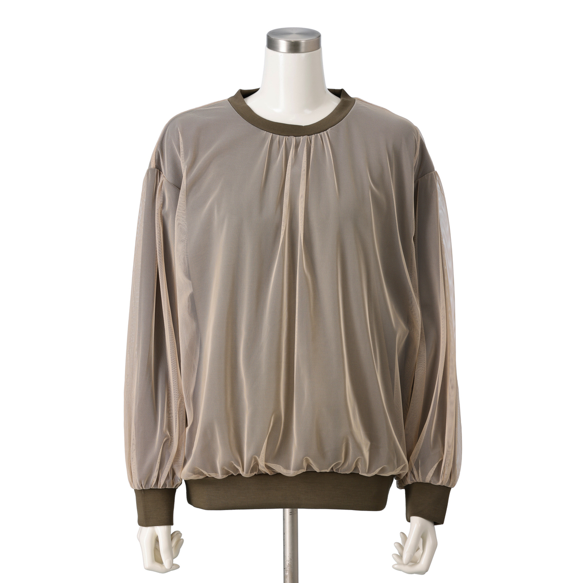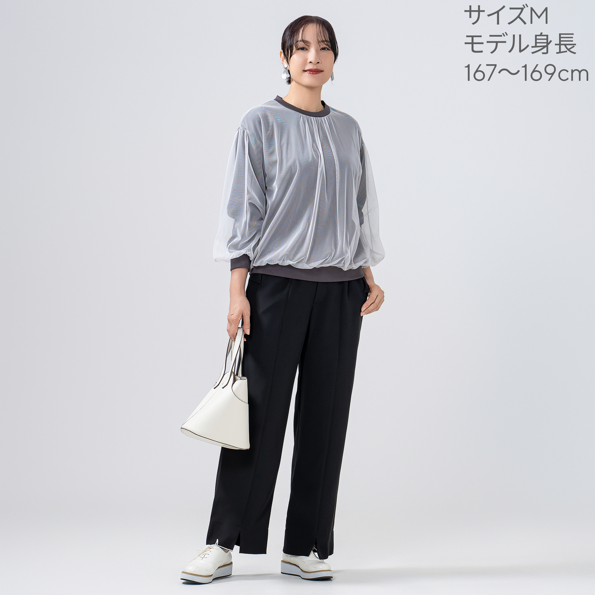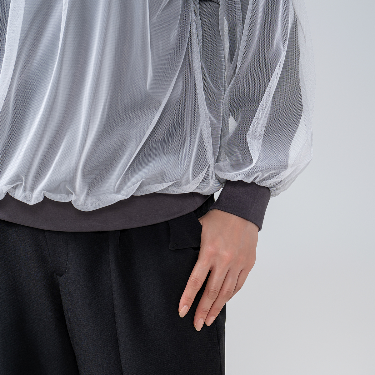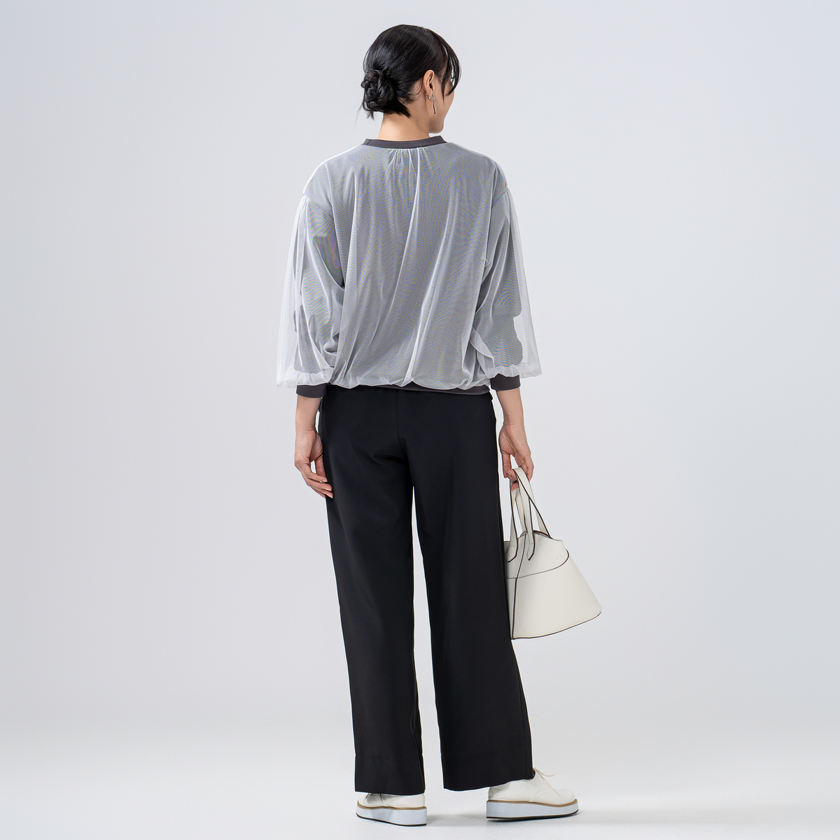 シアー素材をドッキングすることで陰影が生まれ、着るだけで表情豊かなスタイルに。シンプルながらも存在感があり、日常のコーディネートにアクセントを加えてくれます