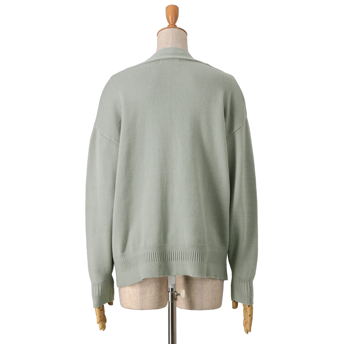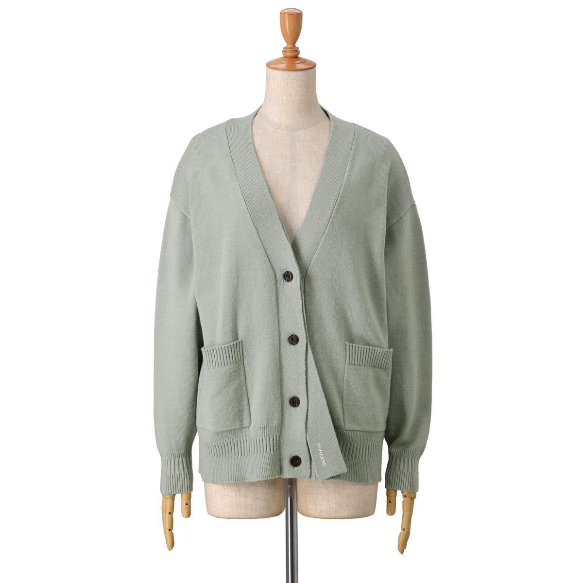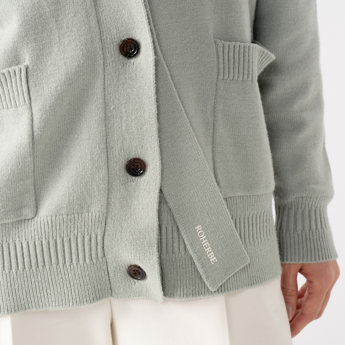 ベーシックなVネックカーディガンをハンサムな感覚のロエルベ風にアレンジ。ネックラインに挟んだアシンメトリーなテープがポイントになるカーディガンです。ちょうど良い肉厚で、もちふわっとした肌触りのニット素材を使用しています