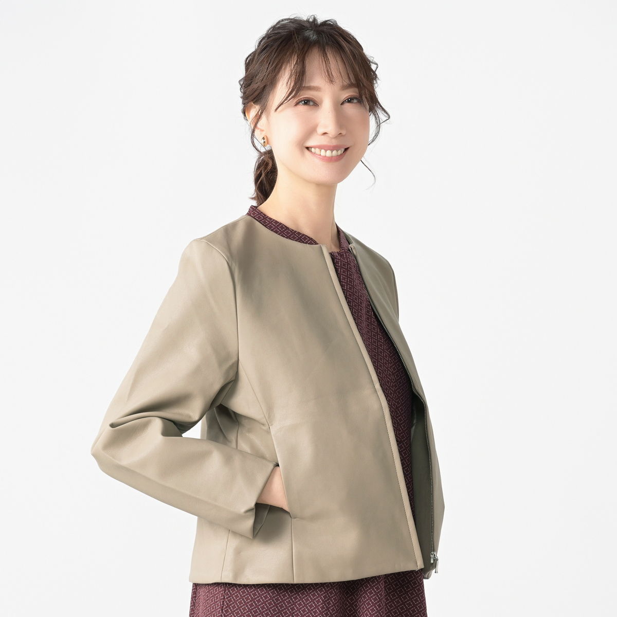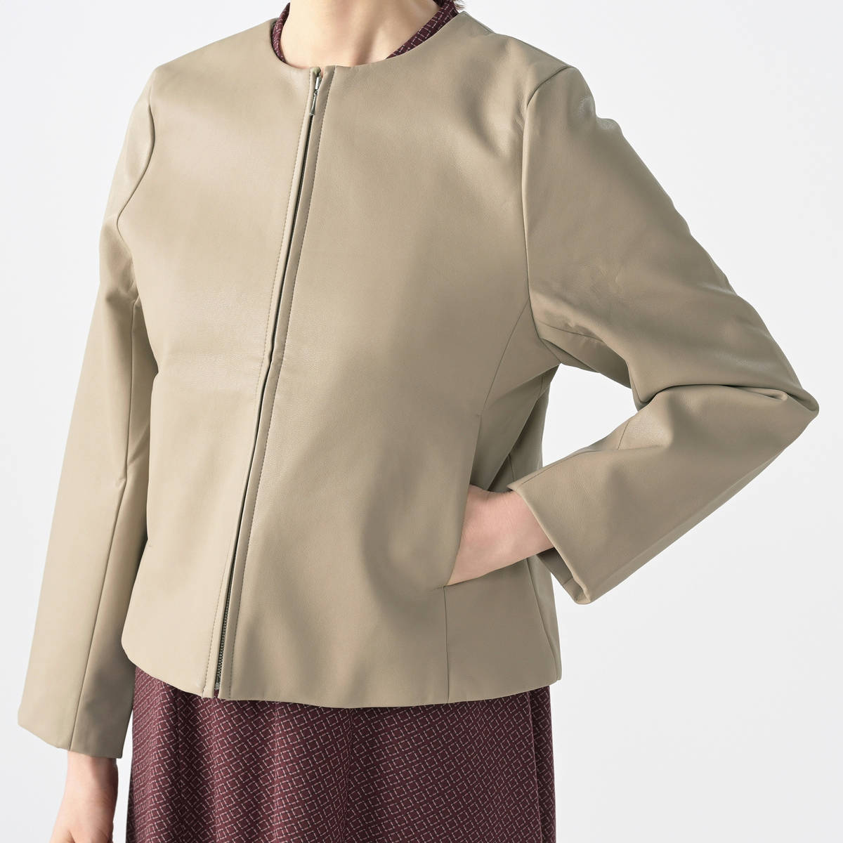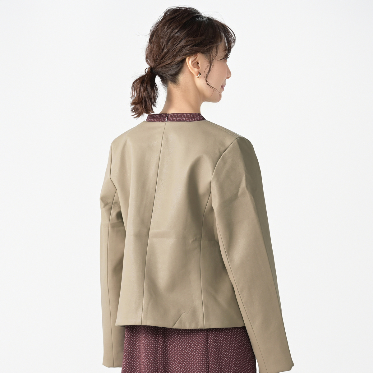 柔らかい色合いで仕上げた合成皮革のノーカラージャケット。表面に高級感のある素材で、高見えします