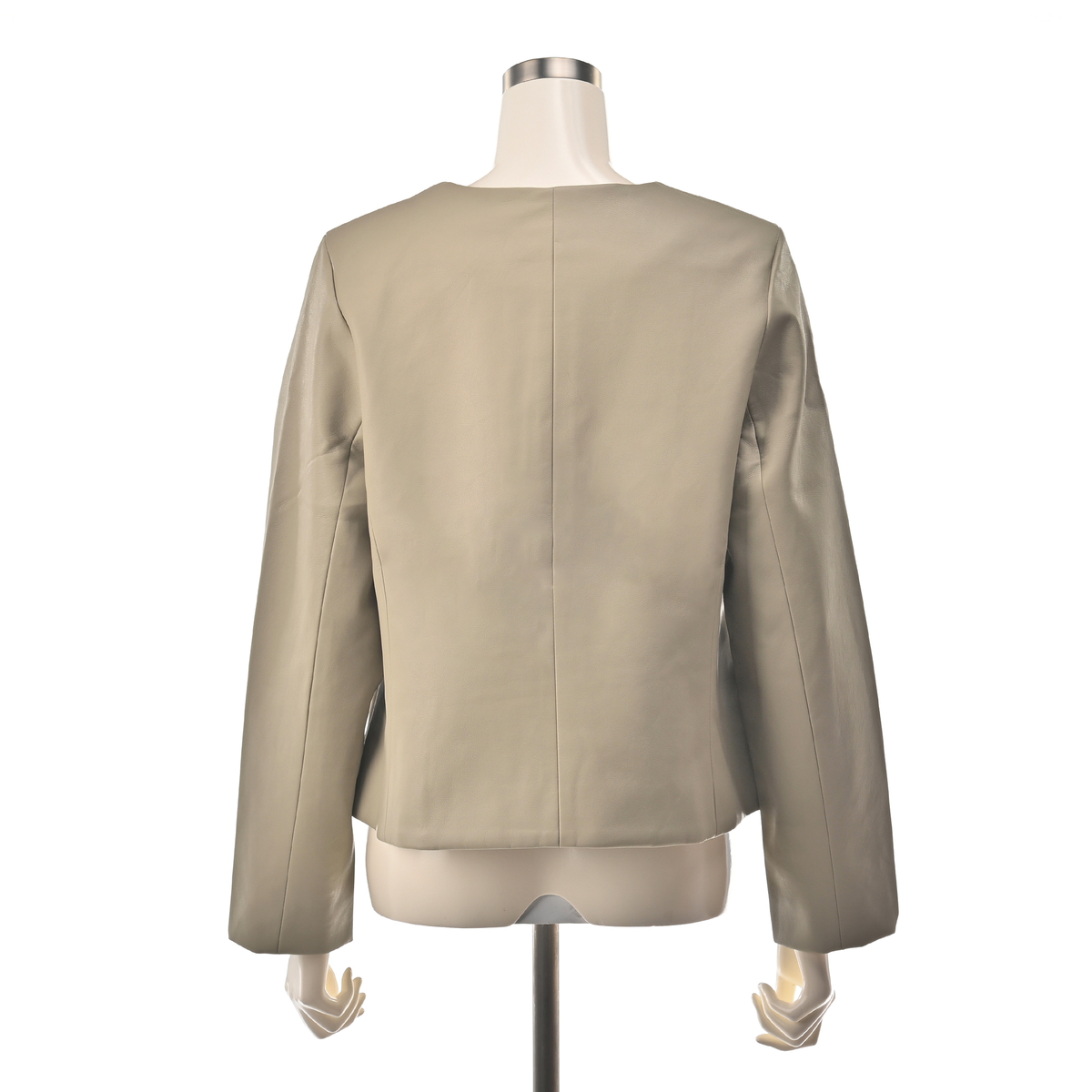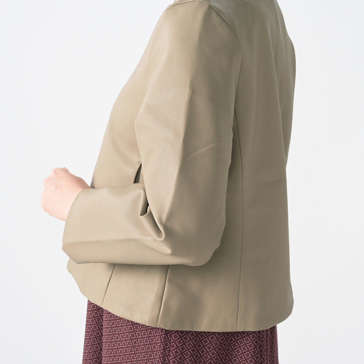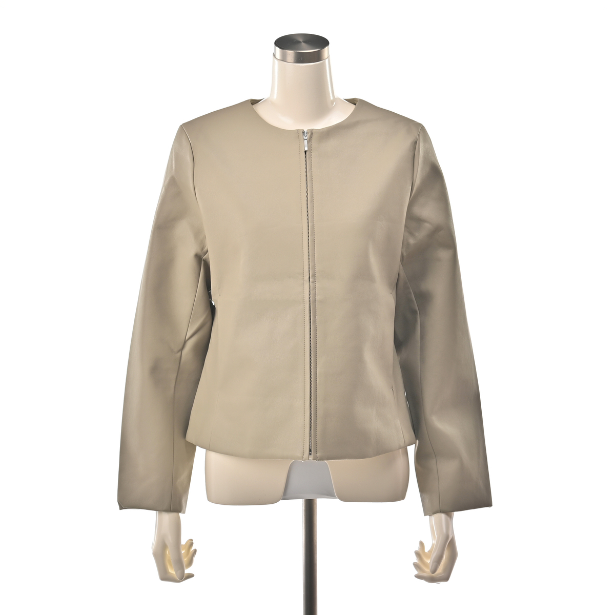 柔らかい色合いで仕上げた合成皮革のノーカラージャケット。表面に高級感のある素材で、高見えします