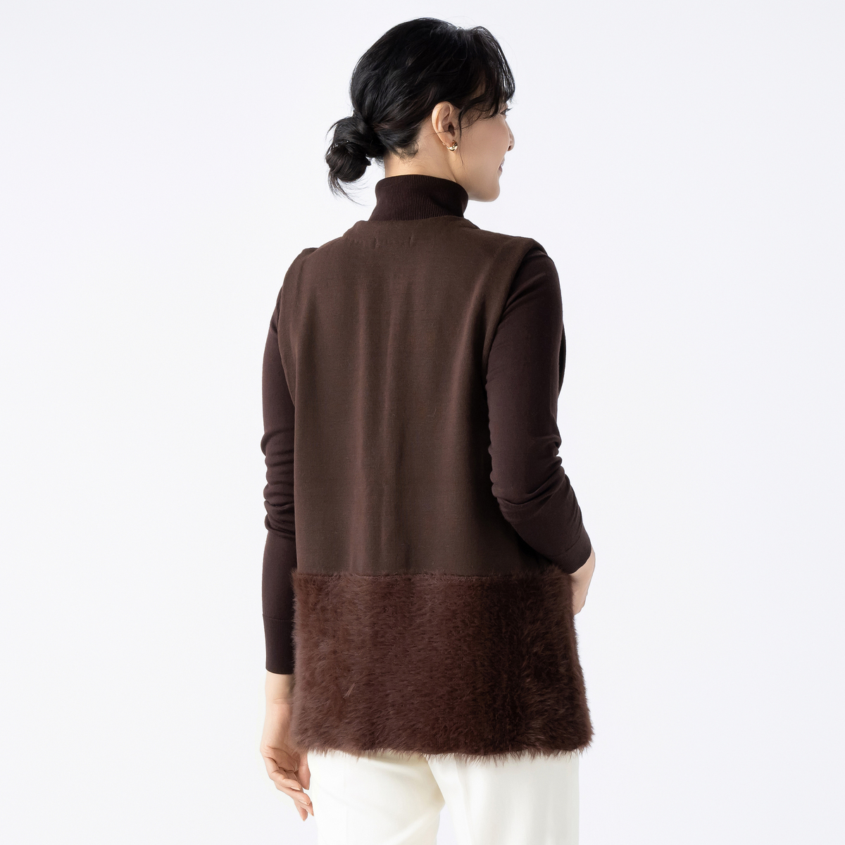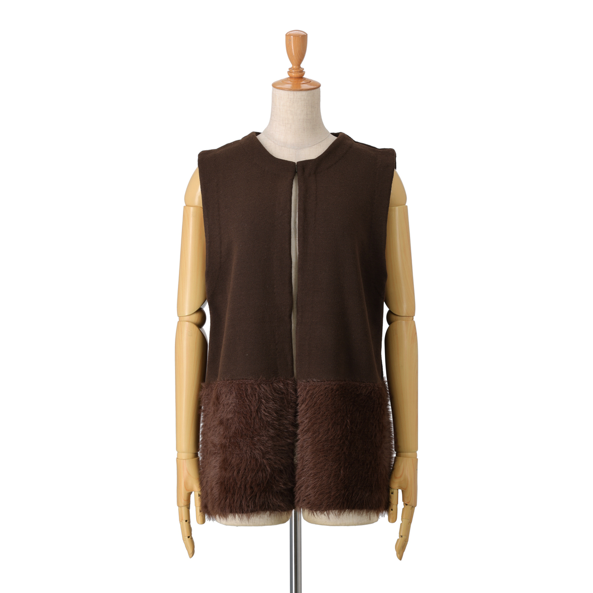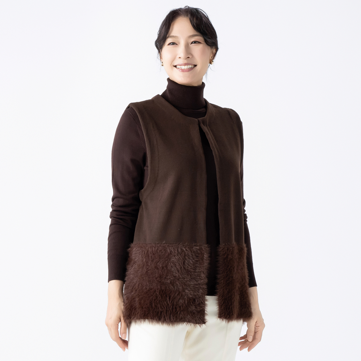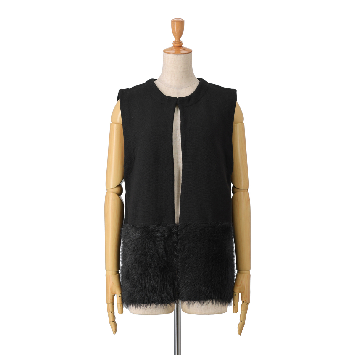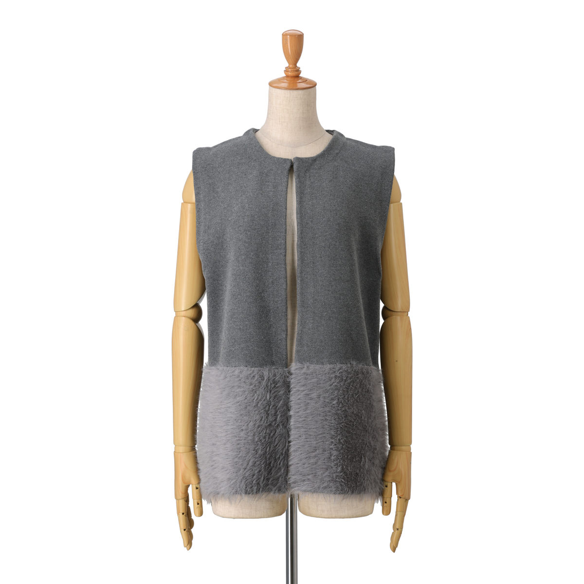裾部分にふわふわ素材をドッキングしたニットジレ。肌触り良く、体のラインを拾いにくいリラックスシルエットです