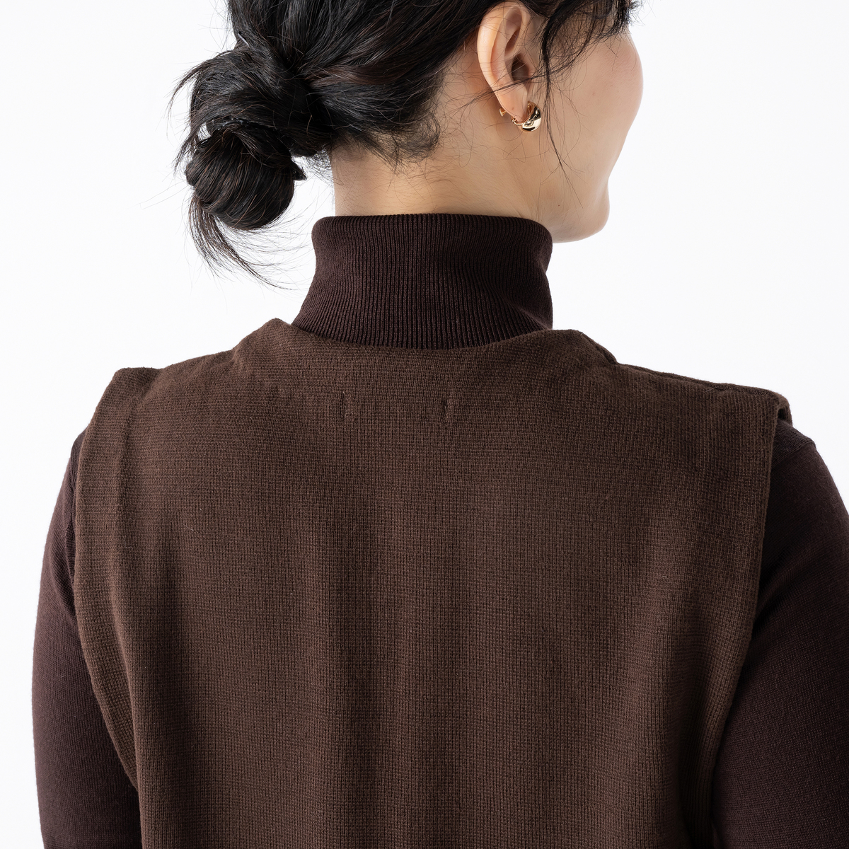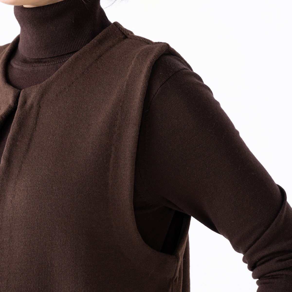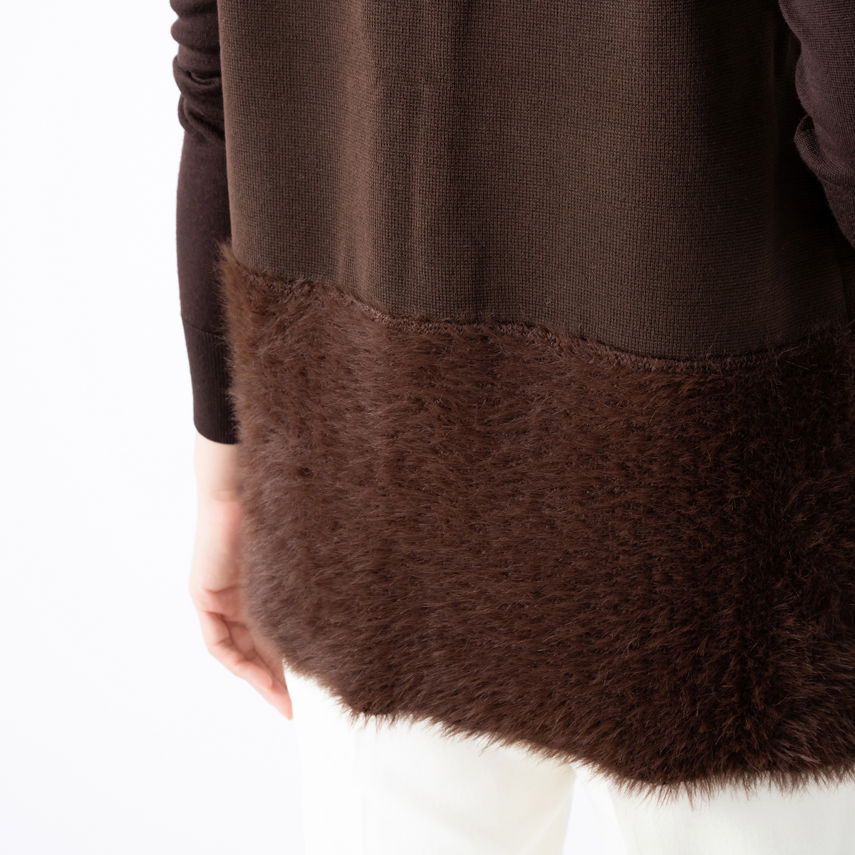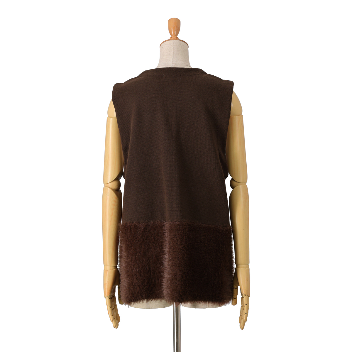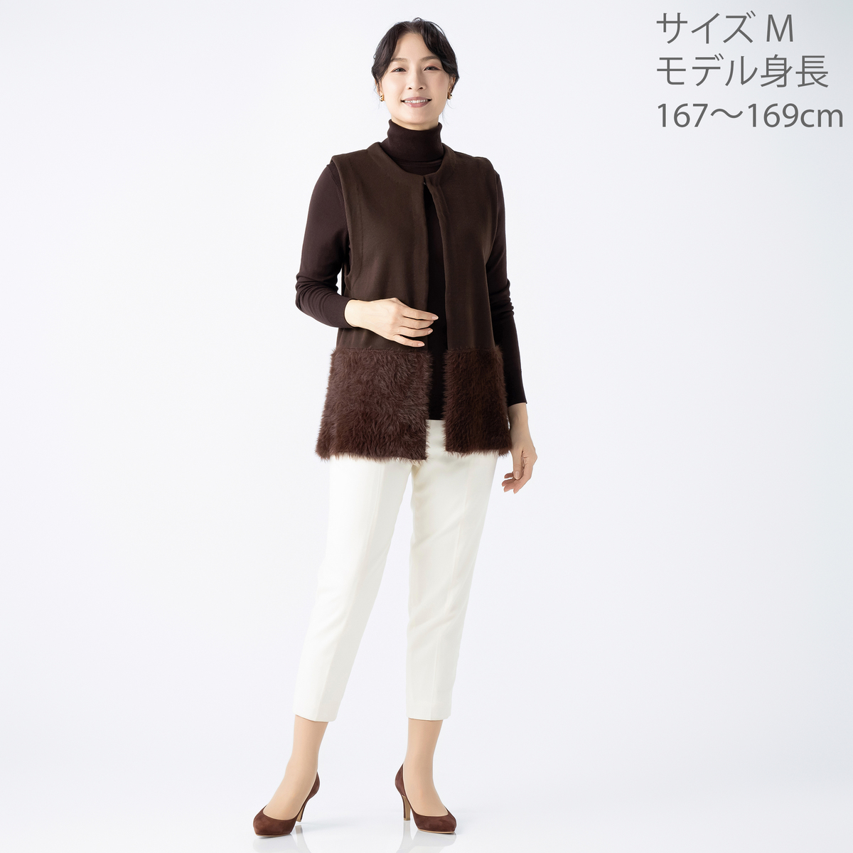 裾部分にふわふわ素材をドッキングしたニットジレ。肌触り良く、体のラインを拾いにくいリラックスシルエットです