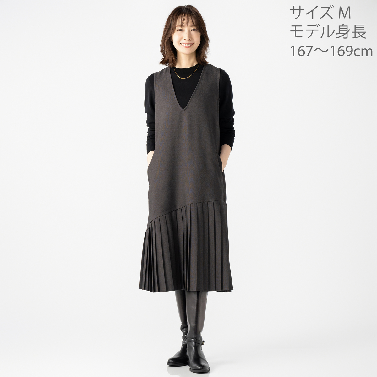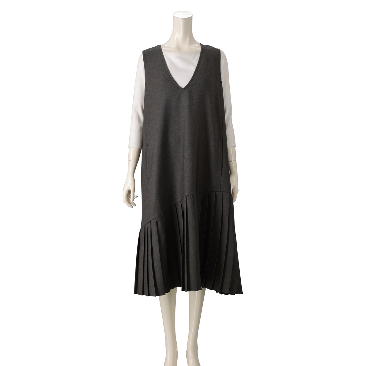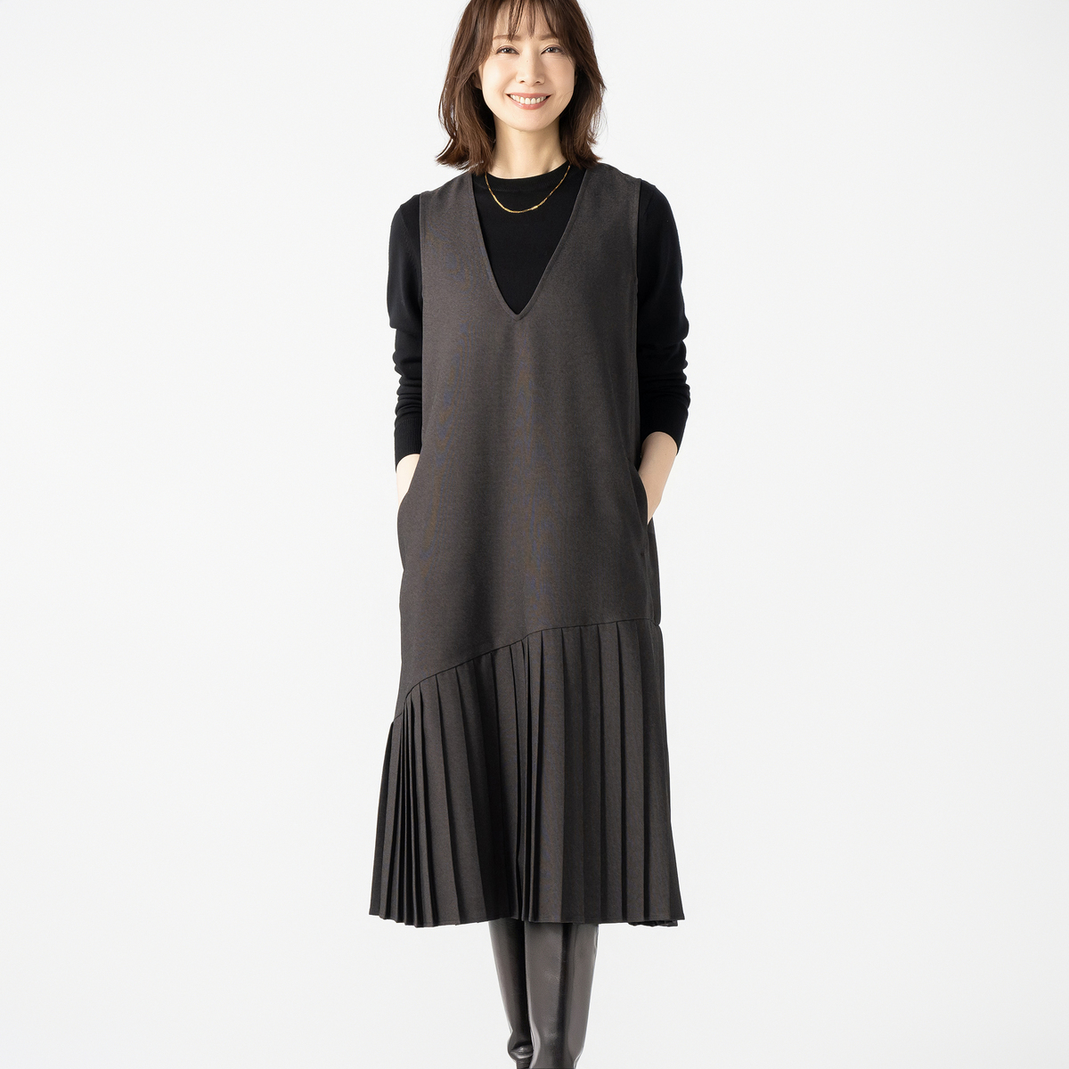 深めのVネックがすっきりとした印象を与える、ふくらはぎ丈のジャンスカです。裾には斜めの切り替えから車ヒダプリーツを細かく入れることで、フェミニンな表情をプラス。長すぎない丈感でロングブーツなどとも相性よく合わせていただけます