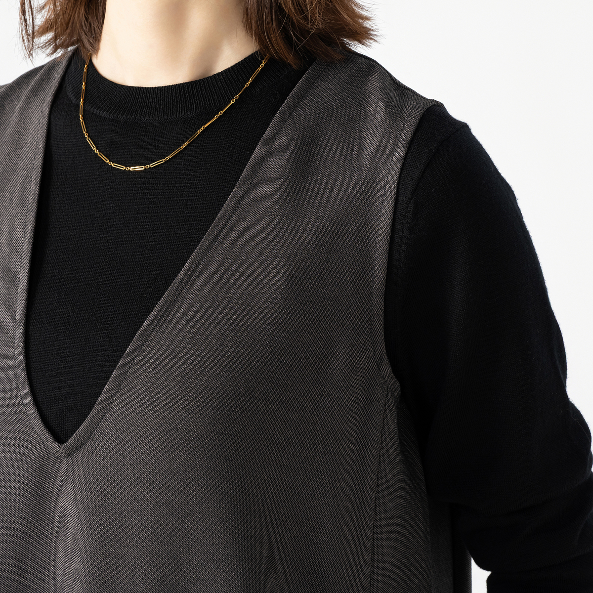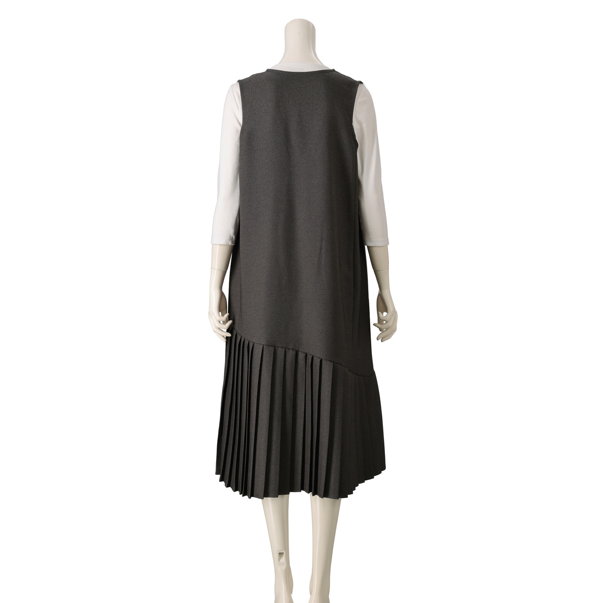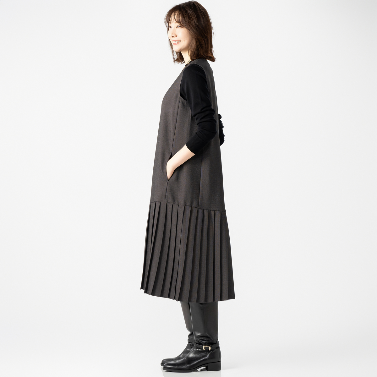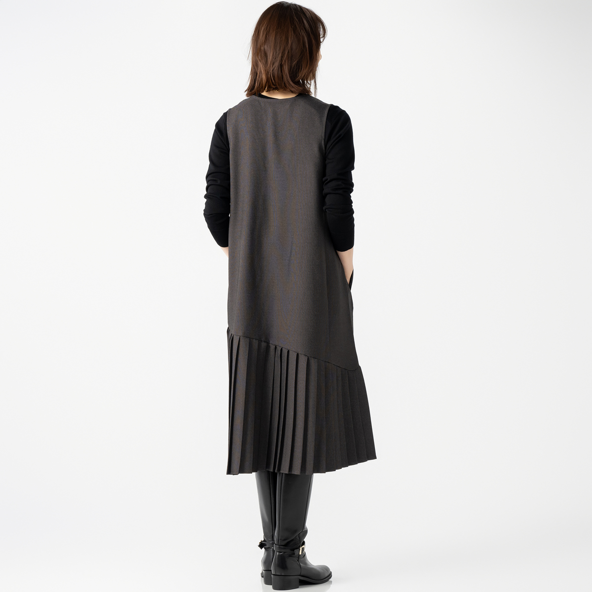 深めのVネックがすっきりとした印象を与える、ふくらはぎ丈のジャンスカです。裾には斜めの切り替えから車ヒダプリーツを細かく入れることで、フェミニンな表情をプラス。長すぎない丈感でロングブーツなどとも相性よく合わせていただけます