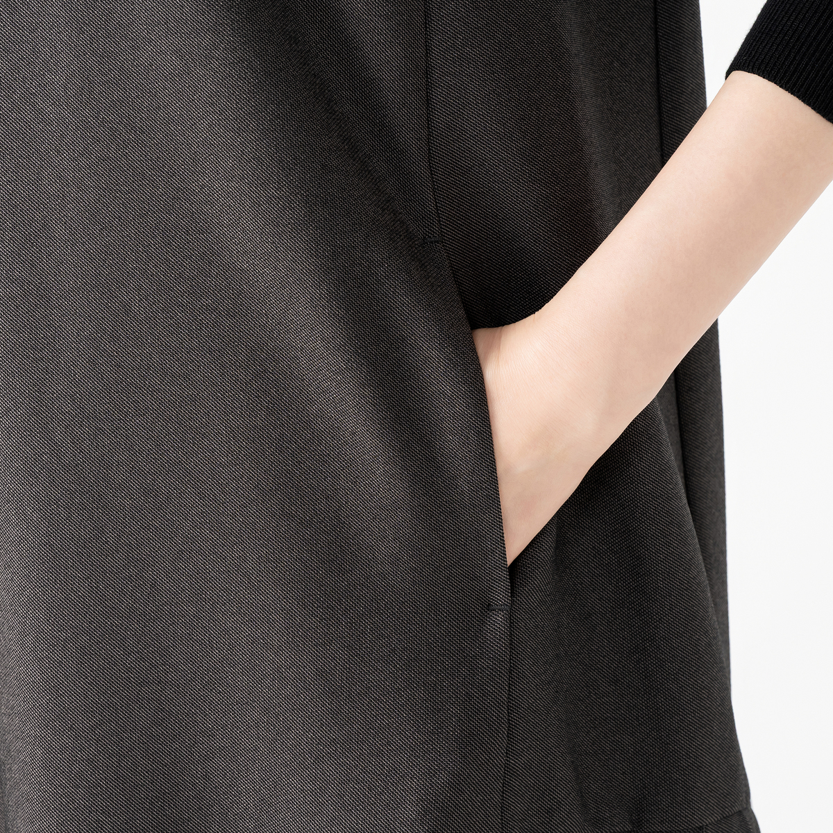 素材には、ポリエステル素材のシャークスキン織物を使用。ストレッチ性はありませんが、落ち感がよく、やわらかな肌触り。さまざまなインナーや羽織りとも合せやすい一着です