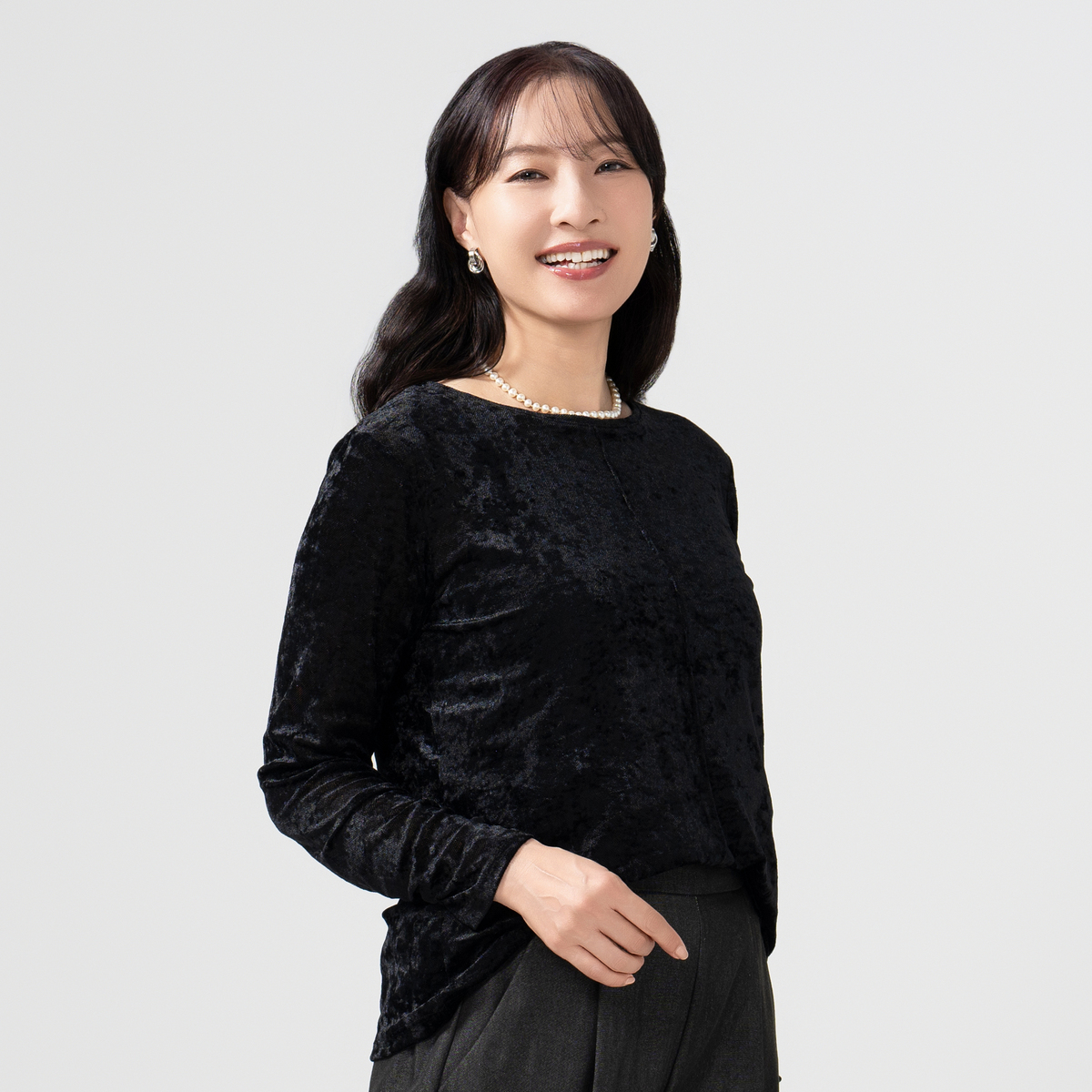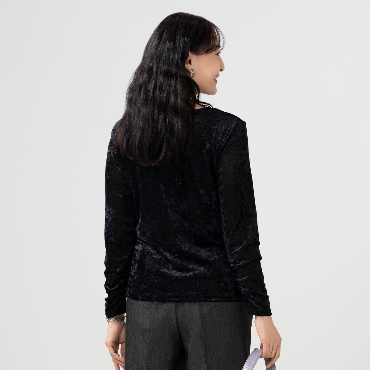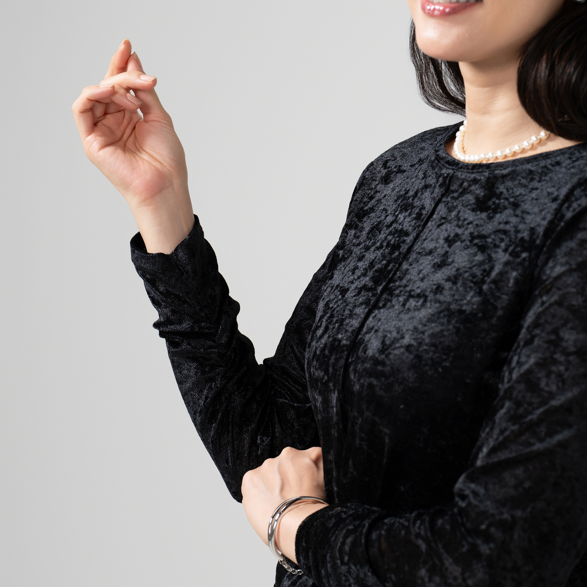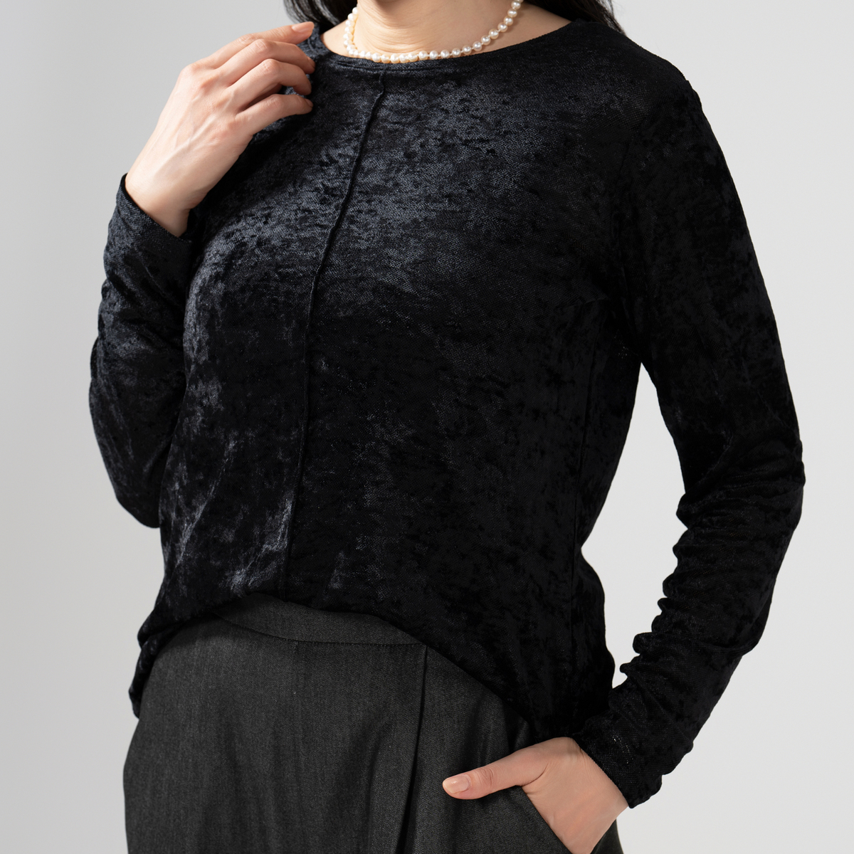 クラッシュベロアのシアーな質感と独特な光沢が、着るだけで上品な印象を与えるプルオーバー。トレンド感を取り入れながら、調節の難しい季節の変わり目にも活躍します