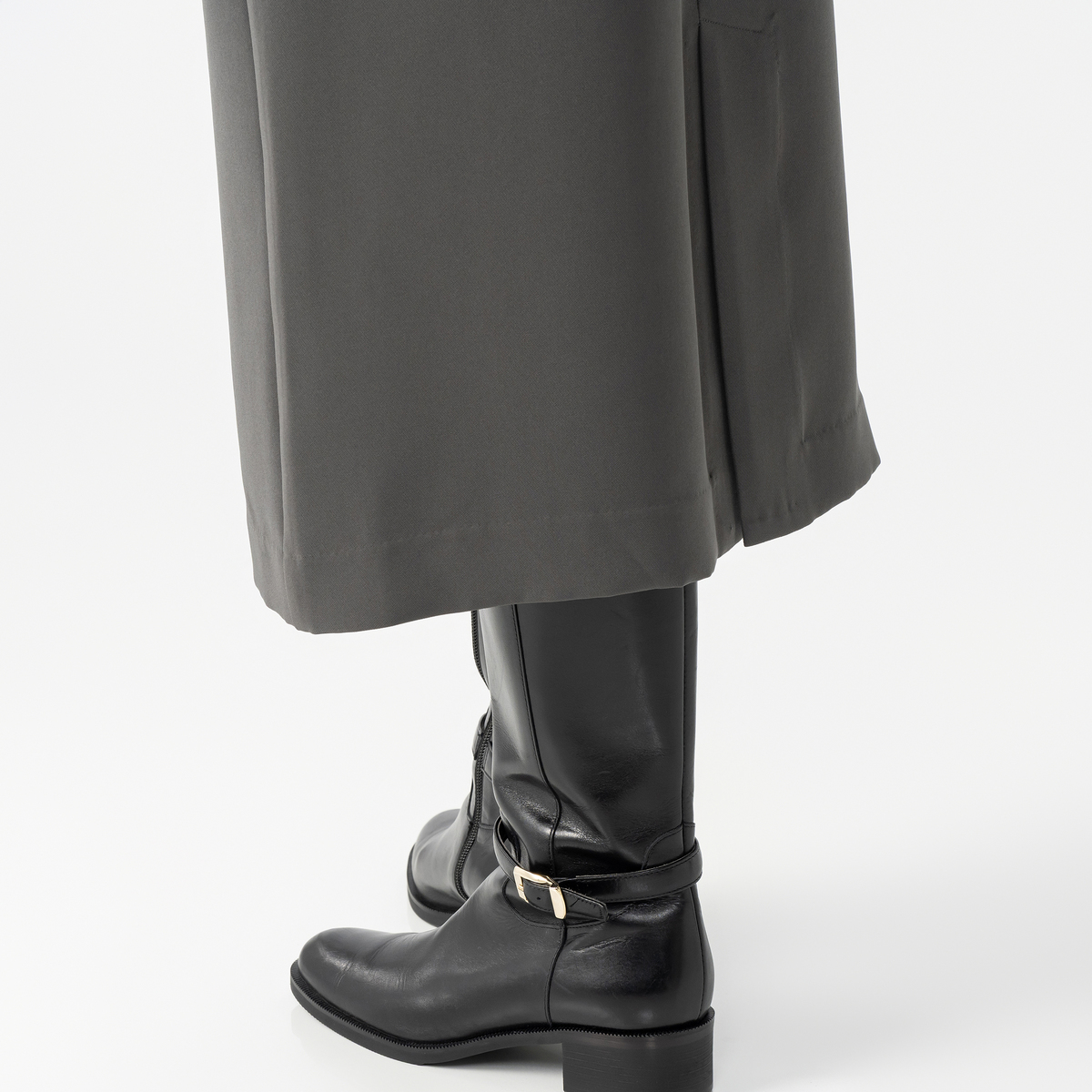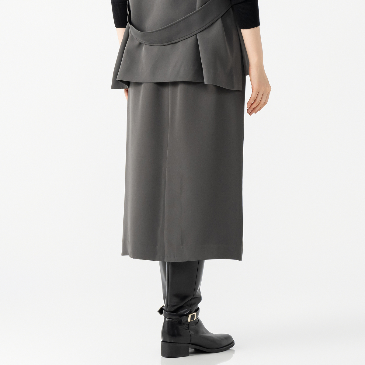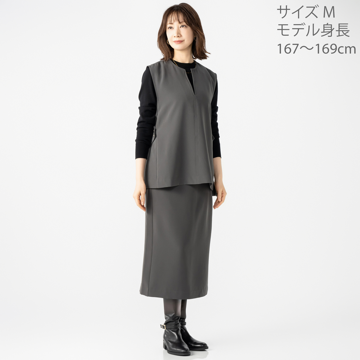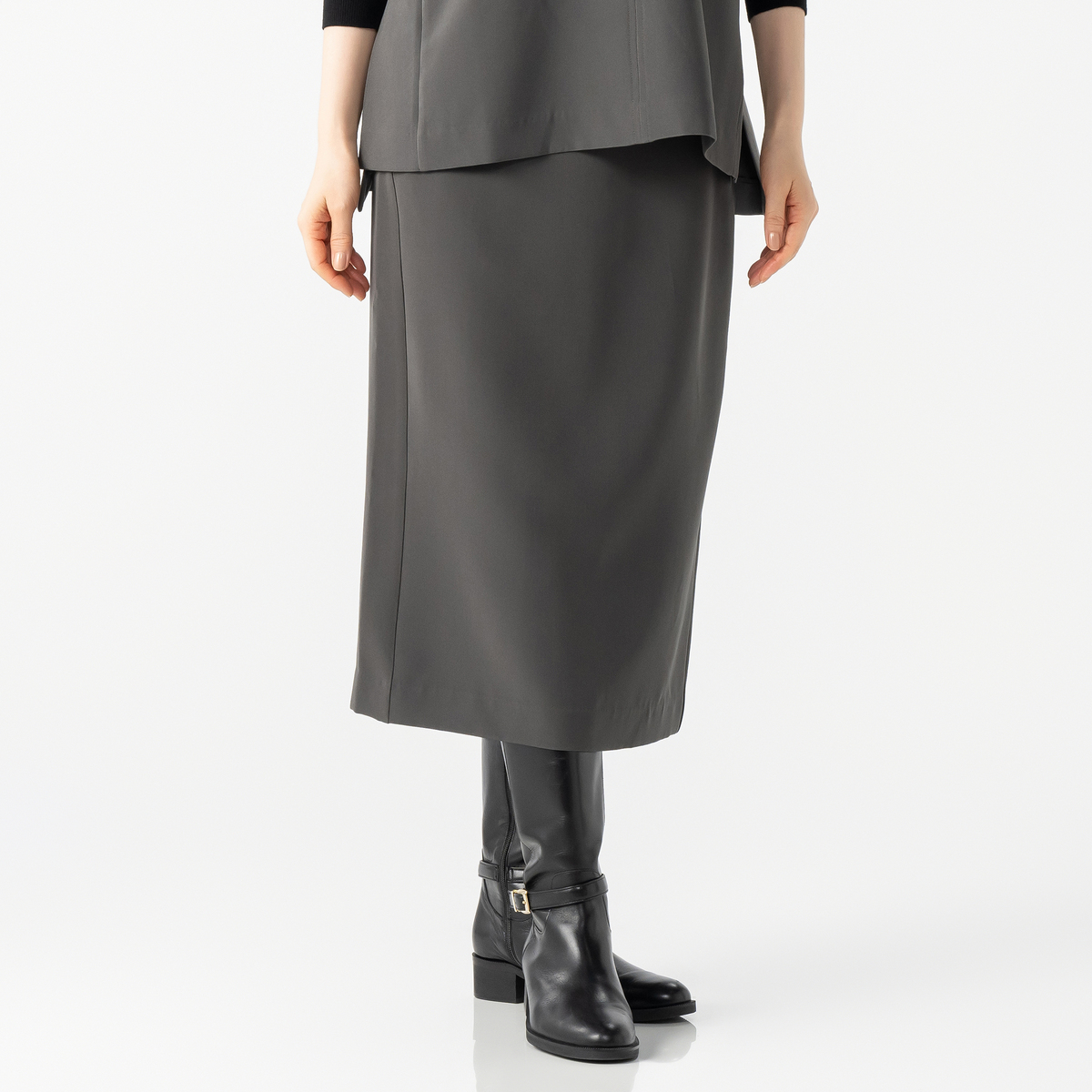 タテヨコに伸びるストレッチ素材を使用したナロースカート。毛玉になりにくい素材で、二重織りのほどよいハリコシと落ち感が、すっきりとしたシルエットを美しく引き立てます。後ろ中心にはベンツを施し、穿き心地よく仕上げました