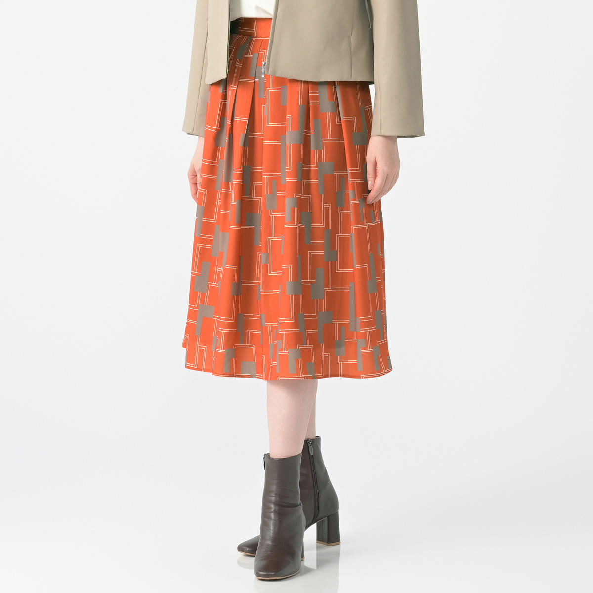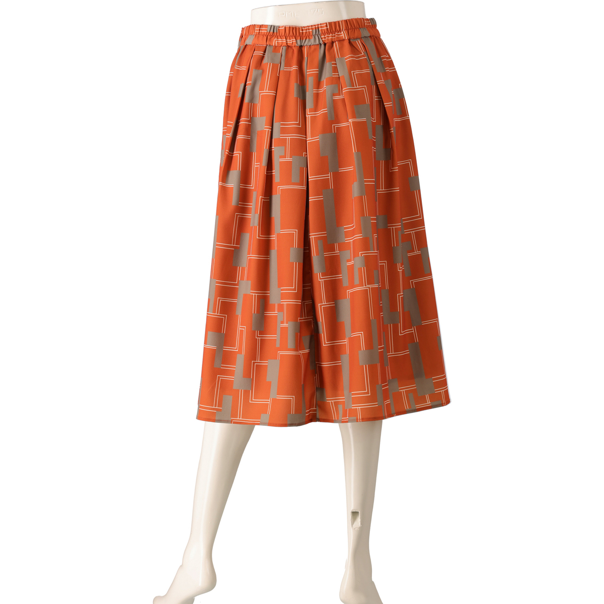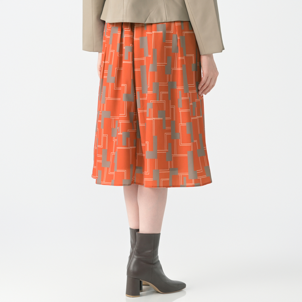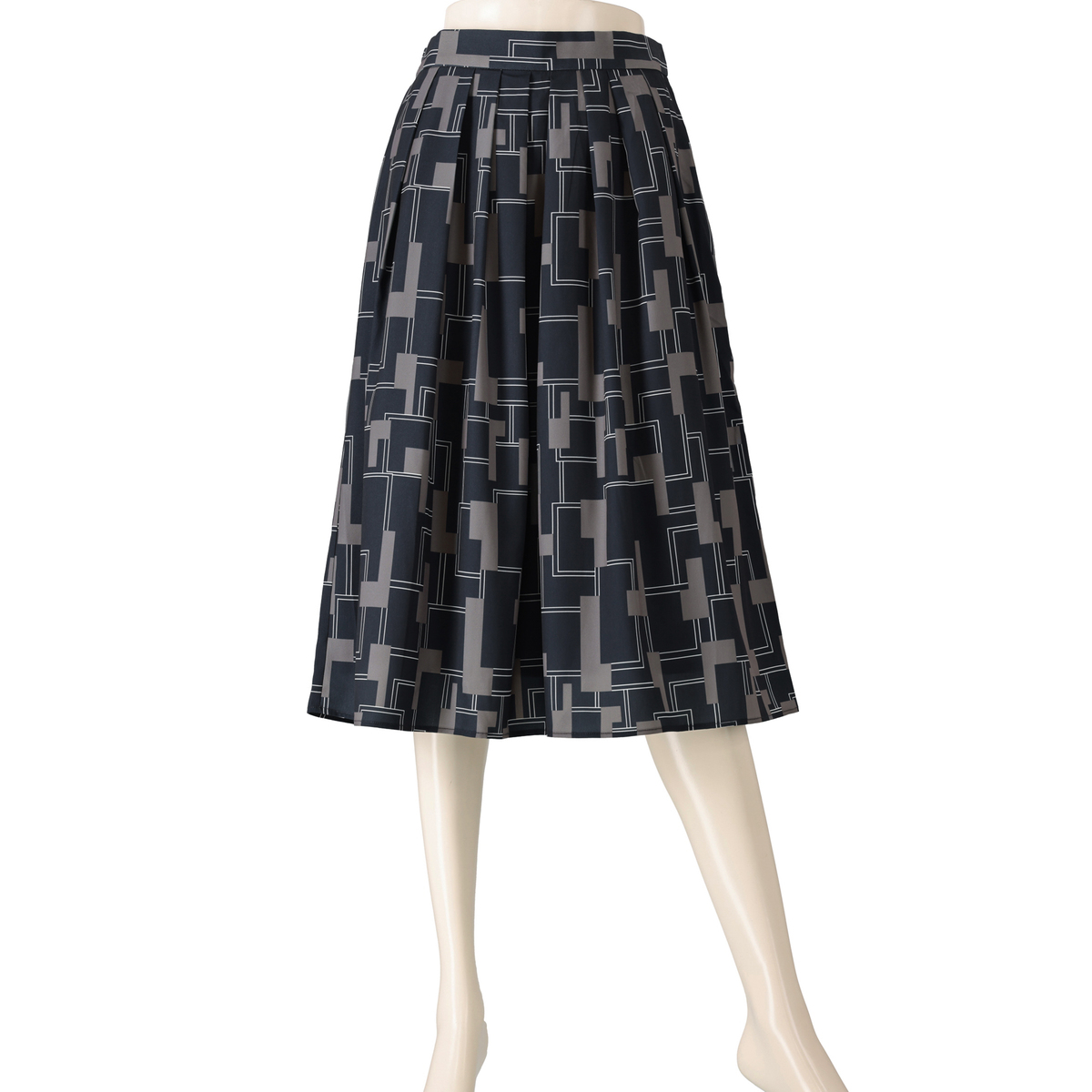 ファイユ素材に印象的なジオメトリック柄をプリント。総丈は70cmのミモレ丈です。なめらかな肌触りで落ち感が美しく、動くたびに上品な揺れが楽しめます