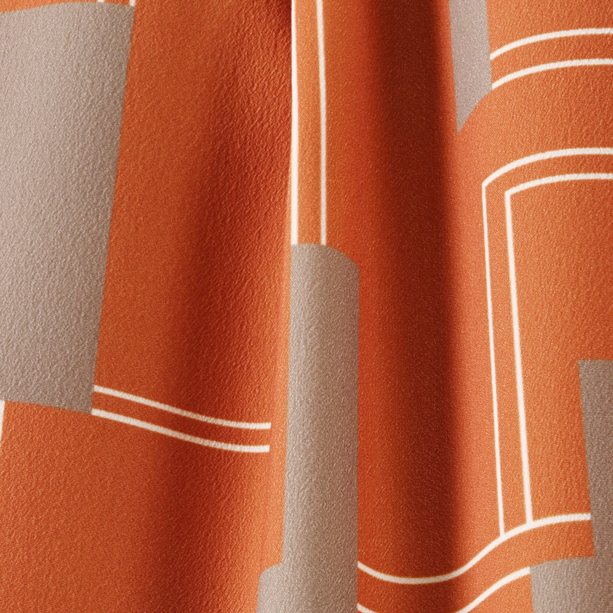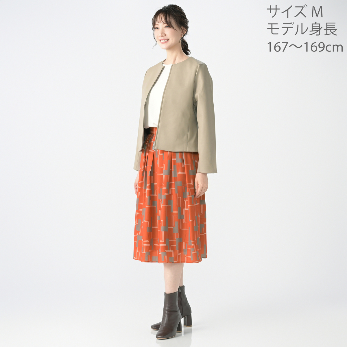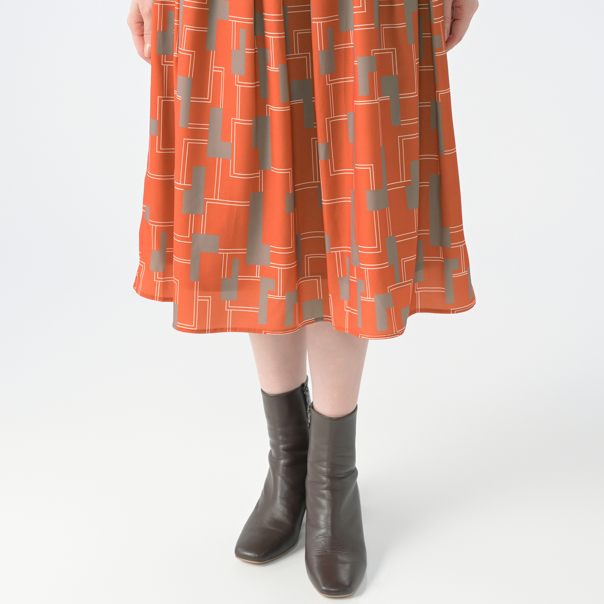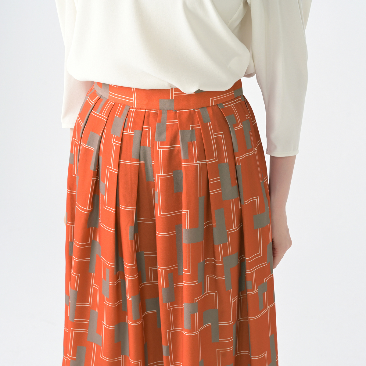 ファイユ素材に印象的なジオメトリック柄をプリント。総丈は70cmのミモレ丈です。なめらかな肌触りで落ち感が美しく、動くたびに上品な揺れが楽しめます