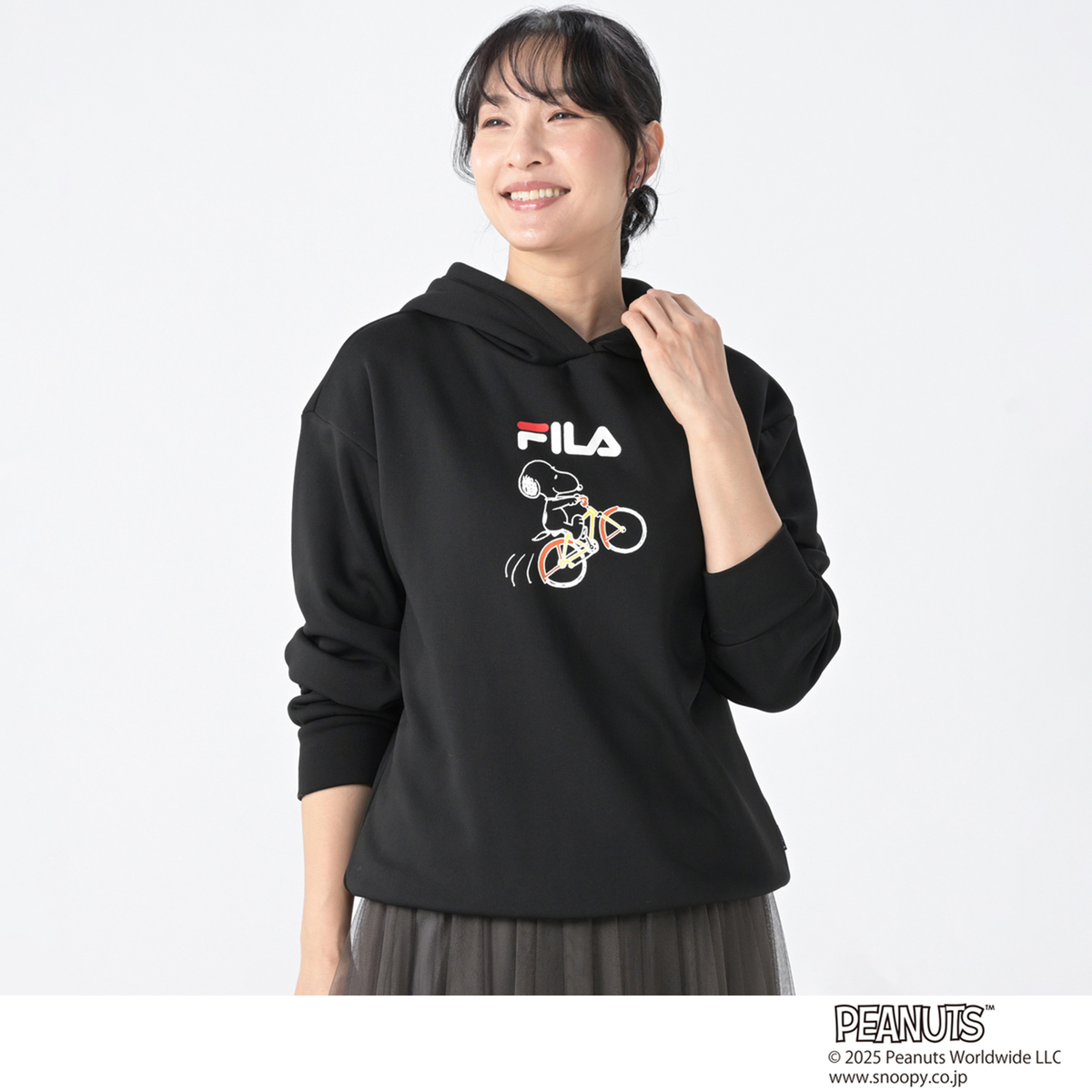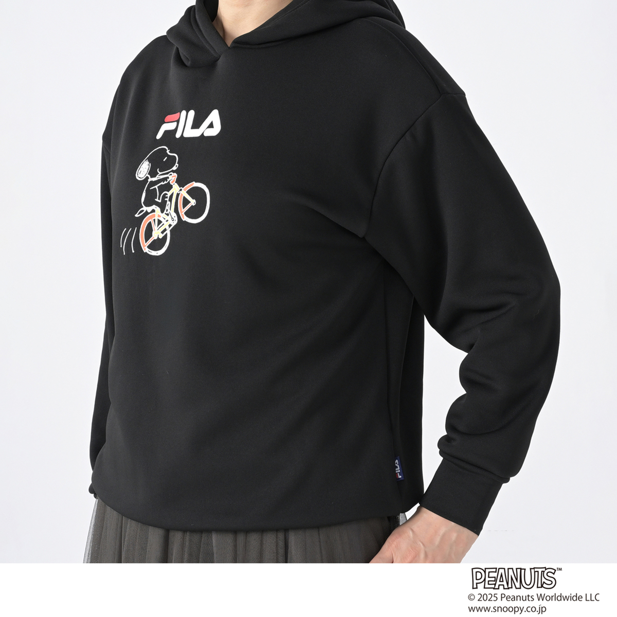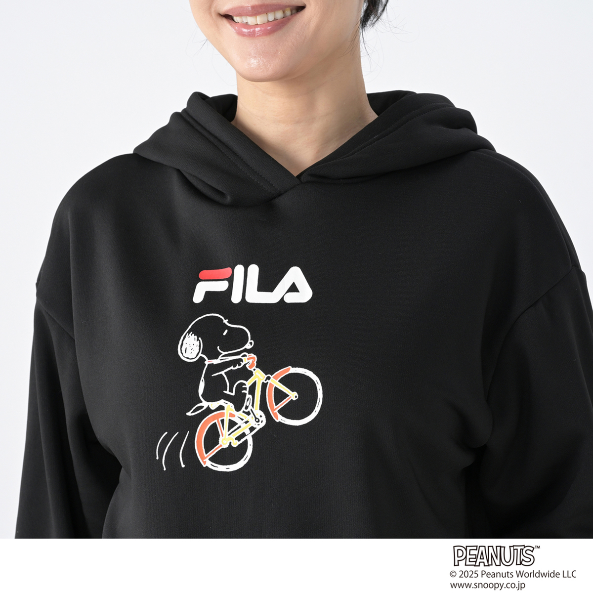 FILAと世界的人気キャラクターのスヌーピーとのコラボレーションパーカー。人気ブランドのコラボレーションにより生まれた、ゆるっとあったかシルエットの大人可愛いスヌーピーコラボパーカーです。本体生地はさらっとした肌触りで、裏面はふんわりとあたたかな裏シャギー素材を使用。ストレッチが効いて動きやすく、リラックス感のある着心地です