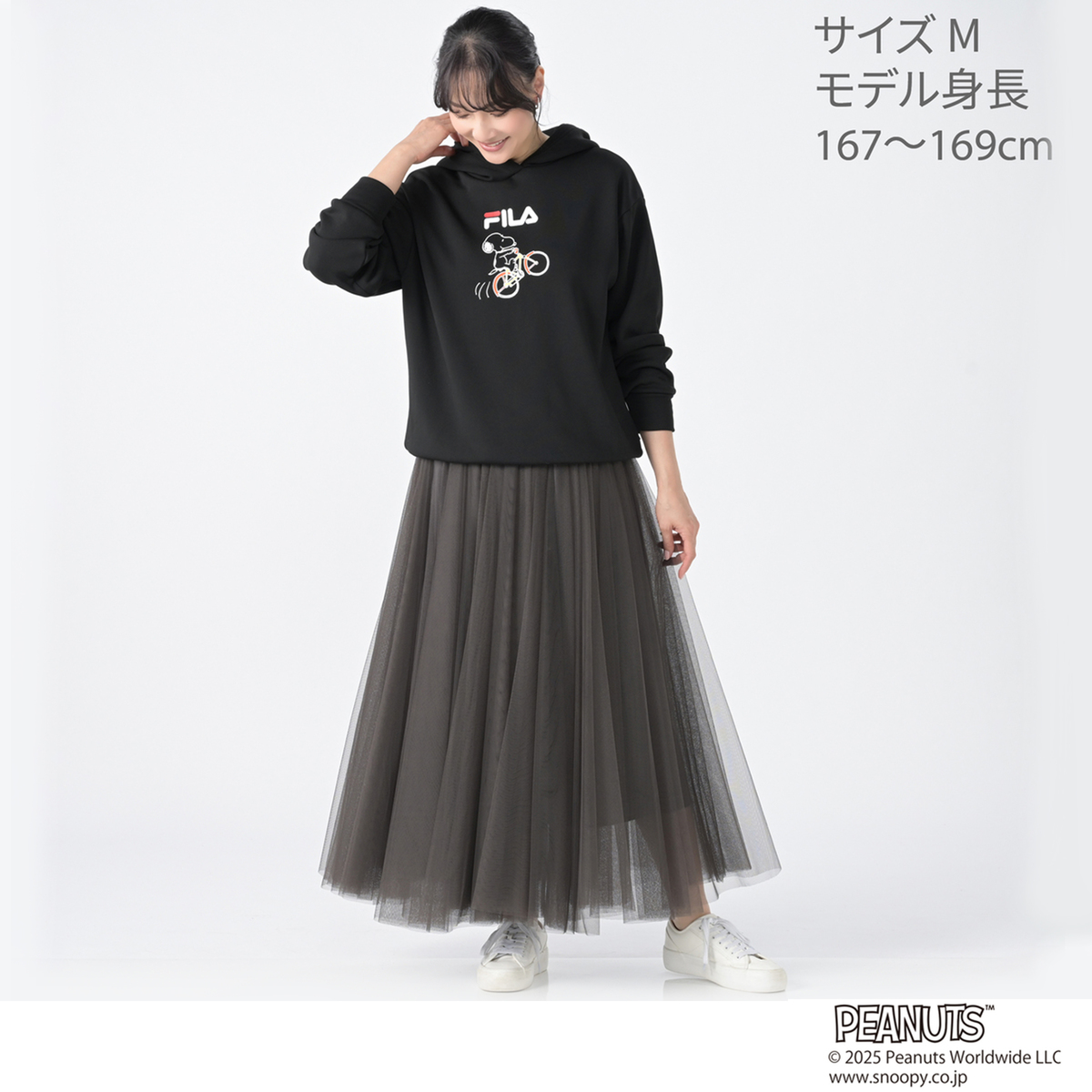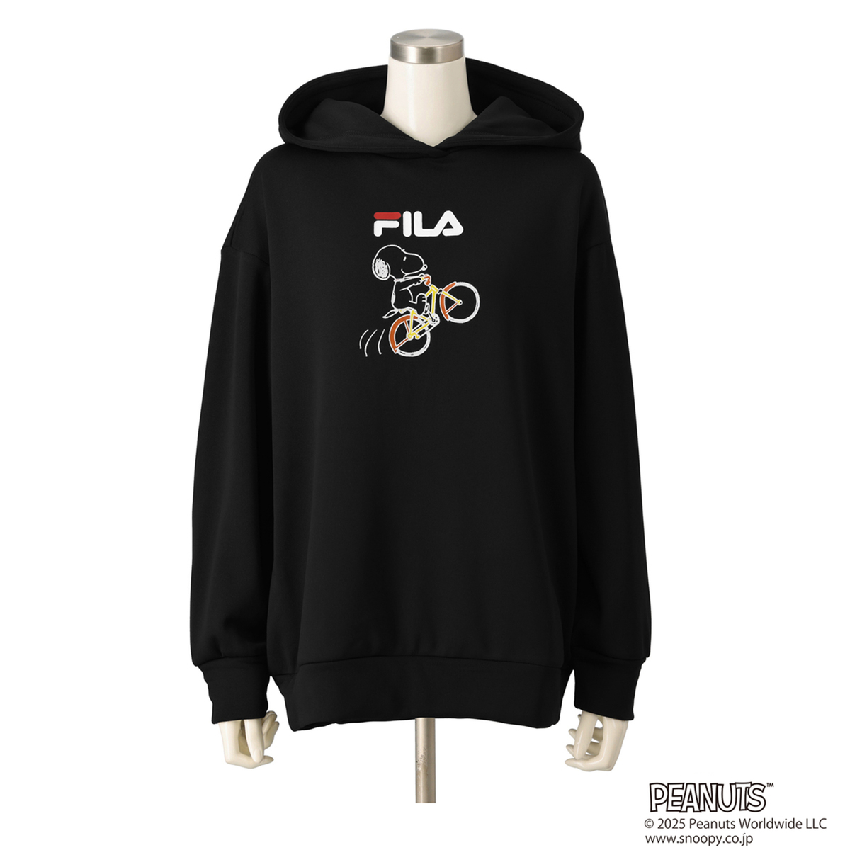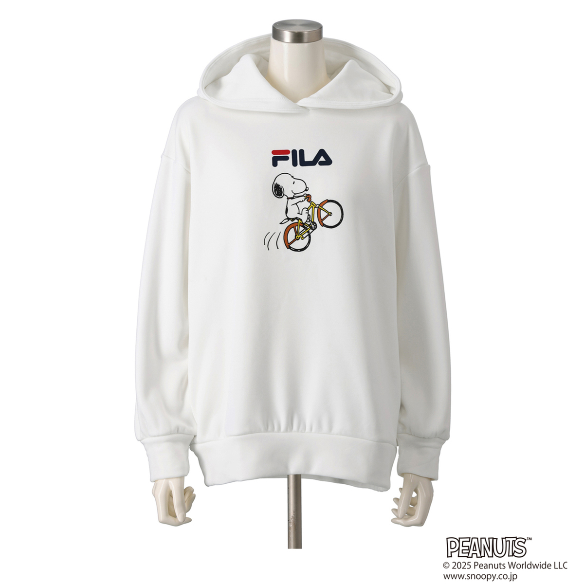 FILAと世界的人気キャラクターのスヌーピーとのコラボレーションパーカー。人気ブランドのコラボレーションにより生まれた、ゆるっとあったかシルエットの大人可愛いスヌーピーコラボパーカーです。本体生地はさらっとした肌触りで、裏面はふんわりとあたたかな裏シャギー素材を使用。ストレッチが効いて動きやすく、リラックス感のある着心地です