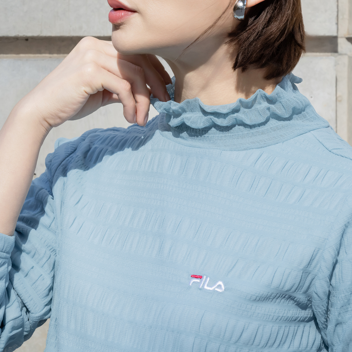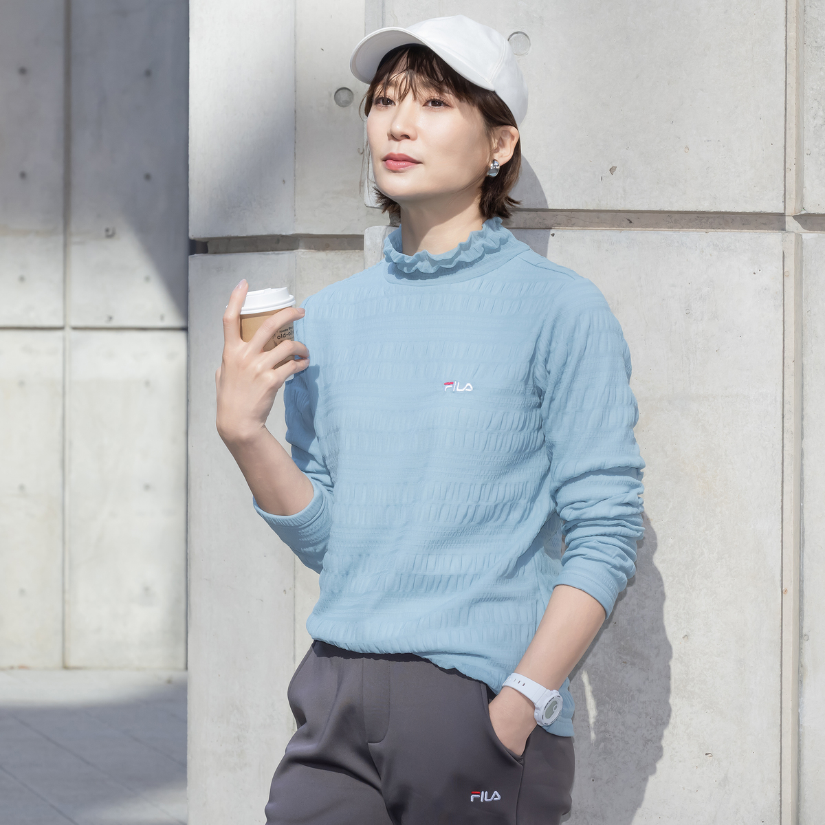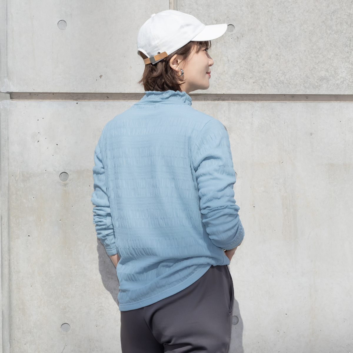 伸縮性のある素材で、動きやすく快適。ネック部分はシャーリング生地のみを使用し、透け感が顔周りをすっきりと見せ、冬の装いに軽やかな抜け感を添えます。1枚でもレイヤードでも活躍し、スウェットやニットに重ねれば、首元のシアー感が洗練されたこなれ感を演出