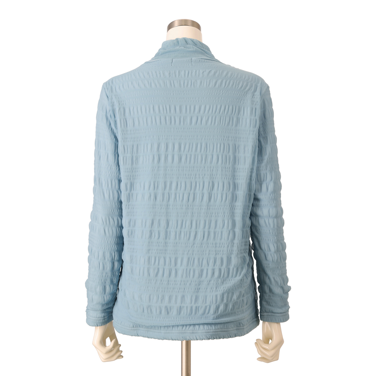 異素材の組合せで、ふんわりとした表情を楽しめるプルオーバー。表面は凸凹感のあるシャーリングレースで、ほんのり透け感が女性らしい印象に。裏側には吸湿発熱素材を使用し、暖かく快適な着心地です。さらにUVカット機能付きで、日差し対策も叶えます