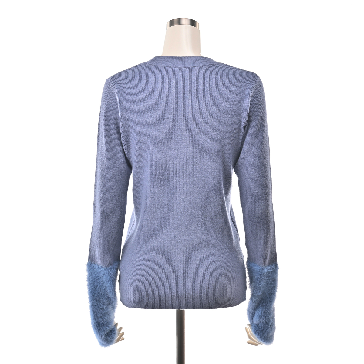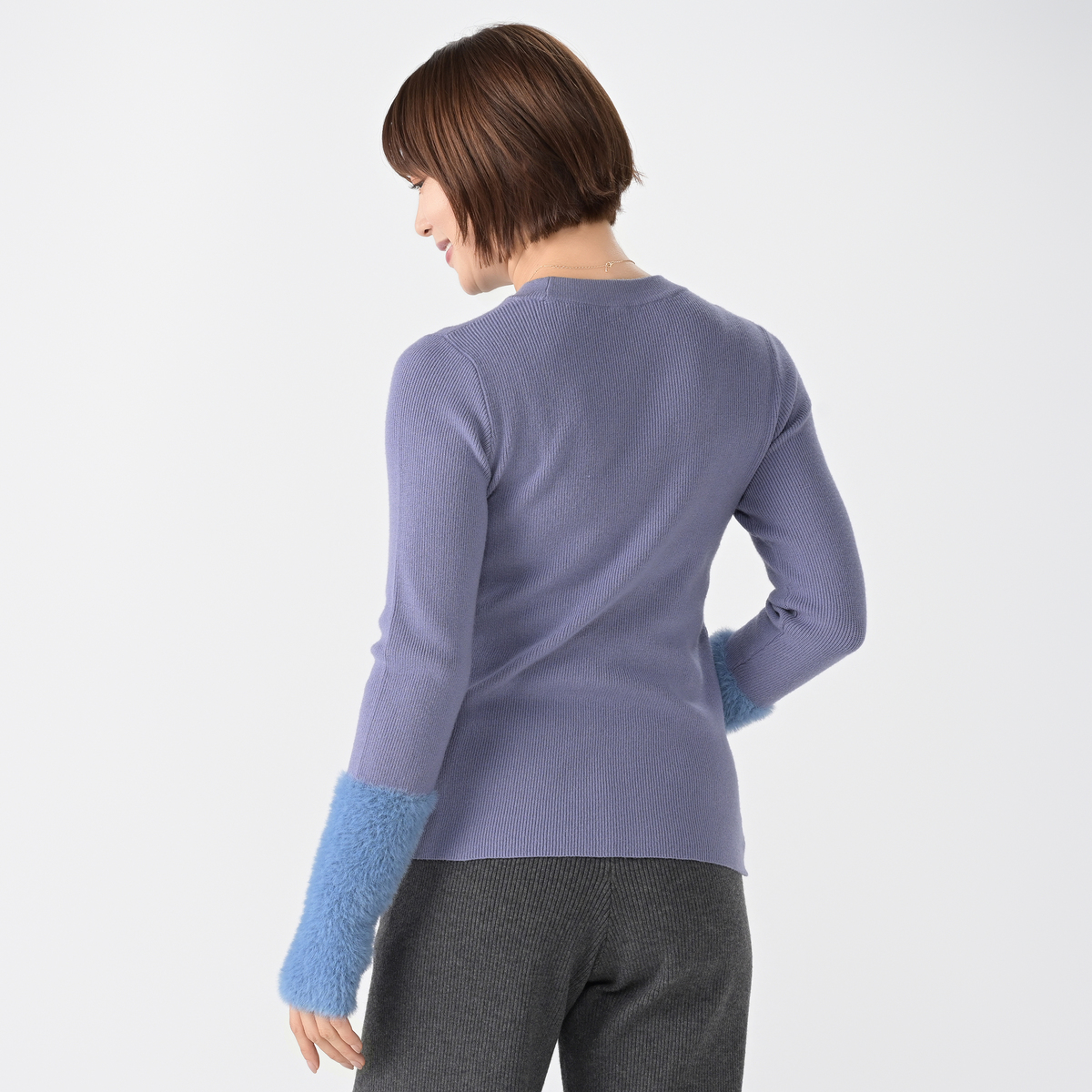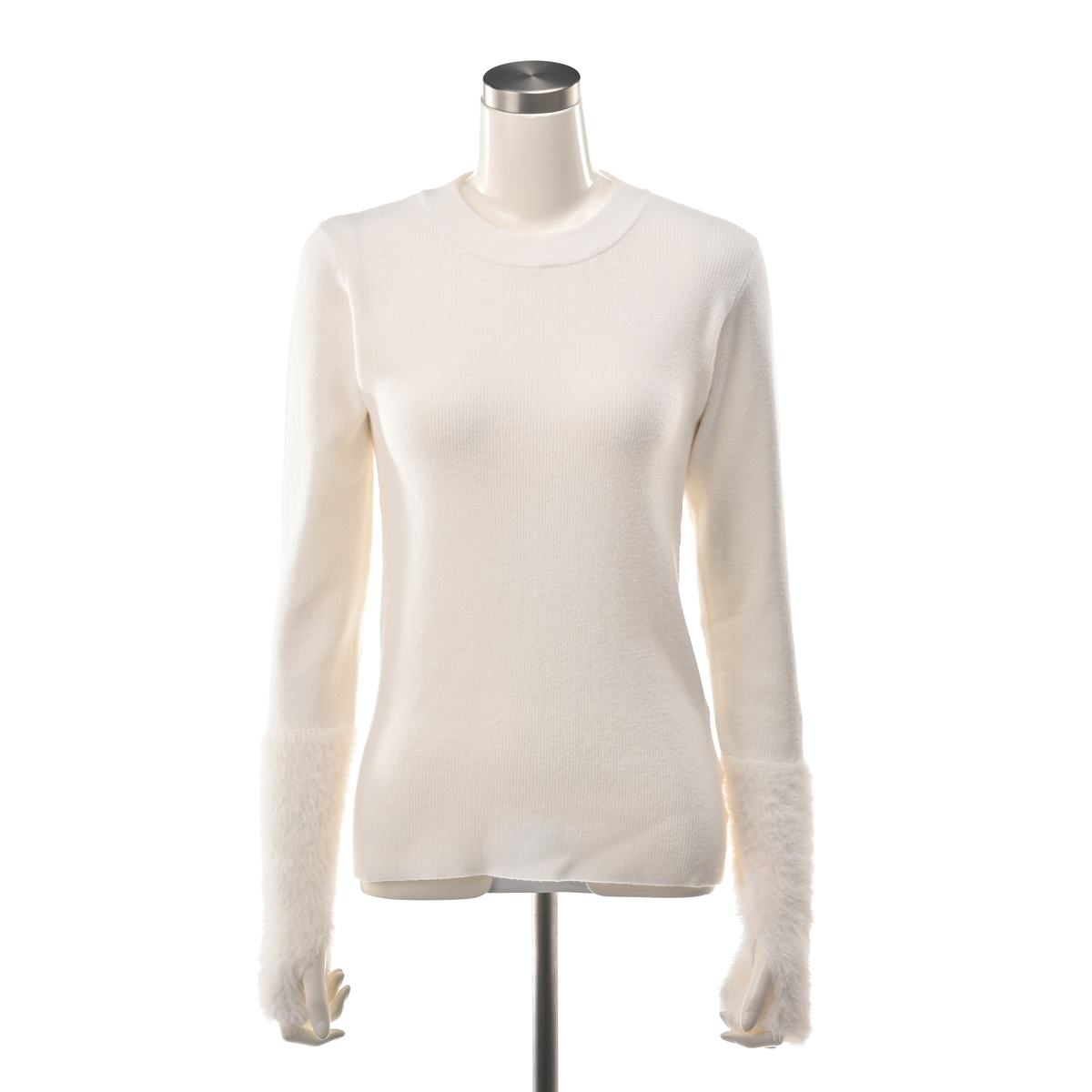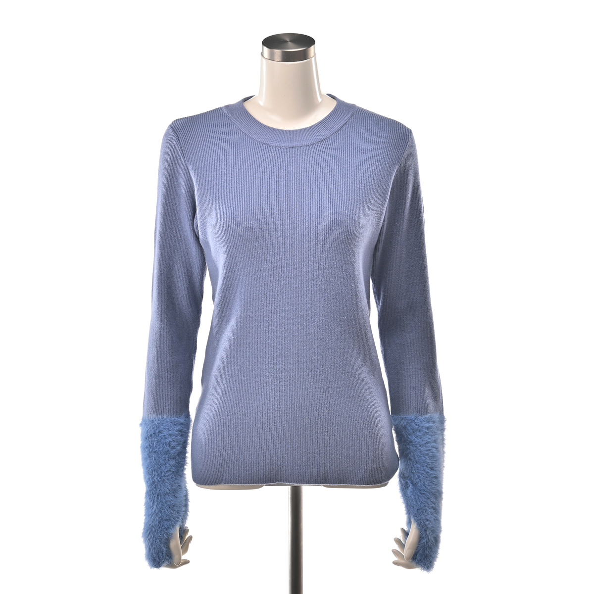 フェザーヤーンを袖口にあしらったプルオーバー。丸首の衿ぐりはリブをダブル編みに仕立て、袖口は指穴付きで手首周りにアームウォーマーの様なボリューム感に。体をほっそりと見せてくれる細リブと、フェザーヤーン素材を組合せた上品で着映えする1枚です