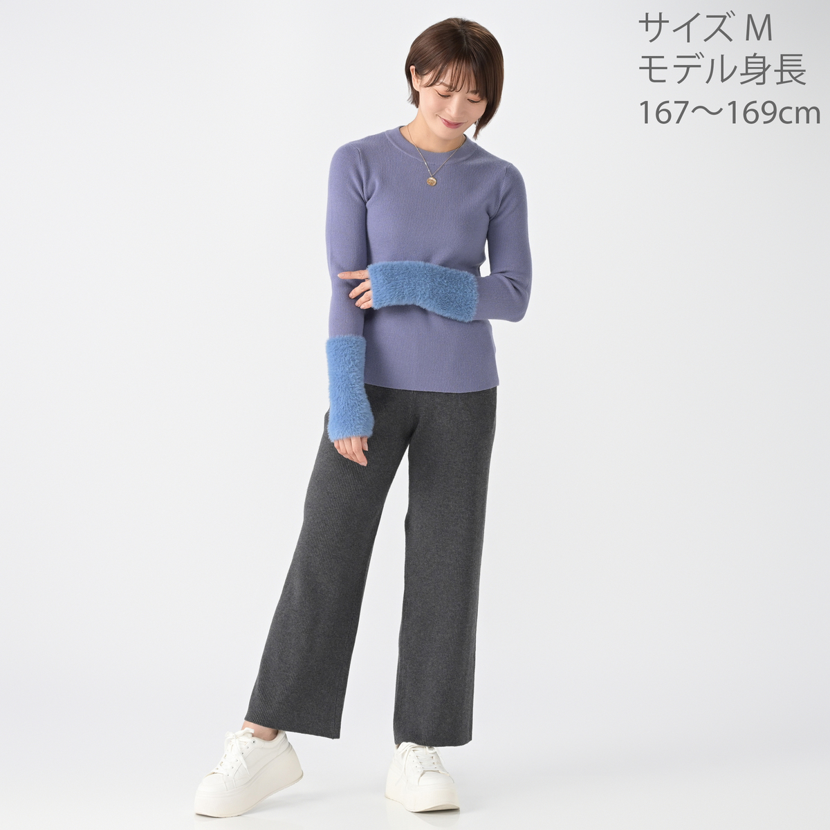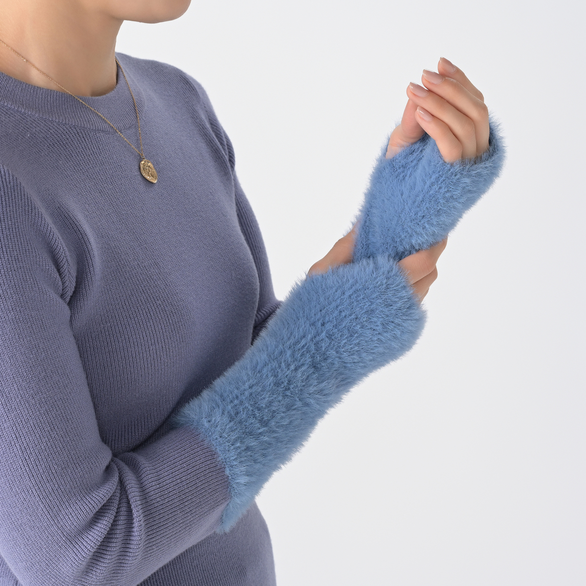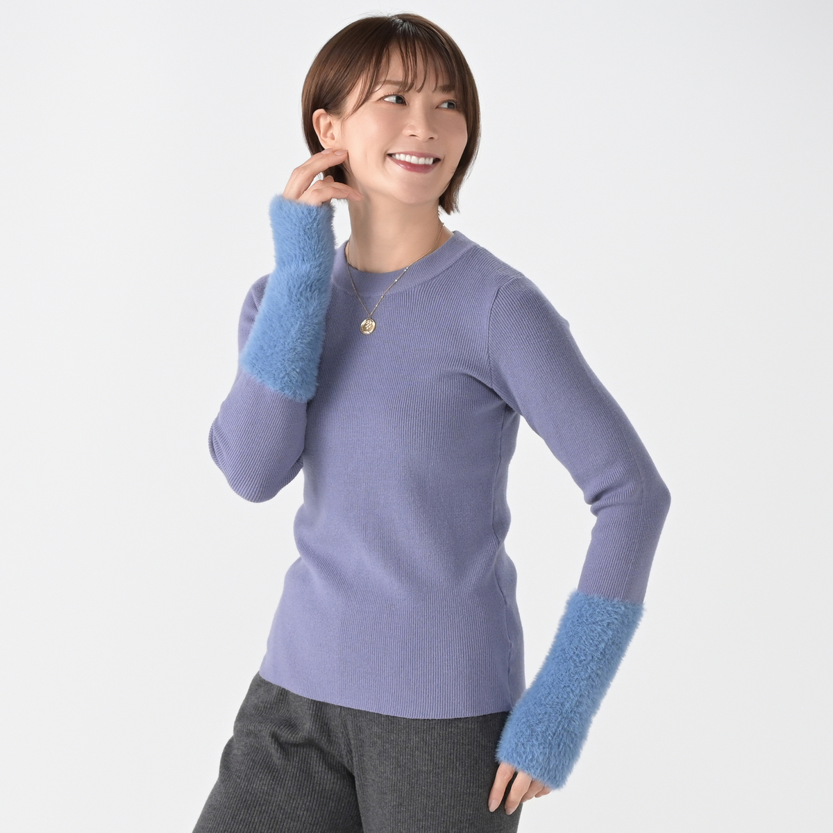本体は滑らかでもちもちした肌触りに加え、伸び感が良い細リブ編みニットを使用。袖口はフェザーヤーンをふわふわに編み上げて、ファーの様な肌当たりに。紫外線を防ぐ機能も備わっています