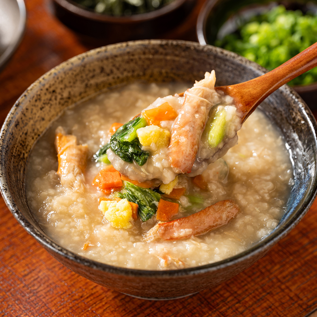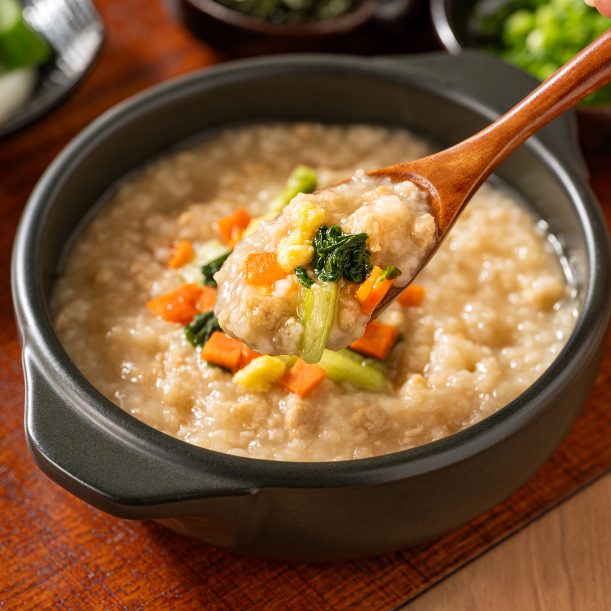 乾燥小松菜と乾燥人参、フリーズドライ卵加工品が別小袋で付いています。後から混ぜることで、野菜のシャッキリ食感も感じやすく、卵のふわふわまろやかさも同時に広がり、本格的な雑炊に仕上がります