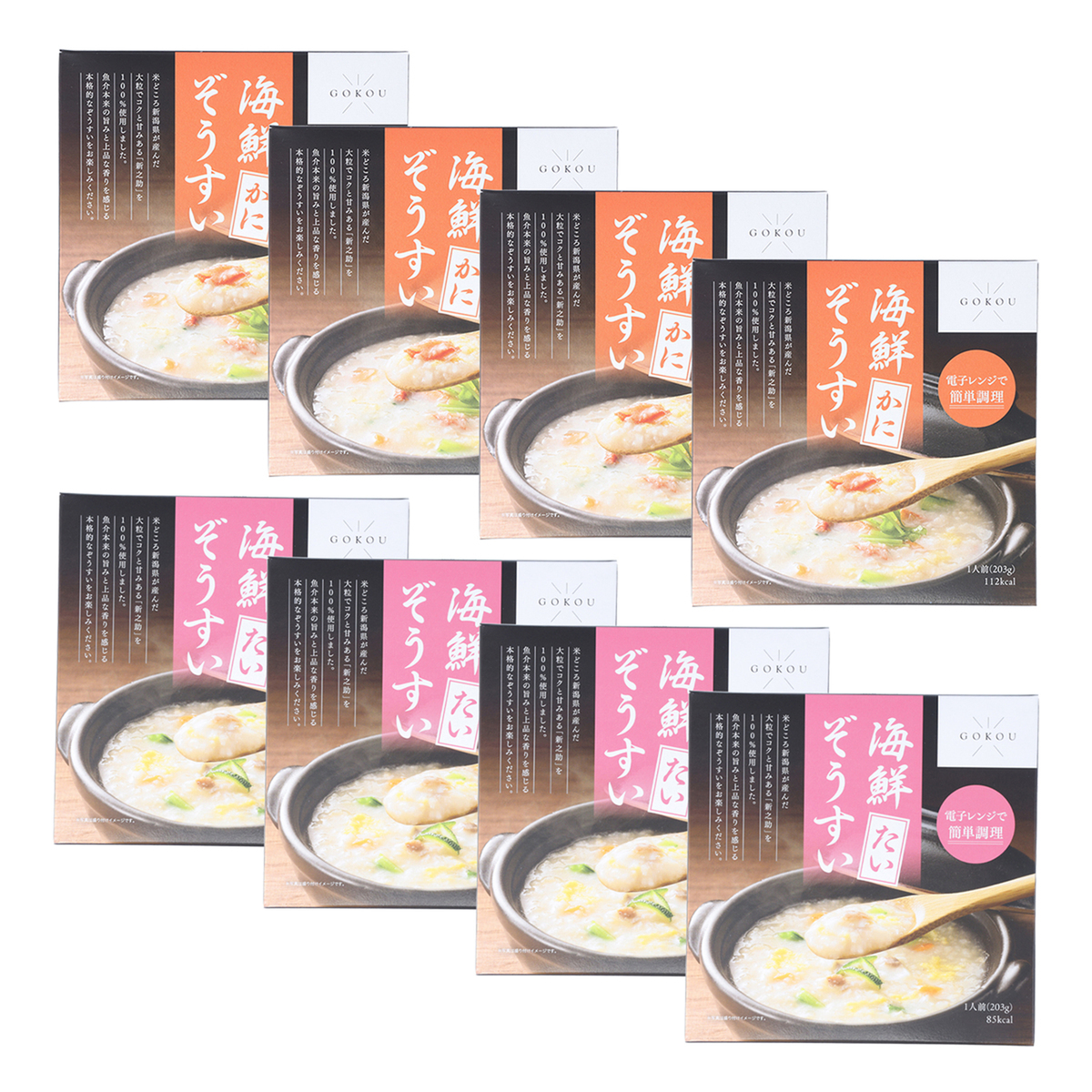 紅ずわいがにや鯛の旨みが広がる海鮮雑炊2種8食セット。五泉市の良質な地下水と、数ある新潟産米から厳選した「新之助」を100%使用。ほどよい粒感で噛むほどに甘み豊かなお米は、魚介(かに、たい)との相性も良いのが特徴です