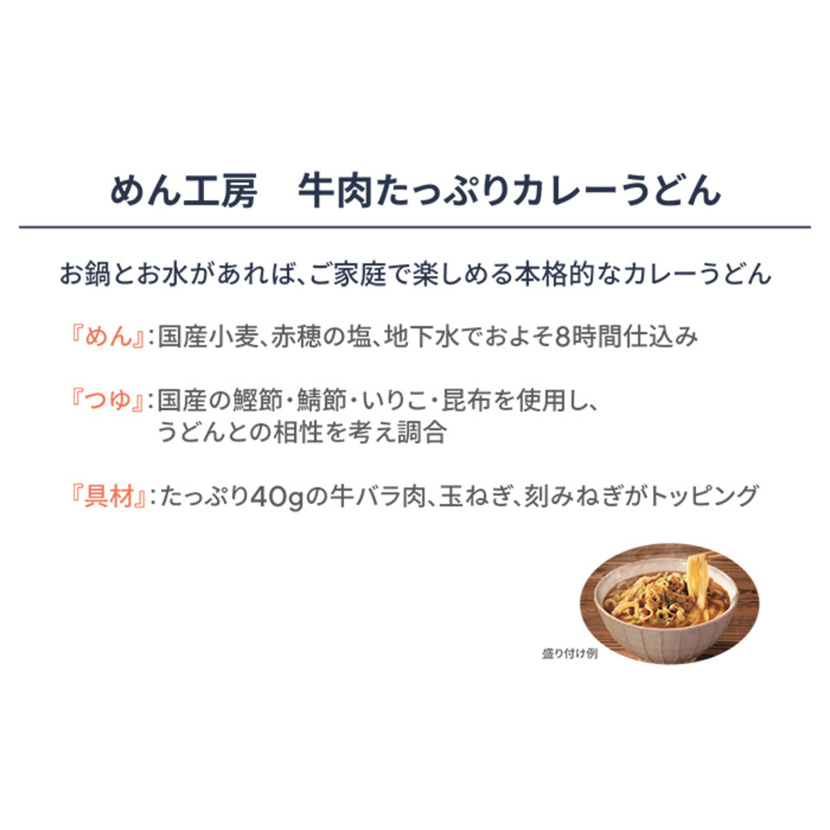 麺は国産の小麦粉と赤穂の塩と水のみ。熟練の職人がその日、その時間で変わる生地の状態を確かめながら仕上げます。具材はたっぷり40gの牛肉、玉ねぎ、刻みネギの3種類。カレーうどん本来の味を大切にするため、シンプルな具材にこだわりました