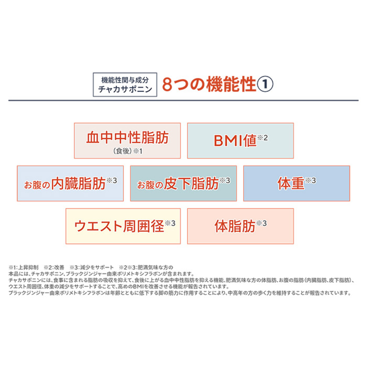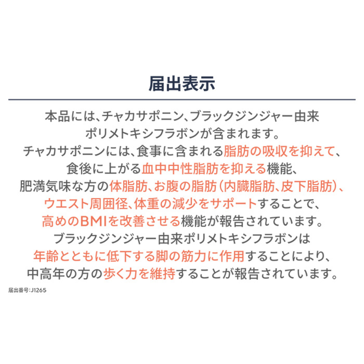 本品には、チャカサポニン、ブラックジンジャー由来ポリメトキシフラボンが含まれます。チャカサポニンには、食事に含まれる脂肪の吸収を抑えて、食後に上がる血中中性脂肪を抑える機能、肥満気味な方の体脂肪、お腹の脂肪(内臓脂肪、皮下脂肪)、ウエスト周囲径、体重の減少をサポートすることで、高めのBMIを改善させる機能が報告されています。ブラックジンジャー由来ポリメトキシフラボンは年齢とともに低下する脚の筋力に作用することにより、中高年の方の歩く力を維持することが報告されています