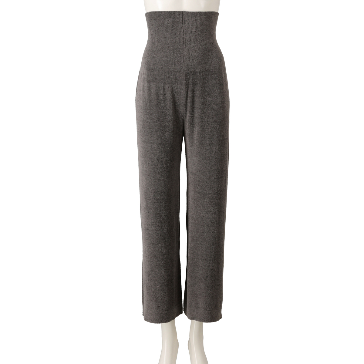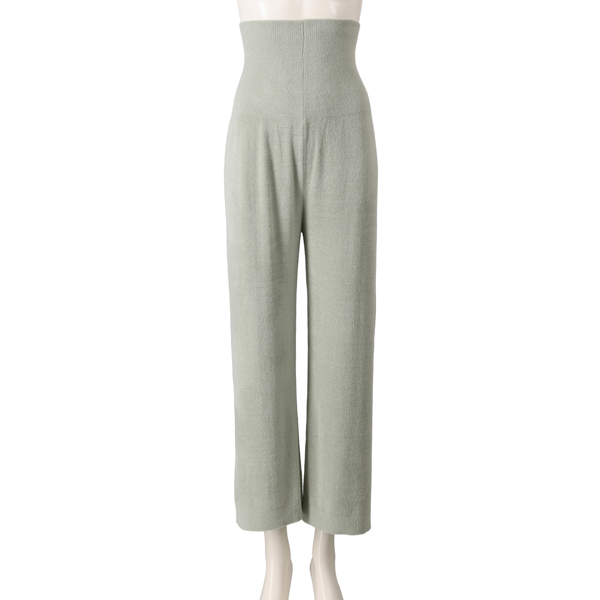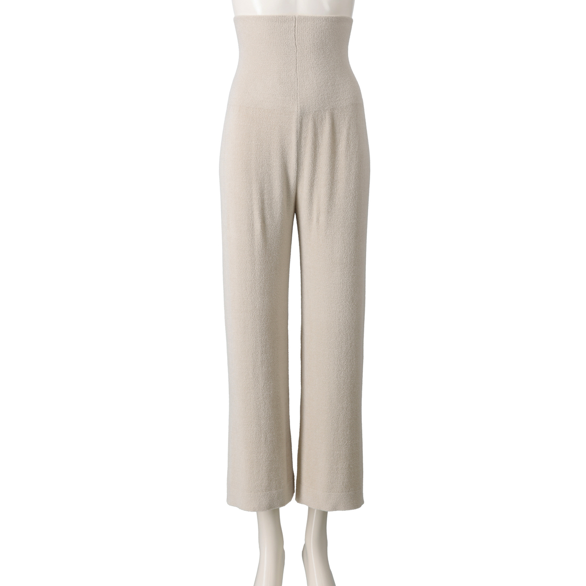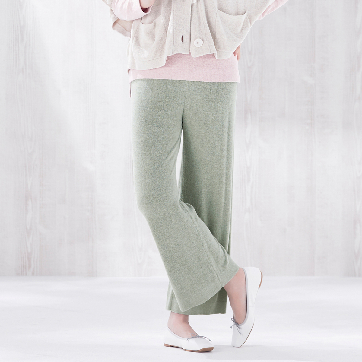 腹巻きが一体化したデザインでウエストがもたつきにくいワイドパンツ。ウエスト部分は薄いので、すっきりとした印象です。ふっくらと空気を含むモール糸を使用し、部位により編み方を変え、縫い代のない編み続き仕様で肌触り良く仕上げています