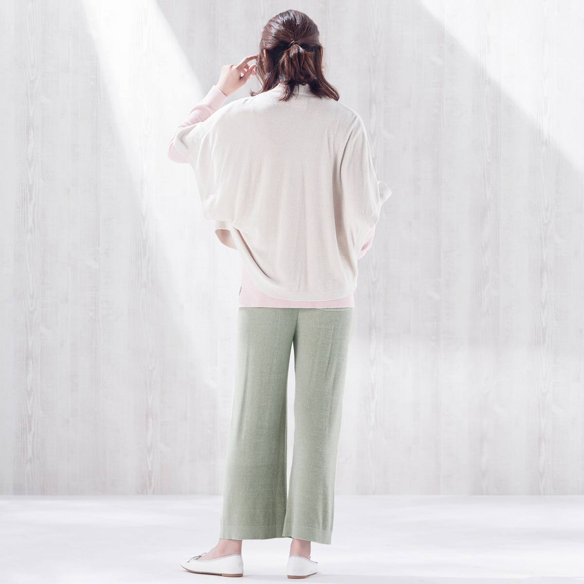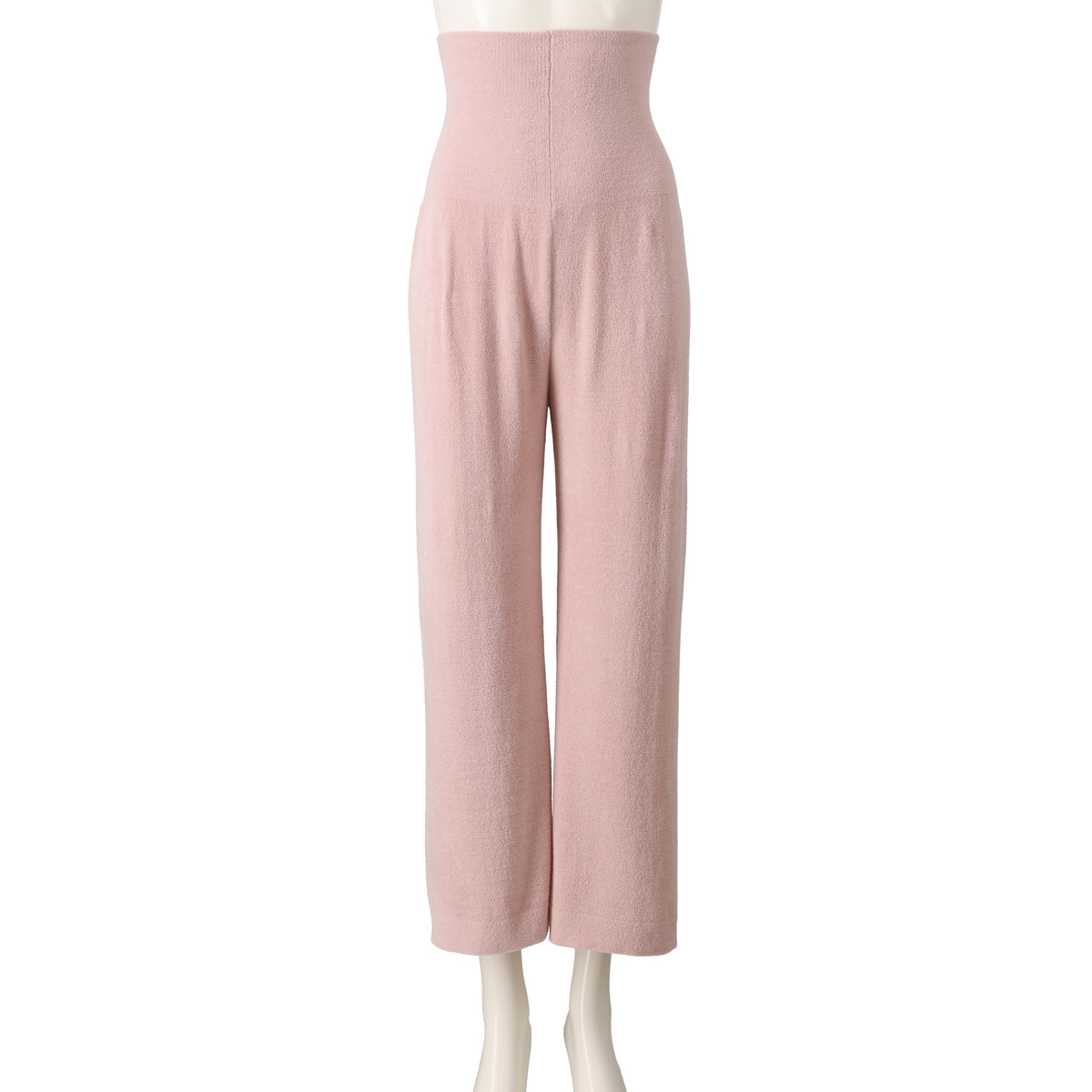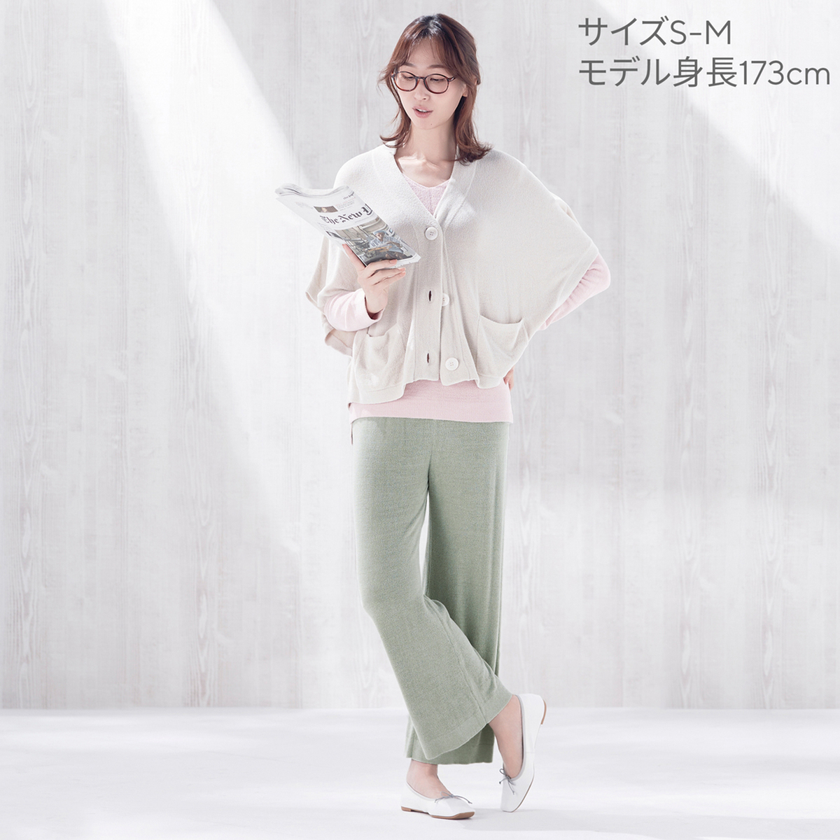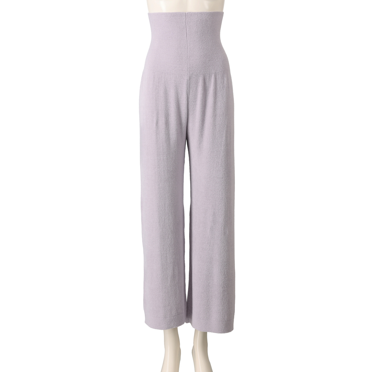 腹巻きが一体化したデザインでウエストがもたつきにくいワイドパンツ。ウエスト部分は薄いので、すっきりとした印象です。ふっくらと空気を含むモール糸を使用し、部位により編み方を変え、縫い代のない編み続き仕様で肌触り良く仕上げています