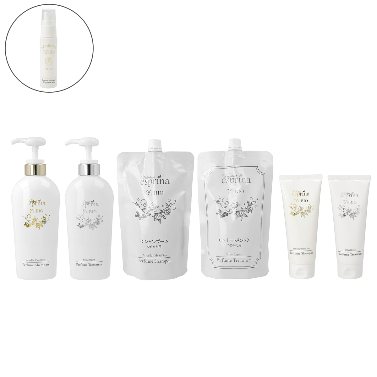 [セット内容] ・美BIO 濃密炭酸 ミセラーヘッドスパ パフューム シャンプー 500ml ・美BIO 集中補修 シルキーリペア パフューム トリートメント 500ml ・美BIO 濃密炭酸 ミセラーヘッドスパ パフューム シャンプー レフィル 450ml ・美BIO 集中補修 シルキーリペア パフューム トリートメント レフィル 450ml ・美BIO 濃密炭酸 ミセラーヘッドスパ パフューム シャンプー 150ml ・美BIO 集中補修 シルキーリペア パフューム トリートメント 150ml ・美BIO プロポーズパフュームド フレグランスミスト 30ml (プレゼント) *5)皮膚・ヘアコンディショニング剤(頭皮を健やかに保つ、ハリ・コシ、ツヤ・キメ) *6)アルガニアスピノサ核油、ツバキ種子油ヘアコンディショニング剤(うるおい、ハリ・コシ、枝毛、切毛、裂毛防止) *7)全て皮膚・ヘアコンディショニング剤 *8)シャンプー:皮膚・ヘアコンディショニング剤、トリートメント:ヘアコンディショニング剤(物理的補修・保護、うるおい、ハリ・コシ、ツヤ) [使用方法] シャンプー:髪をよく湿らせてから適量を手に取り、髪全体にいきわたらせ指の腹でやさしく汚れをもみ出すように地肌と髪全体を洗います トリートメント:シャンプーの後、軽く水気を切り適量を手に取り、髪全体にいきわたらせ毛先の方からもみこむように髪になじませます。十分にもみ込んだ後、すすいでください [注意事項] ※お肌に異常が生じていないかよく注意して使用してください ※お肌に合わないときは、ご使用をおやめください ※使用中、赤み、はれ、かゆみ、刺激、色抜け(白斑等)や黒ずみ等の異常があらわれた場合は使用を中止し、皮フ科専門医等にご相談ください ※目に入らないようにご注意ください ※直接水のかかる状態でポンプを押さないでください ※乳幼児の手の届かないところに保管してください ※高温・多湿・直射日光を避け、常温で保管してください 【韓国製】 [成分] ミセラーヘッドスパパフュームシャンプー(本体):水、イタヤカエデ樹液、ココイルアラニンNa、コカミドプロピルベタイン、ヤシ油脂肪酸PEG-7グリセリル、ラウロイルメチルアラニンNa、香料、ヒドロキシプロピルスルホン酸ラウリルグルコシドNa、コカミドMEA、ジステアリン酸PEG-150、塩化Na、乳酸桿菌/メドハギ葉/茎発酵液、 レウコノストック細胞外小胞、アナツバメ巣エキス、酢、シリカ、パンテノール、コメヌカ発酵液、カイコまゆエキス、ヒアルロン酸クロスポリマーNa、ヒアルロン酸Na、ヒアルロン酸、加水分解ヒアルロン酸、加水分解ヒアルロン酸Na、ヒアルロン酸ヒドロキシプロピルトリモニウム、ヒアルロン酸K、アセチルヒアルロン酸Na、アルガニアスピノサ核油、ツバキ種子油、カミツレ花エキス、フリージアエキス、 セイヨウハッカ葉エキス、タイマツバナ葉エキス、ローズマリー葉エキス、ラベンダーエキス、ルリジサエキス、マルバアサガオエキス、ヒマワリエキス、ライラックエキス、セージエキス、ツバキ花エキス、キバナコスモス花/葉/茎エキス、フリージアアルバ花エキス、ヤマザクラ花エキス、イワギクエキス、ユキザサエキス、スミレ花エキス、キクニガナ葉エキス他 シルキーリペアパフュームトリートメント(本体):水、ジメチコン、イタヤカエデ樹液、シクロペンタシロキサン、グリセリン、香料、ステアリン酸グリセリル、セテアリルアルコール、ベヘントリモニウムクロリド、乳酸桿菌/メドハギ葉/茎発酵液、レウコノストック細胞外小胞、アナツバメ巣エキス、酢、シリカ、パンテノール、コメヌカ発酵液、カイコまゆエキス、ヒアルロン酸クロスポリマーNa、 ヒアルロン酸Na、ヒアルロン酸、加水分解ヒアルロン酸、加水分解ヒアルロン酸Na、ヒアルロン酸ヒドロキシプロピルトリモニウム、ヒアルロン酸K、アセチルヒアルロン酸Na、アルガニアスピノサ核油、ツバキ種子油、オリーブ果実油、カミツレ花エキス、フリージアエキス、 セイヨウハッカ葉エキス、タイマツバナ葉エキス、ローズマリー葉エキス、ラベンダーエキス、ルリジサエキス、マルバアサガオエキス、ヒマワリエキス、ライラックエキス、セージエキス、ツバキ花エキス、キバナコスモス花/葉/茎エキス、フリージアアルバ花エキス、ヤマザクラ花エキス、イワギクエキス他