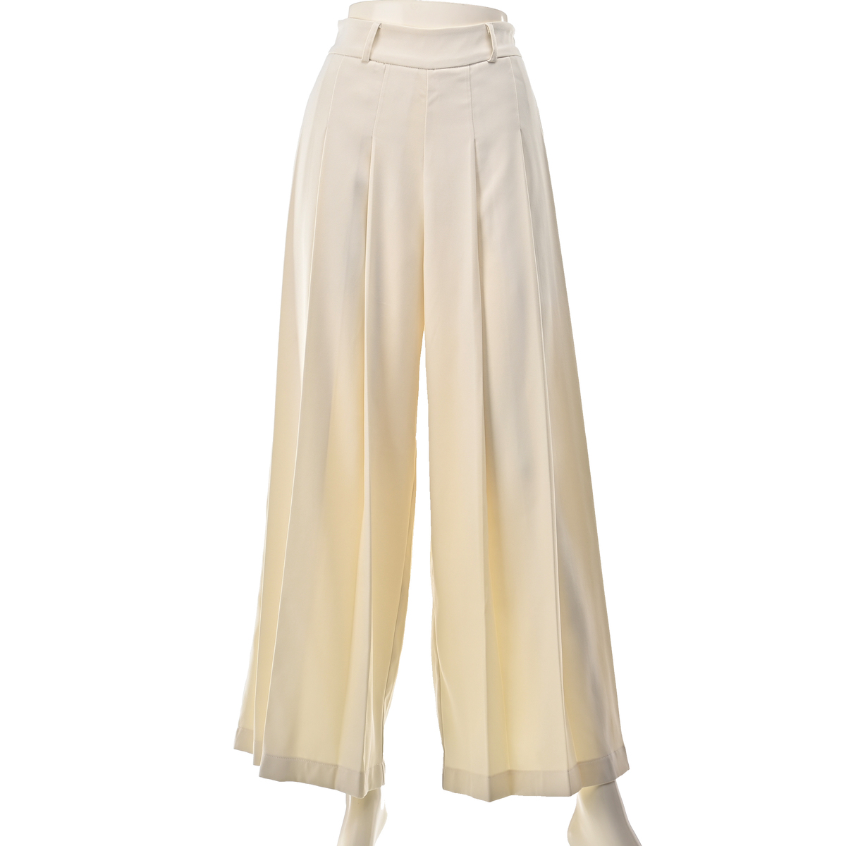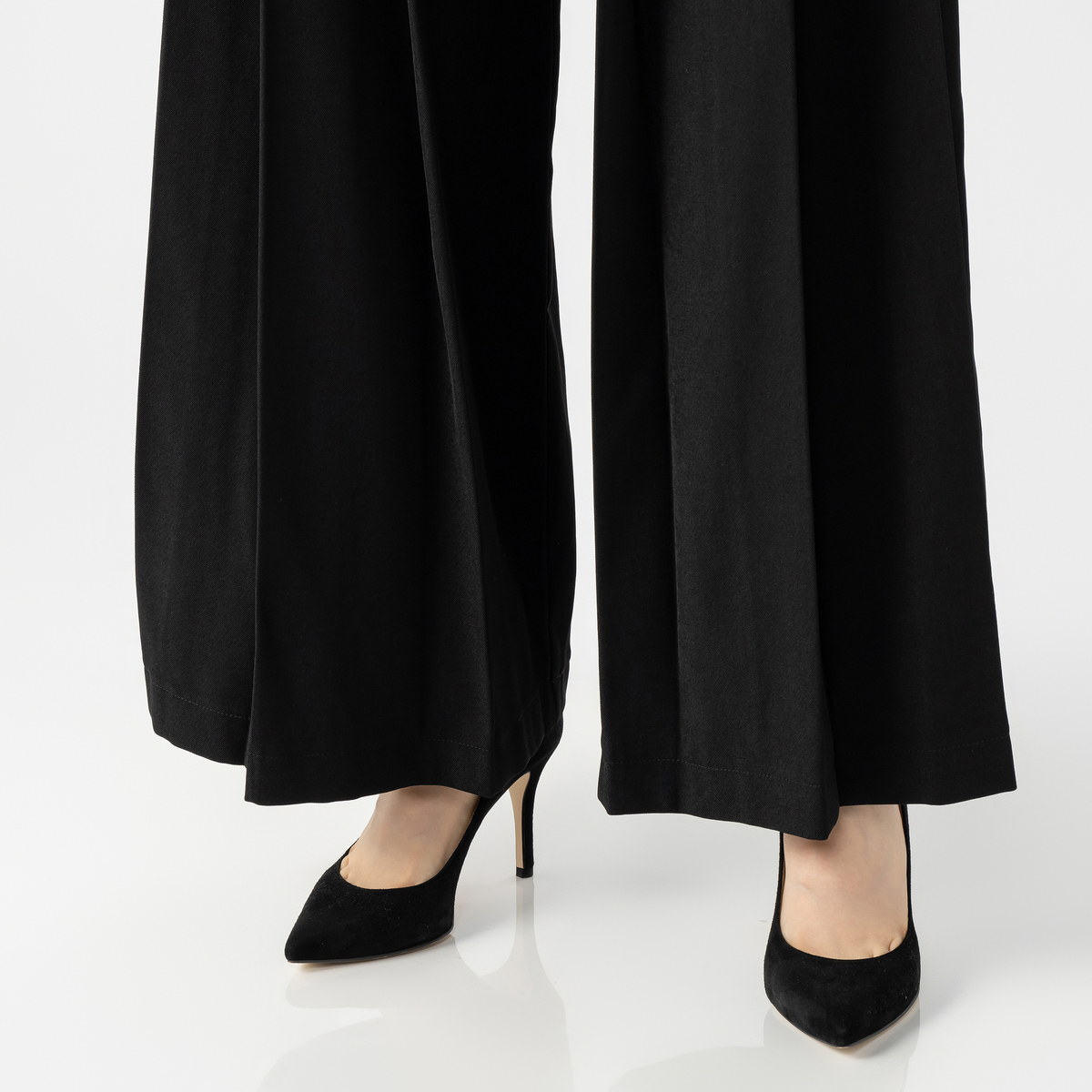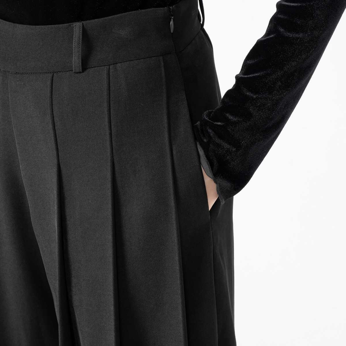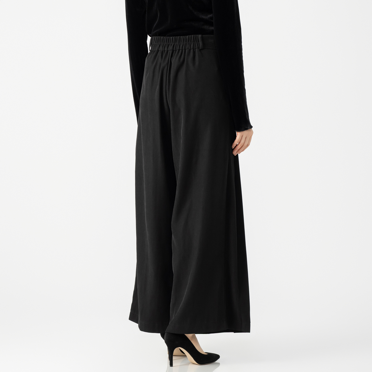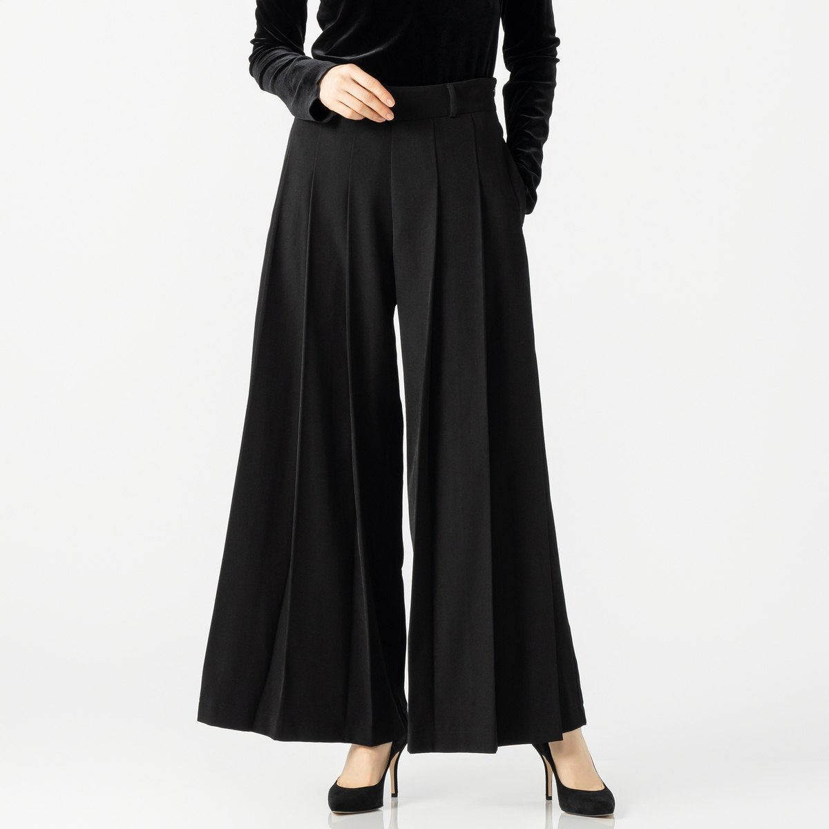 ワイドフレアのシルエットに深めのタックが入り、脚をすらりと見せるパンツです。落ち感のあるツイル素材が広がりすぎず、上品な印象に。ウエストは後ろ一部をゴム仕様にして、快適な穿き心地に仕上げました
