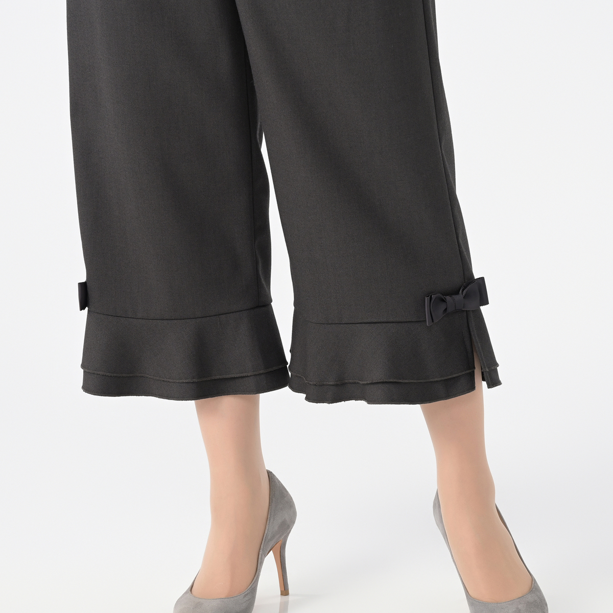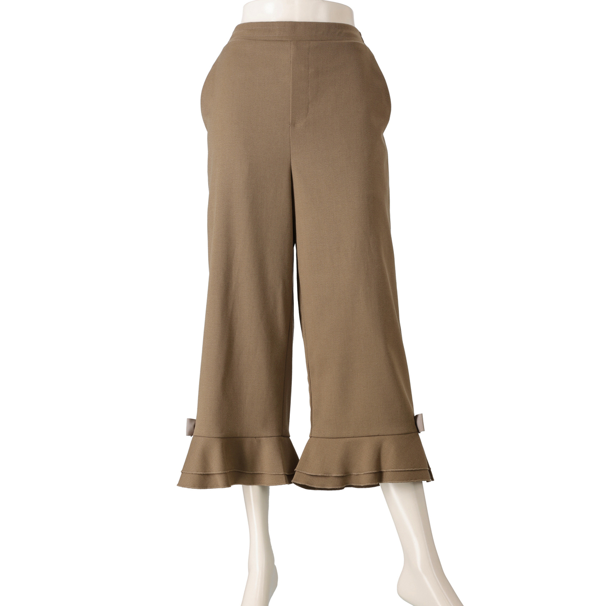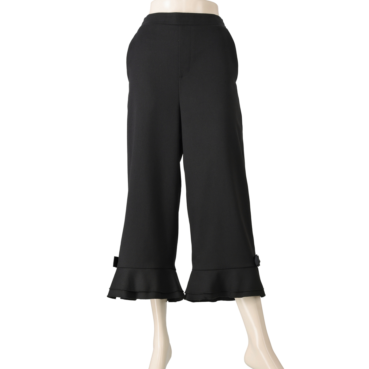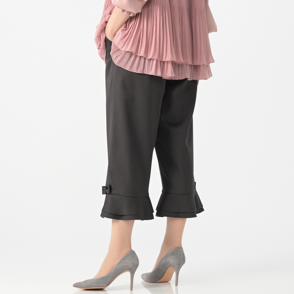 裾に2段のフリルを施したセミワイドパンツ。同系色で仕上げたリボンディテールが全体と調和し、甘すぎない大人の可愛らしさを演出します。フェミニンな要素を取り入れながらも、上品で洗練された印象で、前腰の左右には実用的なポケットが付いています