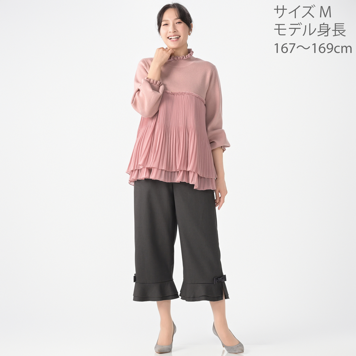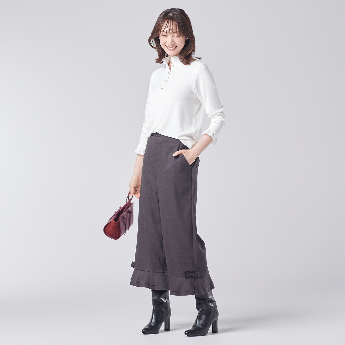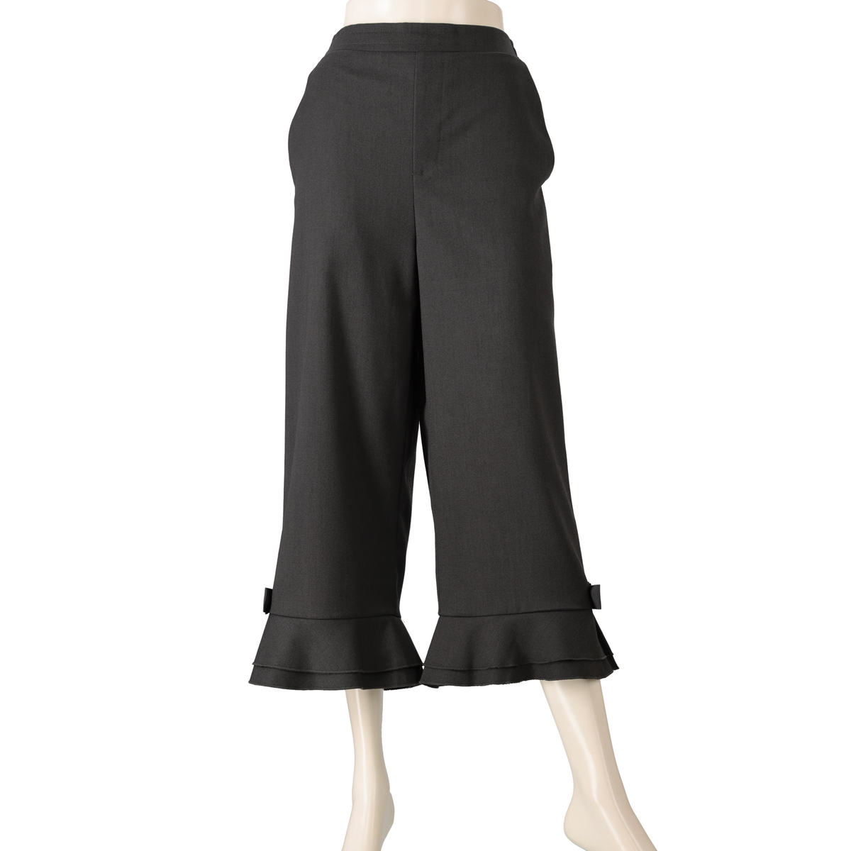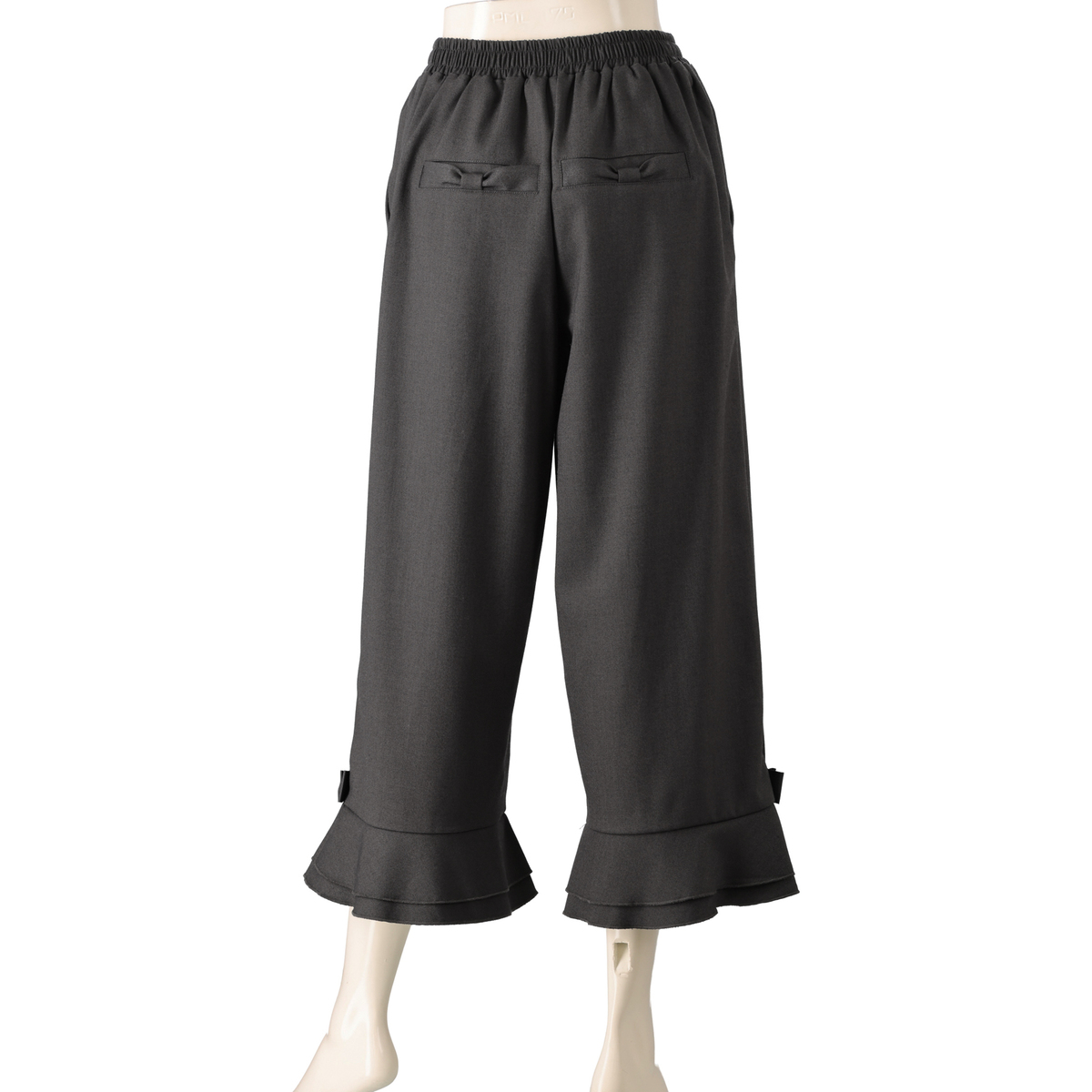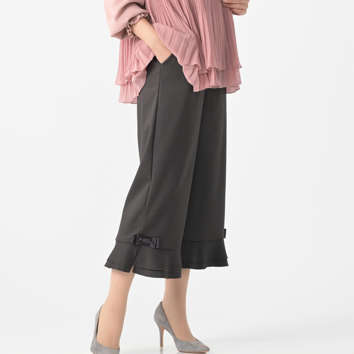 裾に2段のフリルを施したセミワイドパンツ。同系色で仕上げたリボンディテールが全体と調和し、甘すぎない大人の可愛らしさを演出します。フェミニンな要素を取り入れながらも、上品で洗練された印象で、前腰の左右には実用的なポケットが付いています