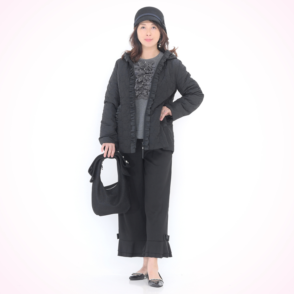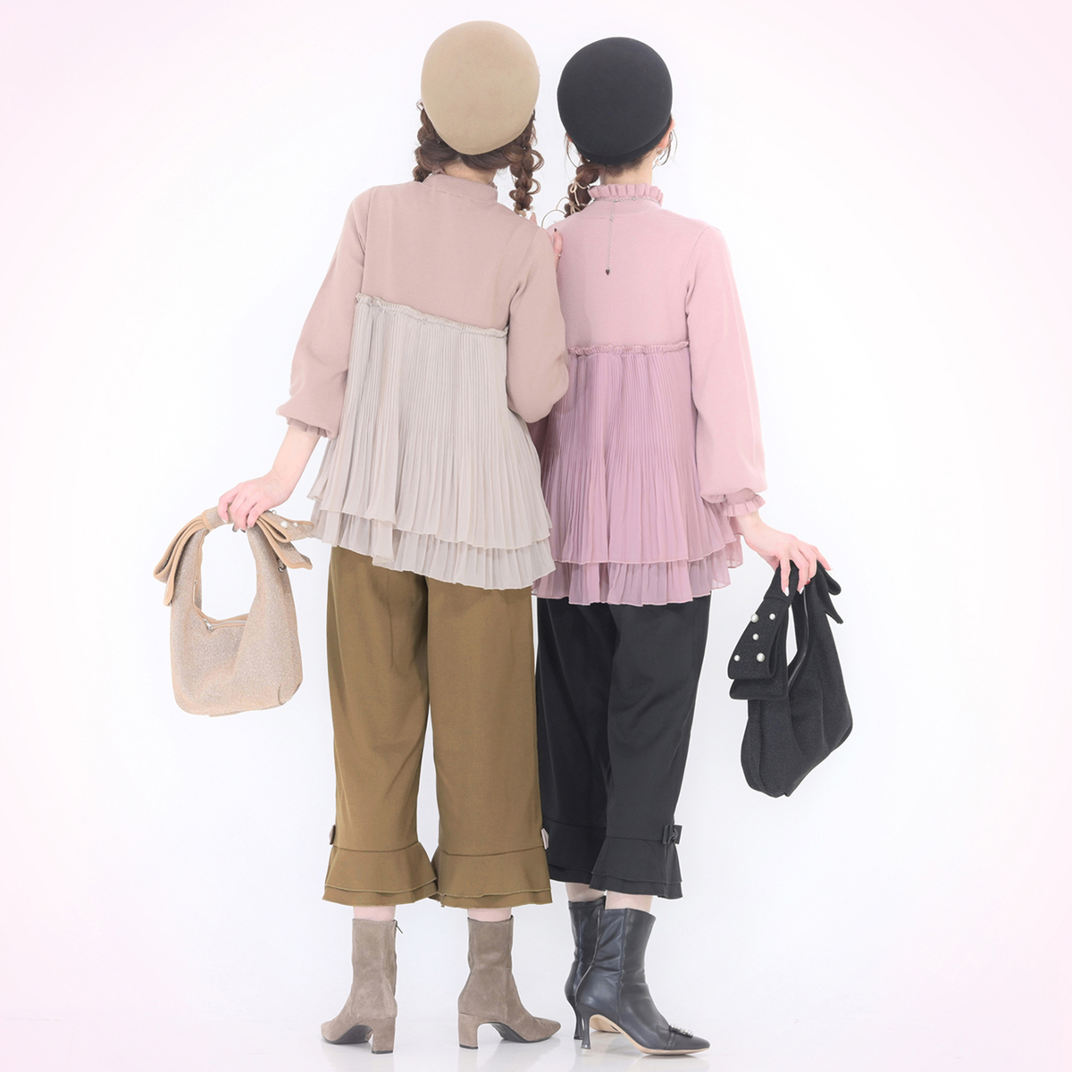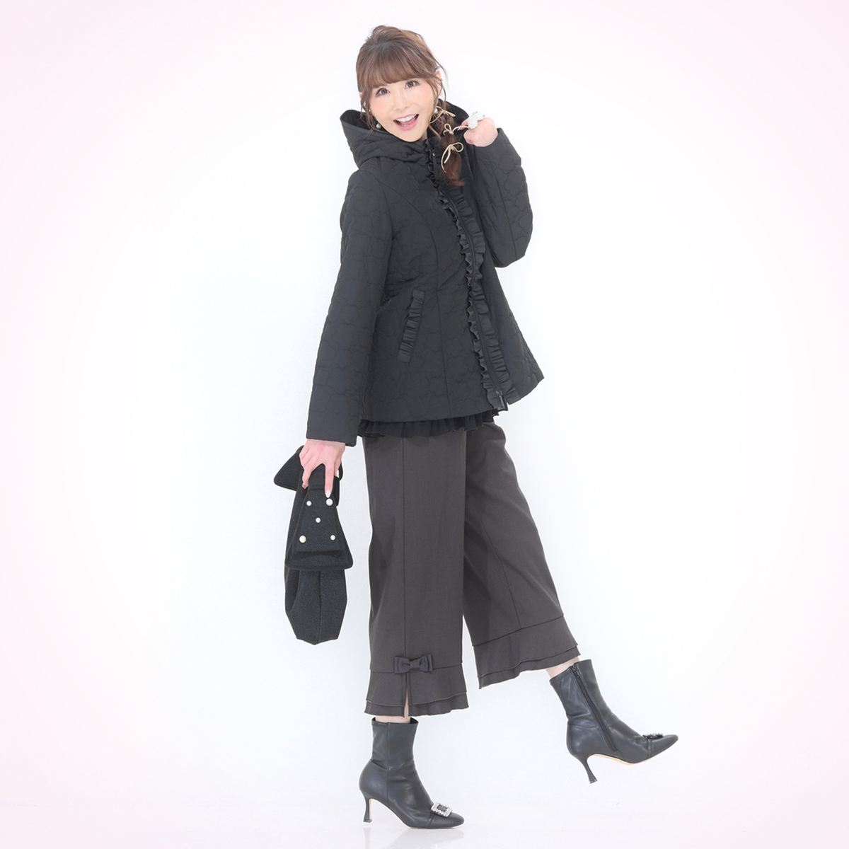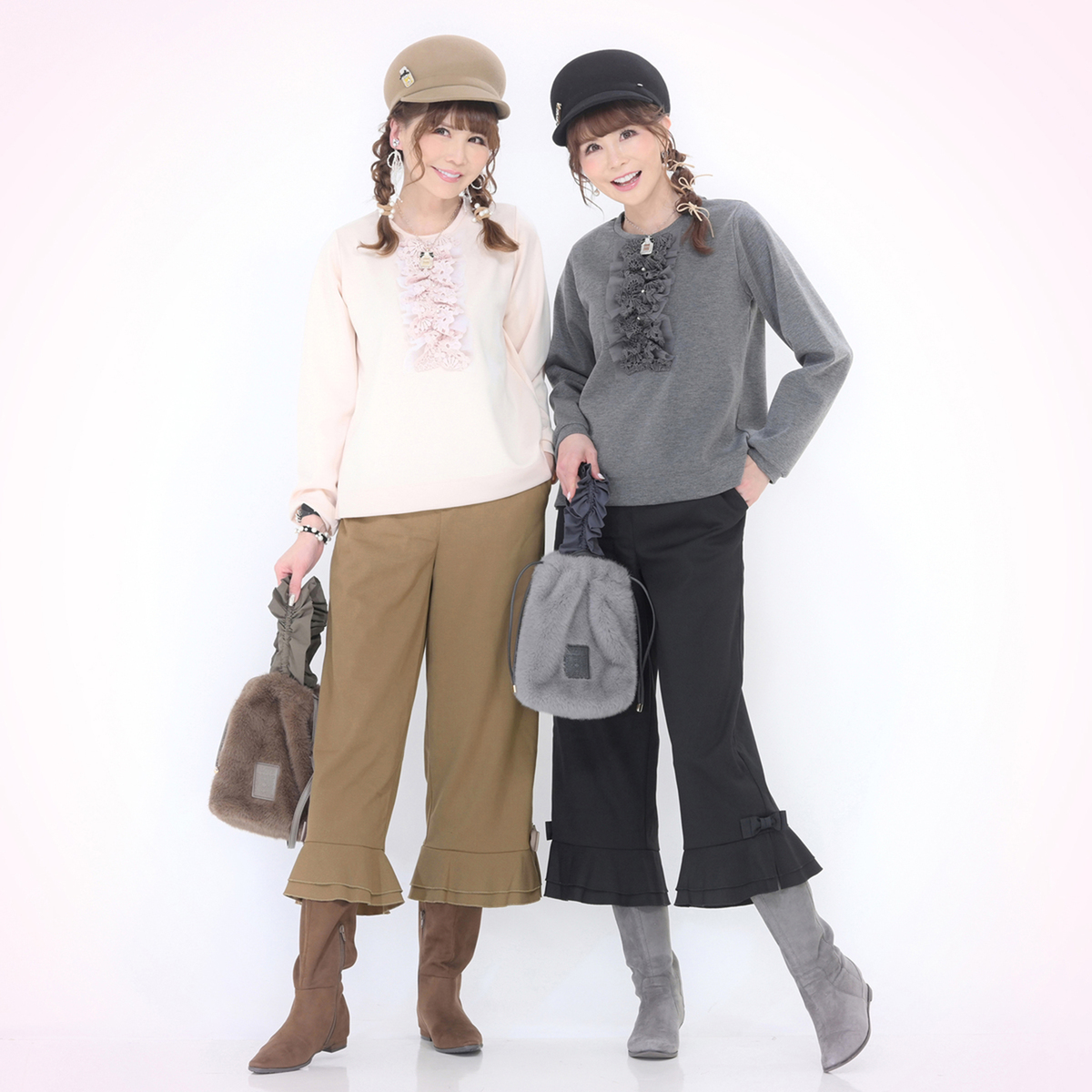 裾に2段のフリルを施したセミワイドパンツ。同系色で仕上げたリボンディテールが全体と調和し、甘すぎない大人の可愛らしさを演出します。フェミニンな要素を取り入れながらも、上品で洗練された印象で、前腰の左右には実用的なポケットが付いています