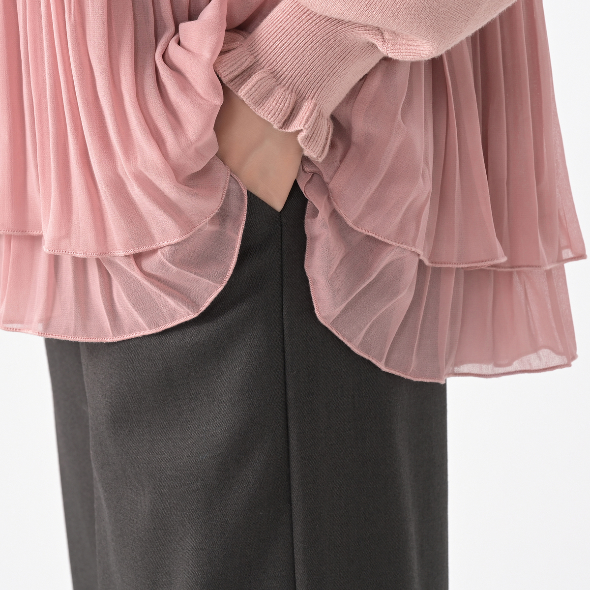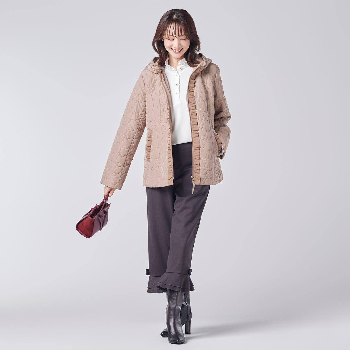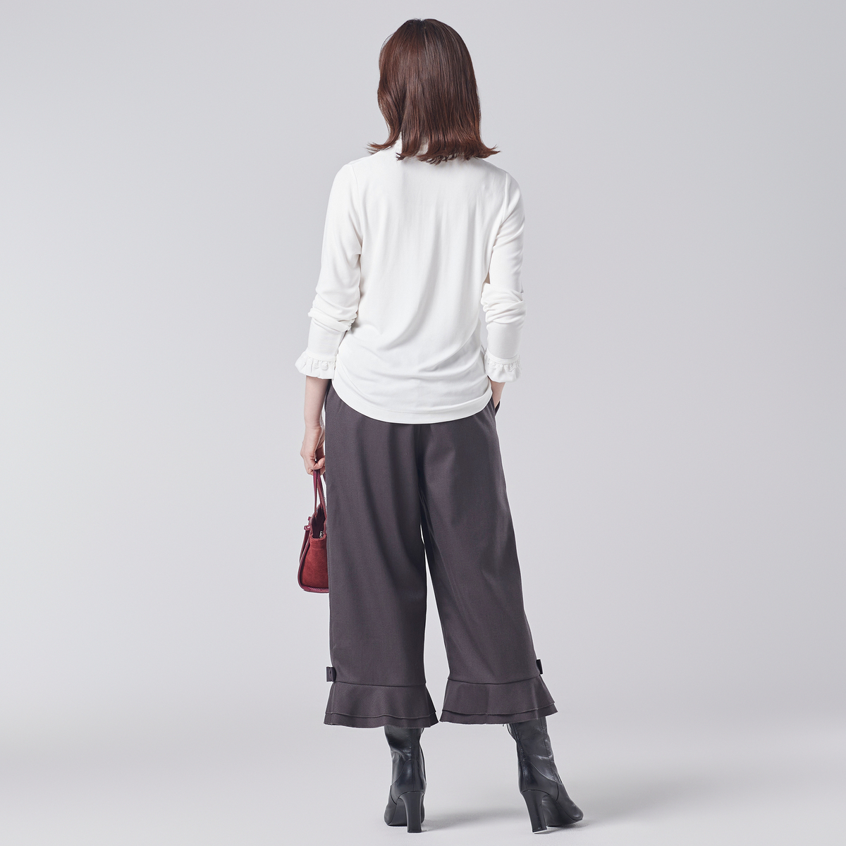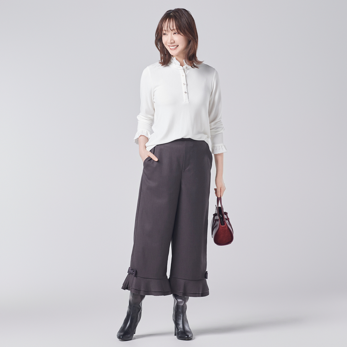 適度なハリのある布帛素材は、シルエットと裾のフリル部分に美しい立体感をプラス。暖かみのある生地感で、秋冬の装いにぴったりです。ワイドストレートのシルエットでヒップや太もも周りに程よいゆとりを持たせたことで、体型を拾いにくい設計に。ウエストはゴム仕様で、ストレスフリーな着心地です