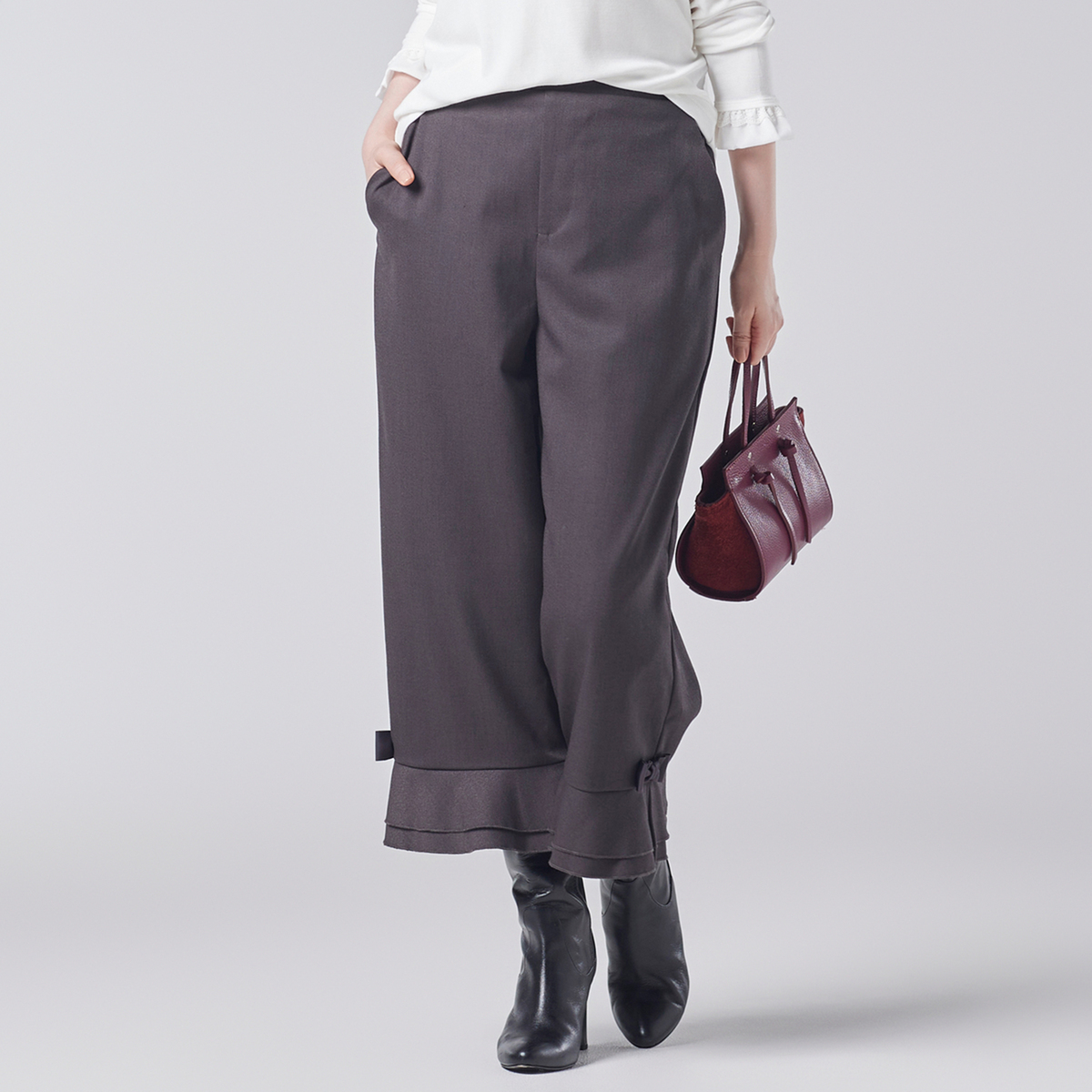 裾に2段のフリルを施したセミワイドパンツ。同系色で仕上げたリボンディテールが全体と調和し、甘すぎない大人の可愛らしさを演出します。フェミニンな要素を取り入れながらも、上品で洗練された印象で、前腰の左右には実用的なポケットが付いています