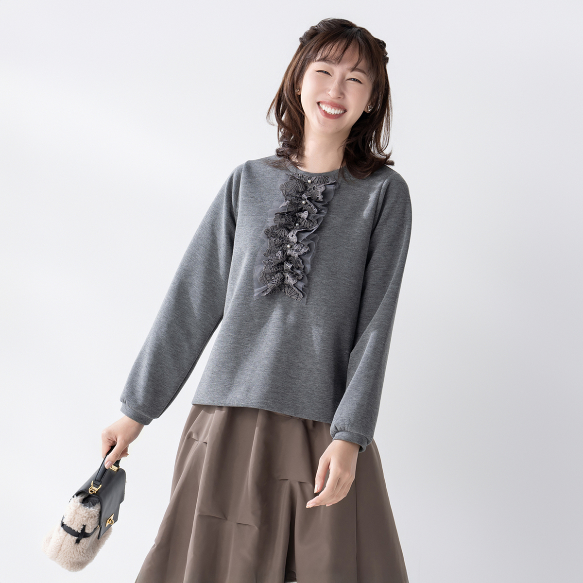 大人可愛いレースとチュールのフリルが印象的なトップス。前身頃のフリル中心にはパール調のビジューを散りばめ、控えめながらも上品な輝きがフェミニンな雰囲気に。ボックスシルエットが気になる部分を自然にカバーしてくれます
