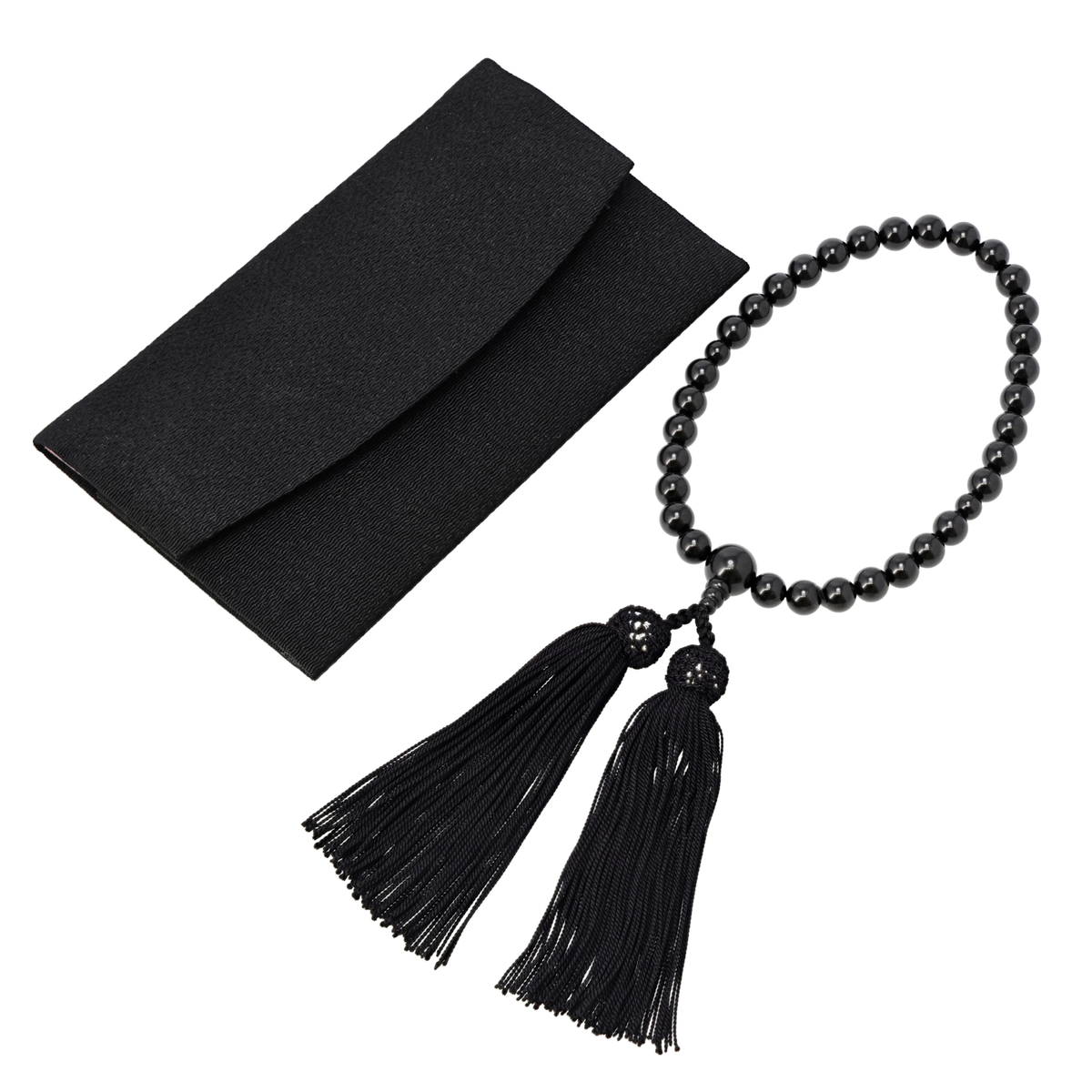 <念珠> [内周]約25cm [素材(約)] <ジェット> 主珠:8.0mm 合珠:6.0mm 親珠:12.0mm ボサ 房:正絹房 ■素材の大きさ・形・色合い、製品のサイズは1点1点多少異なります 【日本製】 <念珠袋> [サイズ(約)] 縦15.5×横15cm [重量(約)] 28g [素材] 表地:レーヨン100% 裏地:有 [仕様] [ポケット] 内ポケット×1 【日本製】