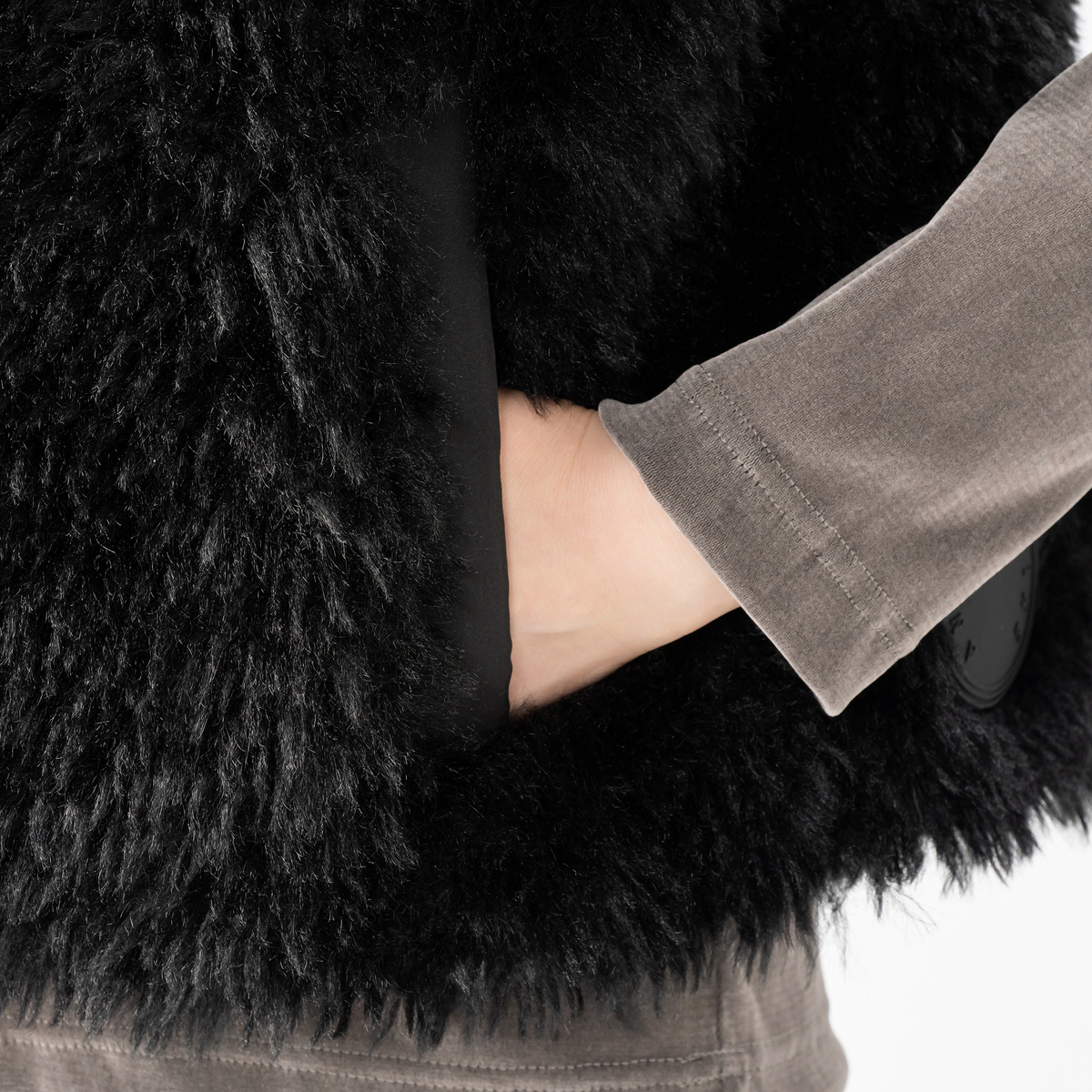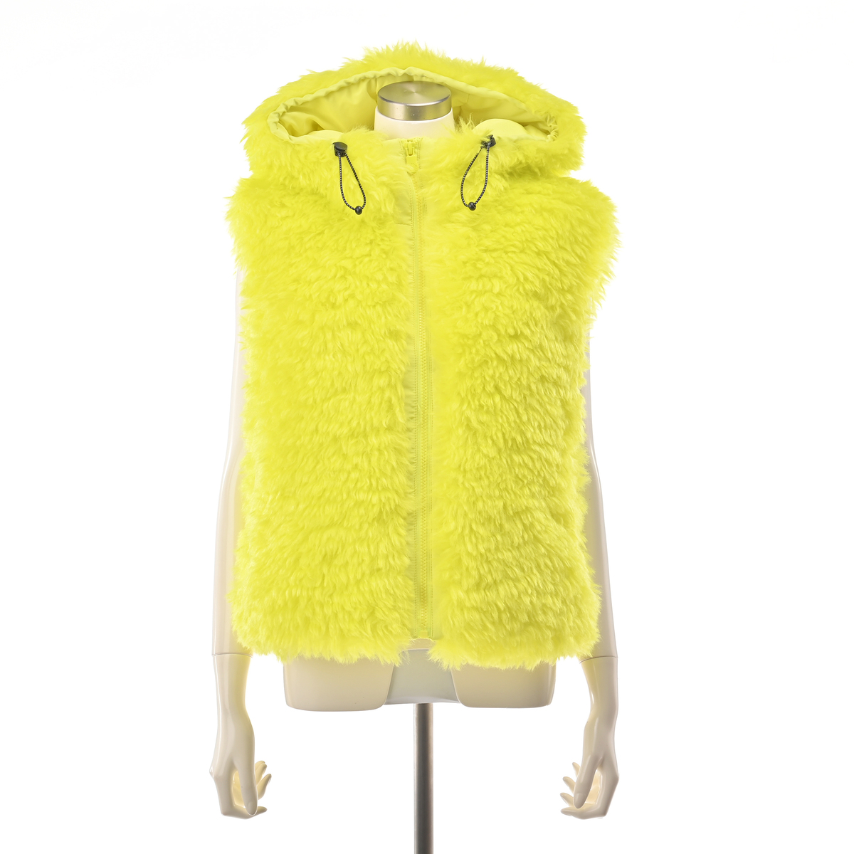 プードルのようなカール生地を使ったフーデッドベスト。裏地やポケット口には同色の別布を使い、オリジナルロゴ入りファスナー引手やシリコンワッペンがアクセントになっています