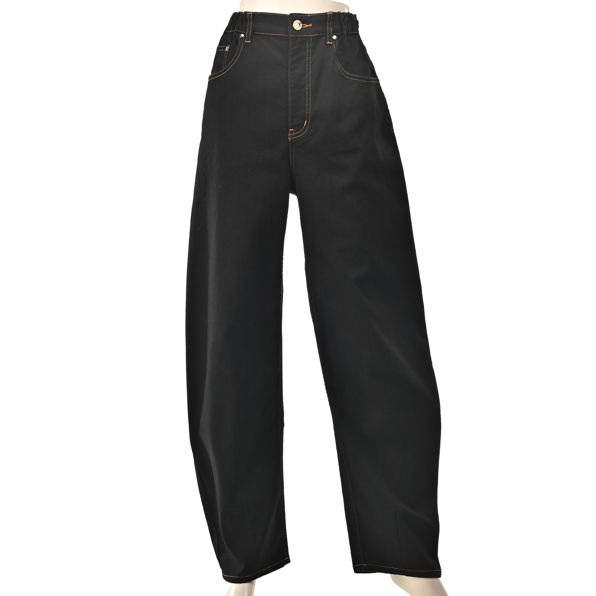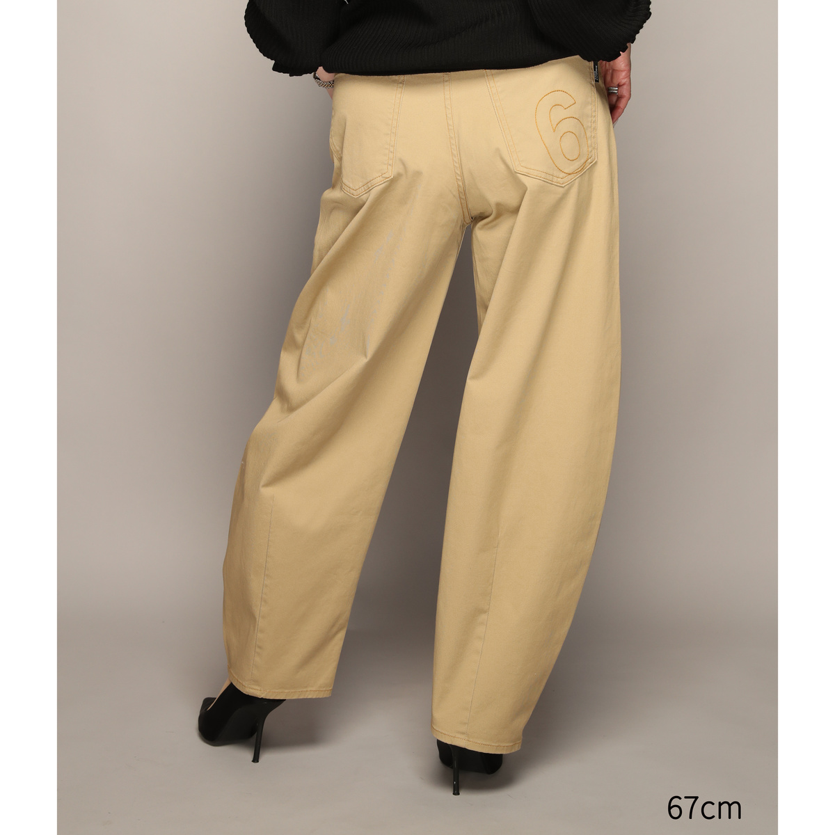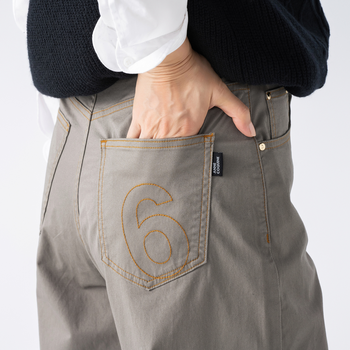 ダーツで立体的なフォルムを作り上げたバレルパンツ。オリジナルのタックボタンやリベット、右後ろポケットの6周年記念ロゴ刺繍がアクセントになっています